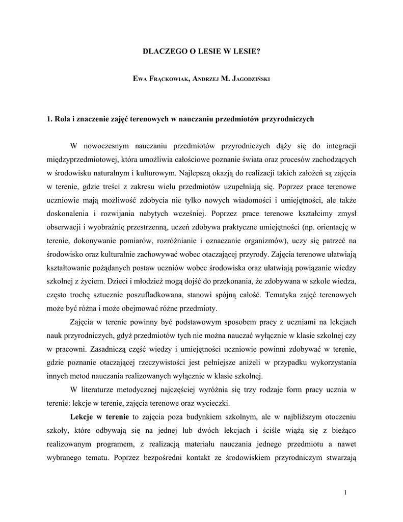 DLACZEGO O LESIE W LESIE? EWA FRĄCKOWIAK, ANDRZEJ M. JAGODZIŃSKI 1. Rola i znaczenie zajęć terenowych w nauczaniu przedmiotów przyrodniczych W nowoczesnym nauczaniu przedmiotów przyrodniczych dąży się do integracji międzyprzedmiotowej, która umożliwia całościowe poznanie świata oraz procesów zachodzących w środowisku naturalnym i kulturowym. Najlepszą okazją do realizacji takich założeń są zajęcia w terenie, gdzie treści z zakresu wielu przedmiotów uzupełniają się. Poprzez prace terenowe uczniowie mają możliwość zdobycia nie tylko nowych wiadomości i umiejętności, ale także doskonalenia i rozwijania nabytych wcześniej. Poprzez prace terenowe kształcimy zmysł obserwacji i wyobraźnię przestrzenną, uczeń zdobywa praktyczne umiejętności (np. orientację w terenie, dokonywanie pomiarów, rozróżnianie i oznaczanie organizmów), uczy się patrzeć na środowisko oraz kulturalnie zachowywać wobec otaczającej przyrody. Zajęcia terenowe ułatwiają kształtowanie pożądanych postaw uczniów wobec środowiska oraz ułatwiają powiązanie wiedzy szkolnej z życiem. Dzieci i młodzież mogą dojść do przekonania, że zdobywana w szkole wiedza, często trochę sztucznie poszufladkowana, stanowi spójną całość. Tematyka zajęć terenowych może być różna i może obejmować różne przedmioty. Zajęcia w terenie powinny być podstawowym sposobem pracy z uczniami na lekcjach nauk przyrodniczych, gdyż przedmiotów tych nie można nauczać wyłącznie w klasie szkolnej czy w pracowni. Zasadniczą część wiedzy i umiejętności uczniowie powinni zdobywać w terenie, gdzie poznanie otaczającej rzeczywistości jest pełniejsze aniżeli w przypadku wykorzystania innych metod nauczania realizowanych wyłącznie w klasie szkolnej. W literaturze metodycznej najczęściej wyróżnia się trzy rodzaje form pracy ucznia w terenie: lekcje w terenie, zajęcia terenowe oraz wycieczki. Lekcje w terenie to zajęcia poza budynkiem szkolnym, ale w najbliższym otoczeniu szkoły, które odbywają się na jednej lub dwóch lekcjach i ściśle wiążą się z bieżąco realizowanym programem, z realizacją materiału nauczania jednego przedmiotu a nawet wybranego tematu. Poprzez bezpośredni kontakt ze środowiskiem przyrodniczym stwarzają 1 okazję do egzemplifikacji procesów i praw, z którymi uczniowie spotykają się na danym poziomie kształcenia. Na lekcji w terenie uczeń uczy się patrzeć i dostrzegać, mierzyć i obliczać, porównywać i sprawdzać, porządkować i systematyzować wyniki. Niezwykle ważną cechą takich zajęć jest stworzenie sytuacji sprzyjającej samodzielności uczniów w praktycznym działaniu. Dzięki lekcjom w terenie uczniowie mają możliwość konfrontowania wyników swoich obserwacji z materiałami zawartymi w podręczniku, innych źródłach wiedzy oraz z wiedzą przekazywaną przez nauczyciela. Zajęcia terenowe to zajęcia trwające dłuższy czas, najczęściej całodniowe, pozwalające dotrzeć do dalszego terenu. Podczas nich uczniowie zdobywają wiele informacji, przeprowadzają liczne obserwacje o charakterze kompleksowym. Głównym celem zajęć terenowych jest kształcenie lub doskonalenie umiejętności oraz dochodzenie do uogólnionej wiedzy. Zajęcia terenowe powinno się realizować na wszystkich poziomach nauczania, stosując zasadę stopniowania trudności. Proces poznania powinien być oparty na bezpośredniej obserwacji i na pomiarach powiązanych z czynnościami myślowymi uczniów, takimi jak analiza, synteza, wnioskowanie, wyjaśnianie oraz uogólnianie dokonanych spostrzeżeń. Osiągnięcie zamierzonych rezultatów takich zajęć możliwe jest pod warunkiem wykonania starannie zaplanowanych czynności. Wycieczka szkolna – podstawowym celem wycieczek szkolnych jest poznawanie środowiska w ujęciu krajoznawczym (E. Świtalski), a więc powinny mieć charakter wieloprzedmiotowy. W trakcie prowadzenia wycieczki nie można pomijać bez odpowiedniej informacji obiektów stanowiących przedmiot zainteresowania różnych przedmiotów szkolnych. Nie powinno się organizować wycieczek „specjalistycznych”, tzn. historycznych, biologicznych czy geograficznych. W programie wycieczki należy więc uwzględnić potrzeby i wymagania wszystkich przedmiotów. Wycieczki winny być organizowane zgodnie z zasadą od tego, co bliższe, do tego, co dalsze i od tego, co znane, do tego, co nieznane. Planowanie wycieczki odbywa się dużo wcześniej i jest to kompleksowe, wszechstronne wykorzystanie terenu, które pozytywnie wpływa na zintegrowanie wiedzy ze wszystkich przedmiotów. 2. Etapy planowania zajęć terenowych Prawidłowo przeprowadzone zajęcia terenowe to takie, do których nauczyciele i uczniowie przystępują świadomie. Zajęcia obejmują zagadnienia dydaktyczno – wychowawcze i 2 organizacyjne oraz składają się z kilku etapów. W pracach tych bierze udział zarówno nauczyciel jak i uczniowie, często do pomocy włączeni są inni nauczyciele oraz rodzice. Planowanie zajęć terenowych obejmuje następujące etapy: Pierwszy etap – przygotowanie do pracy w terenie: a) zapoznanie się z przepisami prawnymi dotyczącymi organizacji zajęć terenowych; b) wyznaczenie celu zajęć!!! c) dobór i opracowanie trasy; d) wskazanie środków dydaktycznych; e) wskazanie czynności uczniów i opracowanie zadań; f) zaplanowanie i zamówienie usług turystycznych; g) preliminarz wydatków. Drugi etap – realizacja w terenie: a) wykonanie wskazanych lub wspólnie zaprojektowanych działań; b) udokumentowanie przebiegu i wyników obserwacji – szkice, rysunki, wywiady, notatki, pomiary itp. Trzeci etap – podsumowanie: a) omówienie wyników obserwacji – wymiana spostrzeżeń; b) weryfikacja rozwiązań. Czwarty etap – wykorzystanie zebranych materiałów (okazy naturalne, wyniki pomiarów) w dalszej pracy dydaktycznej w szkole. 3. Obawy nauczycieli związane z zajęciami terenowymi Opracowanie i pr