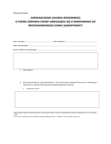 (Pieczęć Poradni) ZAŚWIADCZENIE LEKARZA RODZINNEGO O STANIE ZDROWIA OSOBY UBIEGAJĄCEJ SIĘ O SKIEROWANIE DO ŚRODOWISKOWEGO DOMU SAMOPOMOCY Imię i nazwisko ……………………………………………………….. data urodzenia ……………………………………………………………….. Adres: Bielsko-Biała ……………………………………………………………………………………………………………………………………………. Numer telefonu kontaktowego: …………………………………………………………………………………………………………………………. 1. Stan zdrowia 2. Brak przeciwwskazań / przeciwwskazania * do uczestnictwa w zajęciach Domu wraz z informacją o sprawności w zakresie lokomocji osób niepełnosprawnych fizycznie. niepotrzebne skreślić Rozporządzenie Ministra Polityki Społecznej z dnia 9 grudnia 2010r. w sprawie środowiskowych domów samopomocy ( Dz. U. Nr 238. poz. 1586) Art. 51a ust. 5 ustawy z dnia 12.03.2004r. 0 pomocy społecznej ( Dz. U. z 2009r. Nr 175, poz. 1362 z późn. zm.)