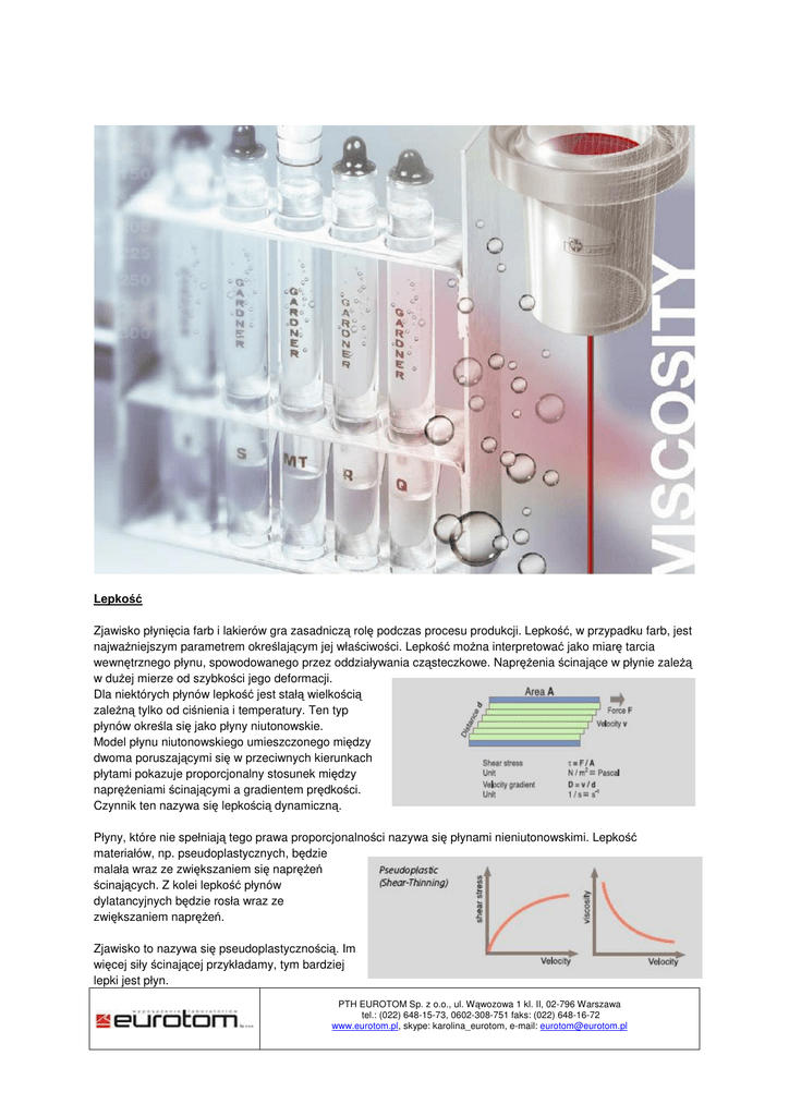 Lepkość Zjawisko płynięcia farb i lakierów gra zasadniczą rolę podczas procesu produkcji. Lepkość, w przypadku farb, jest najważniejszym parametrem określającym jej właściwości. Lepkość można interpretować jako miarę tarcia wewnętrznego płynu, spowodowanego przez oddziaływania cząsteczkowe. Naprężenia ścinające w płynie zależą w dużej mierze od szybkości jego deformacji. Dla niektórych płynów lepkość jest stałą wielkością zależną tylko od ciśnienia i temperatury. Ten typ płynów określa się jako płyny niutonowskie. Model płynu niutonowskiego umieszczonego między dwoma poruszającymi się w przeciwnych kierunkach płytami pokazuje proporcjonalny stosunek między naprężeniami ścinającymi a gradientem prędkości. Czynnik ten nazywa się lepkością dynamiczną. Płyny, które nie spełniają tego prawa proporcjonalności nazywa się płynami nieniutonowskimi. Lepkość materiałów, np. pseudoplastycznych, będzie malała wraz ze zwiększaniem się naprężeń ścinających. Z kolei lepkość płynów dylatancyjnych będzie rosła wraz ze zwiększaniem naprężeń. Zjawisko to nazywa się pseudoplastycznością. Im więcej siły ścinającej przykładamy, tym bardziej lepki jest płyn. PTH EUROTOM Sp. z o.o., ul. Wąwozowa 1 kl. II, 02-796 Warszawa tel.: (022) 648-15-73, 0602-308-751 faks: (022) 648-16-72 www.eurotom.pl, skype: karolina_eurotom, e-mail: [email protected] Tiksotropią, nazywamy zjawisko zmiany lepkości wraz z czasem mieszania. Jeśli płyn jest mieszany ze stałą prędkością to lepkość będzie powoli wzrastała. Wraz z zaprzestaniem mieszania, lepkość będzie powracała do początkowej swojej wartości. W przemyśle farbiarskim istnieje wiele metod pozwalających określić lepkość płynu, od prostych kubków przepływowych do skomplikowanych, sterowanych komputerowo wiskozymetrów obrotowych. BYK-Gardner oferuje urządzenia do szybkiego i łatwego określenia lepkości. Wiskozymetry bąbelkowe Metoda bezpośredniego pomiaru czasu określa czas, jaki jest potrzebny jest pęcherzykowi powietrza na przemierzenie znanej odległości w rurce wypełnionej badaną cieczą. Czas ten może być potem przeliczony na jednostkę lepkości, w tym przypadku stokes. Metoda pomiaru alfabetycznego używa 4 zestawów rurek pomiarowych oznaczonych literami alfabetu, od A5 do Z10, w których umieszczone są płyny o znanych wartościach lepkości. Porównując czas przepływu pęcherzyka w rurce pomiarowej określamy lepkość płynu. Płyny znajdujące się w rurkach porównawczych pokrywają zakres lepkości od 0.005 to 1000 stokesów. Obie metody są wrażliwe na zmiany następujących parametrów: Błąd temperatury: 1° C = 10 % błędu Błąd przechylenia: 5° odchyłu od pionu = 10 % błędu I.D. rurki: 0.1 mm = 2% błędu Kubki wypływowe Podczas produkcji farb często nie jest potrzebna znajomość wartości liczbowej lepkości. W niektórych przypadkach wystarczy szacunkowa wartość lepkości w odniesieniu do innego płynu. Czas wypływu mierzony w sekundach okazał się bardzo praktyczną wielkością. Określa się go używając kubków wypływowych skonstruowanych według międzynarodowych/krajowych norm. Kubki mieszczą określoną objętość płynu, który wypływa przez kryzę. Powtarzalność takiego pomiaru zależy od: dokładnej znajomości wielkości kubka stałej temperatury podczas pomiaru właściwości płynu (płyny niutonowskie) Kubki zanurzeniowe Zanurzeniowe kubki czerpalne służą do szybkiego i dokładnego pomiaru czasu wypływu materiałów malarskich i podobnych im cieczy, zarówno podczas produkcji, jak i w laboratorium. PTH EUROTOM Sp. z o.o., ul. Wąwozowa 1 kl. II, 02-796 Warszawa tel.: (022) 648-15-73, 0602-308-751 faks: (022) 648-16-72 www.eurotom.pl, skype: karolina_eurotom, e-mail: [email protected]