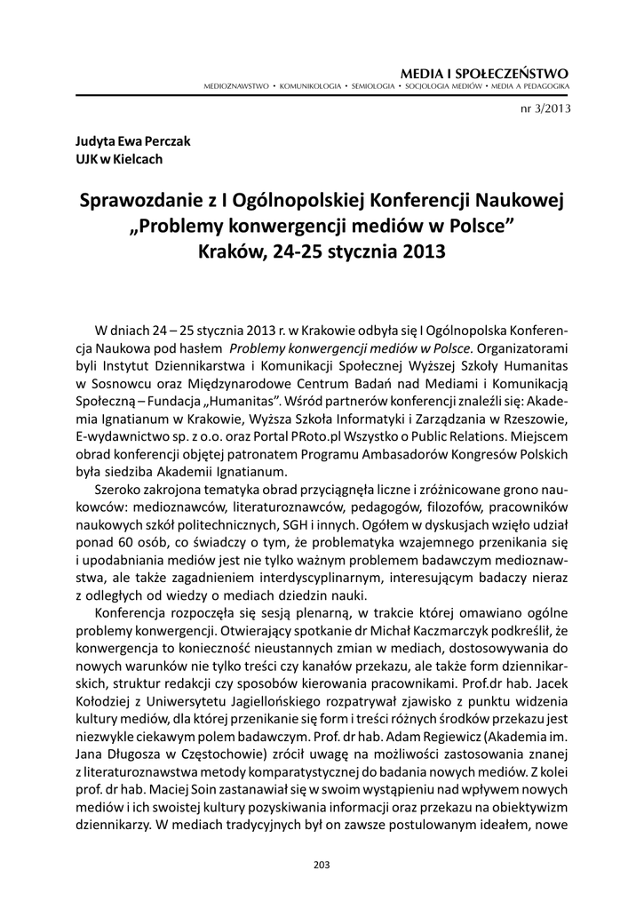 MEDIOZNAWSTWO . KOMUNIKOLOGIA . MEDIA I SPOŁECZEŃSTWO SEMIOLOGIA . SOCJOLOGIA MEDIÓW . MEDIA A PEDAGOGIKA nr 3/2013 Judyta Ewa Perczak UJK w Kielcach Sprawozdanie z I Ogólnopolskiej Konferencji Naukowej „Problemy konwergencji mediów w Polsce” Kraków, 24-25 stycznia 2013 W dniach 24 – 25 stycznia 2013 r. w Krakowie odbyła się I Ogólnopolska Konferencja Naukowa pod hasłem Problemy konwergencji mediów w Polsce. Organizatorami byli Instytut Dziennikarstwa i Komunikacji Społecznej Wyższej Szkoły Humanitas w Sosnowcu oraz Międzynarodowe Centrum Badań nad Mediami i Komunikacją Społeczną – Fundacja „Humanitas”. Wśród partnerów konferencji znaleźli się: Akademia Ignatianum w Krakowie, Wyższa Szkoła Informatyki i Zarządzania w Rzeszowie, E-wydawnictwo sp. z o.o. oraz Portal PRoto.pl Wszystko o Public Relations. Miejscem obrad konferencji objętej patronatem Programu Ambasadorów Kongresów Polskich była siedziba Akademii Ignatianum. Szeroko zakrojona tematyka obrad przyciągnęła liczne i zróżnicowane grono naukowców: medioznawców, literaturoznawców, pedagogów, filozofów, pracowników naukowych szkół politechnicznych, SGH i innych. Ogółem w dyskusjach wzięło udział ponad 60 osób, co świadczy o tym, że problematyka wzajemnego przenikania się i upodabniania mediów jest nie tylko ważnym problemem badawczym medioznawstwa, ale także zagadnieniem interdyscyplinarnym, interesującym badaczy nieraz z odległych od wiedzy o mediach dziedzin nauki. Konferencja rozpoczęła się sesją plenarną, w trakcie której omawiano ogólne problemy konwergencji. Otwierający spotkanie dr Michał Kaczmarczyk podkreślił, że konwergencja to konieczność nieustannych zmian w mediach, dostosowywania do nowych warunków nie tylko treści czy kanałów przekazu, ale także form dziennikarskich, struktur redakcji czy sposobów kierowania pracownikami. Prof.dr hab. Jacek Kołodziej z Uniwersytetu Jagiellońskiego rozpatrywał zjawisko z punktu widzenia kultury mediów, dla której przenikanie się form i treści różnych środków przekazu jest niezwykle ciekawym polem badawczym. Prof. dr hab. Adam Regiewicz (Akademia im. Jana Długosza w Częstochowie) zrócił uwagę na możliwości zastosowania znanej z literaturoznawstwa metody komparatystycznej do badania nowych mediów. Z kolei prof. dr hab. Maciej Soin zastanawiał się w swoim wystąpieniu nad wpływem nowych mediów i ich swoistej kultury pozyskiwania informacji oraz przekazu na obiektywizm dziennikarzy. W mediach tradycyjnych był on zawsze postulowanym ideałem, nowe 203 Judyta Ewa Perczak media jednak przewartościowują wiele istniejących dotąd poglądów na temat dziennikarzy i ich pracy. Sesję plenarną zamknął prof. dr hab. Wojciech Furman, omawiając zagadnienie niezwykle poruszające środowiska medialne i opinię publiczną w ubiegłym roku – sprawę podpisania przez Polskę umowy ACTA. Ten akt prawny miał niezwykle istotne znaczenie nie tylko dla mediów stricte elektronicznych, ale także dla tych, które do sieci przeniosły część swojej działalności. Oprócz sesji plenarnej odbyło się 10 sesji panelowych. Pierwszego dnia obradowano w panelach: 1. Konwergencja mediów – konteksty genologiczne (I) pod przewodnictwem prof. dr hab. Adama Regiewicza; 2. Konwergencja mediów – konteksty genologiczne (II) pod przewodnictwem dr Pawła Sarny; 3. Komunikowanie publiczne w kulturze konwergencji (I), pod przewodnictwem prof. dr hab. Wojciecha Furmana; 4. Cyfrowy odbiorca – procesy konwergencji a publiczność medialna, pod przewodnictwem prof. dr hab. Krystyny Doktorowicz. Pierwszy dzień obrad zakończył się uroczystą kolacją w siedzibie Akademii Ignatianum. Drugiego dnia odbyło się sześć kolejnych paneli: 1. Nowe media we współczesnym społeczeństwie – prowadzący dr Mirosław Lakomy; 2. Konwergencja a logika systemu medialnego (I) – prowadzący prof. dr hab. Andrzej Nowosad; 3. Konwergencja a logika systemu medialnego (II) – prowadzący prof. dr hab. Marian Gierula; 4. Konwergencja mediów a profesja dziennikarska – prowadząca dr Bogusława Bodzioch – Bryła; 5. Komunikowanie publiczne w kulturze konwergencji (II) – prowadzący prof. dr hab. Dariusz Rott; 6. Konwergencja mediów – konteksty technologiczne – prowadząca dr Małgorzata Koszemba – Wiklik. W panelu Konwergencja a logika systemu medialnego (II), którym pokierował prof. dr hab. Marian Gierula, wzięło udział siedmioro dyskutantów. Dr Jan Beliczyński (Uniwersytet Ekonomiczny w Krakowie) poruszył kwestię stosunkowo najrzadziej omawianego na konferencji medium – radia. Tematem jego wystąpienia była Zdolność rozwojowa radia w warunkach konwergencji medialnej. Referat miał na celu prezentację dotychczasowych osiągnięć omawianego medium w dziedzinie konwergencji i pokazanie nowych kierunków i szans rozwoju. Dr Jolanta Dzierżyńska – Mielczarek (Uniwersytet Jana Kochanowskiego w Kielcach) w wystąpieniu Konwergencja korporacyjna w polskim systemie medialnym poruszyła zjawisko konwergencji jako łączenia różnych typów mediów w ramach 204 Sprawozdanie z I Ogólnopolskiej Konferencji Naukowej „Problemy konwergencji mediów w Polsce” jednej firmy – koncernu medialnego. Na przykładach koncernu Agora i imperium medialnego Zygmunta Solorza – Żaka, dr Dzierżyńska scharakteryzowała sposoby powiększania stanu posiadania mediów i konsekwencje takich działań dla samych środków przekazu oraz dla ich odbiorców. Z kolei dr Bartłomiej Knosala (Politechnika Śląska) zastanawiał się nad kierunkami rozwoju i łączenia się (technicznego, treściowego, osobowego) mediów z filozoficznego punktu widzenia. Zastanawiał się m. in., czy klasycy medioznawstwa, w tym Marshall McLuhan trafnie zdiagnozowali owe kierunki i czy ich teorie mają dziś jeszcze zastosowanie. Dr Judyta Ewa Perczak (Uniwersytet Jana Kochanowskiego w Kielcach) przedstawiła temat Abrakadabr