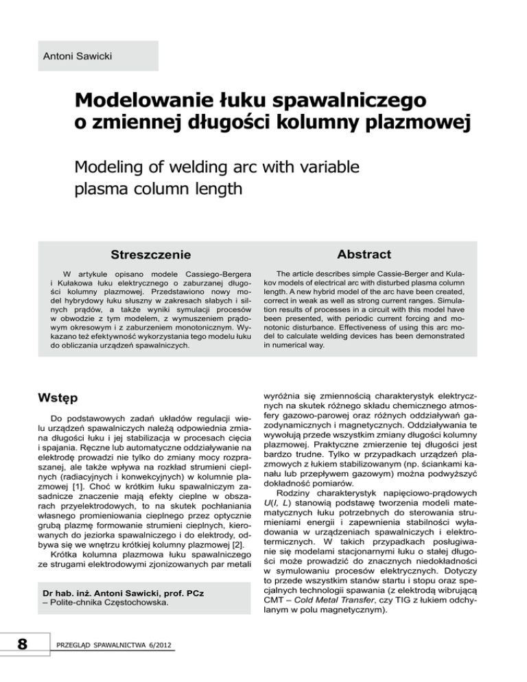 Antoni Sawicki Modelowanie łuku spawalniczego o zmiennej długości kolumny plazmowej Modeling of welding arc with variable plasma column length Streszczenie Abstract W artykule opisano modele Cassiego-Bergera i Kułakowa łuku elektrycznego o zaburzanej długości kolumny plazmowej. Przedstawiono nowy model hybrydowy łuku słuszny w zakresach słabych i silnych prądów, a także wyniki symulacji procesów w obwodzie z tym modelem, z wymuszeniem prądowym okresowym i z zaburzeniem monotonicznym. Wykazano też efektywność wykorzystania tego modelu łuku do obliczania urządzeń spawalniczych. The article describes simple Cassie-Berger and Kulakov models of electrical arc with disturbed plasma column length. A new hybrid model of the arc have been created, correct in weak as well as strong current ranges. Simulation results of processes in a circuit with this model have been presented, with periodic current forcing and monotonic disturbance. Effectiveness of using this arc model to calculate welding devices has been demonstrated in numerical way. Wstęp Do podstawowych zadań układów regulacji wielu urządzeń spawalniczych należą odpowiednia zmiana długości łuku i jej stabilizacja w procesach cięcia i spajania. Ręczne lub automatyczne oddziaływanie na elektrodę prowadzi nie tylko do zmiany mocy rozpraszanej, ale także wpływa na rozkład strumieni cieplnych (radiacyjnych i konwekcyjnych) w kolumnie plazmowej [1]. Choć w krótkim łuku spawalniczym zasadnicze znaczenie mają efekty cieplne w obszarach przyelektrodowych, to na skutek pochłaniania własnego promieniowania cieplnego przez optycznie grubą plazmę formowanie strumieni cieplnych, kierowanych do jeziorka spawalniczego i do elektrody, odbywa się we wnętrzu krótkiej kolumny plazmowej [2]. Krótka kolumna plazmowa łuku spawalniczego ze strugami elektrodowymi zjonizowanych par metali Drhab.inż.AntoniSawicki,prof.PCz – Polite-chnika Częstochowska. 8 Przegląd sPawalnictwa 6/2012 wyróżnia się zmiennością charakterystyk elektrycznych na skutek różnego składu chemicznego atmosfery gazowo-parowej oraz różnych oddziaływań gazodynamicznych i magnetycznych. Oddziaływania te wywołują przede wszystkim zmiany długości kolumny plazmowej. Praktyczne zmierzenie tej długości jest bardzo trudne. Tylko w przypadkach urządzeń plazmowych z łukiem stabilizowanym (np. ściankami kanału lub przepływem gazowym) można podwyższyć dokładność pomiarów. Rodziny charakterystyk napięciowo-prądowych U(I, L) stanowią podstawę tworzenia modeli matematycznych łuku potrzebnych do sterowania strumieniami energii i zapewnienia stabilności wyładowania w urządzeniach spawalniczych i elektrotermicznych. W takich przypadkach posługiwanie się modelami stacjonarnymi łuku o stałej długości może prowadzić do znacznych niedokładności w symulowaniu procesów elektrycznych. Dotyczy to przede wszystkim stanów startu i stopu oraz specjalnych technologii spawania (z elektrodą wibrującą CMT – Cold Metal Transfer, czy TIG z łukiem odchylanym w polu magnetycznym). Modelełukuelektrycznego ozmiennejdługości kolumnyplazmowej Z kolei dodatkowa moc pv(dl/dt) jest określona zależnością [4]: (4) Od początku ubiegłego wieku podejmowano liczne próby analitycznego opisu wpływu zmian długości łuku na jego charakterystyki elektryczne statyczne [3]. Najbardziej ogólną zależność podał Nottingham: Zmodyfikowane równania Cassiego-Bergera łuku rozciąganego i skracanego przyjmują więc postać konduktancyjną: (1) (5) gdzie: A, B, C, D, n – współczynniki i wykładnik aproksymacji określane na podstawie danych eksperymentalnych. Szczególne przypadki tego wzoru uzyskali Ayrton, Steinmetz, Browne i inni. Jak z niego widać, składnik napięcia łuku, który nie zależy ani od prądu, ani od długości kolumny, to suma przyelektrodowych spadków napięcia. Zależy ona od rodzaju materiału, kształtu i stanu cieplnego elektrod (zwłaszcza katody), ciśnienia i składu chemicznego środowiska gazowego. Wrażliwość charakterystyk statycznych na zmiany długości kolumny prowadzi do utworzenia rodziny charakterystyk dynamicznych napięciowo-prądowych. Ich opis jest jednak bardziej złożony ze względu na inercję procesów cieplnych, wynikających nie tylko ze zmian prądu, ale także z przebudowy kolumny. Jeśli zmiany długości łuku są niewielkie lub odbywają się z małą prędkością, to wtedy dla wygody obliczeń i w zgodzie z oczekiwaną dokładnością aproksymacji często wykorzystuje się modele Cassiego i Mayra, przyjmując ich parametry jako wielkości stałe. W przypadkach dużych względnych zmian długości łuku lub dużej prędkości wydłużania lub skracania kolumny założenia te mogą prowadzić do znacznych błędów modelowania i symulowania. Modyfikację równania Cassiego, uwzględniającą zmiany długości łuku, podał Berger [4]. Jego równanie ma postać konduktancyjną: (2) gdzie: θCB – stała czasowa modelu. Ponieważ napięcie na łuku rośnie wraz ze wzrostem długości kolumny, to w [4] zaproponowano następujące podejście do określania składnika kwadratu napięcia modelu Cassiego-Bergera: (3) ale jeśli nie działają inne dodatkowe czynniki formujące przemiany energii plazmy, to w większości przypadków modelowania obwodów z łukiem o zaburzanej długości (także skracanym) można przyjąć b2 = 0. Równanie Cassiego daje najlepsze rezultaty w zakresie silnych prądów wyładowania. Taką samą właściwość ma równanie Cassiego-Bergera. Nie może ono wystarczająco dokładnie odwzorowywać procesów w łuku o słabym prądzie, zwłaszcza w okolicach przejść prądu przez wartość zerową. Kułakow zaproponował modyfikację znanego modelu łuku, wykorzystującego charakterystykę statyczną napięciowo-prądową [5]. Ten zmodyfikowany model I rzędu, uwzględniający zmiany długości kolumny, zapisany w postaci konduktancyjnej jest nast