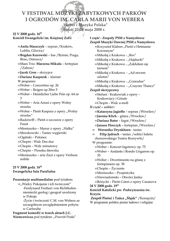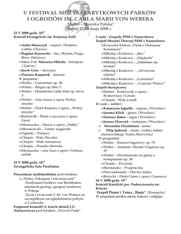 V FESTIWAL MUZYKI ZABYTKOWYCH PARKÓW I OGRODÓW IM. CARLA MARII VON WEBERA „Weber i Muzyka Polska” Pokój 22-24 maja 2008 r. 00 22 V 2008 godz. 16 Kościół Ewangelicki im. Księżnej Zofii • Anita Maszczyk – sopran /Kraków, Lublin, Gliwice/ • Bogdan Kurowski – bas /Bytom, Praga, Brno, Ostrawa/ • Maes Trio: Marzena Mikuła – fortepian /Zabrze/ • Jacek Gros – skrzypce • Dariusz Kasperek – klarnet W programie: • Weber – Concertino op. 26 • Weber – Reigen op.30nr 5 • Weber – Heimlicher Liebe Pein op. 64 nr 3 • Weber – Aria Anusi z opery Wolny strzelec • Weber – Pieśń Kaspara z opery „Wolny strzelec“ • Radziwiłł – Pieśń o szczurze z opery Faust • Moniuszko – Mazur z opery „Halka” • Moszkowski – Taniec węgierski • Ogiński – Polonez • Chopin - Walc Des-dur • Chopin – Walc minutowy • Chopin – Piosnka litewska • Moniuszko – aria Zuzi z opery Verbum nobile 23 V 2008 godz. 1600 Ewangelicka Sala Parafialna Prezentacje multimedialne pod tytułem: • „Wielcy Pokojanie i ich twórczość” -Ferdynand Freiherr von Richthofenniemiecki geolog i geograf urodzony w Pokoju -Życie i twórczość C.M. von Webera ze szczególnym uwzględnieniem pobytu w Carlsruhe Fragment komedii w trzech aktach J.U. Niemcewicza pod tytułem: „Powrót Posła” I część - Zespoły PSM z Namysłowa: Zespół Muzyki Dawnej PSM z Namysłowa • Krzysztof Klabon „Pieśń o Hetmanie Koronnym” • Mikołaj z Krakowa - ,,Rex” • Mikołaj z Krakowa - ,,Hajducki” • Mikołaj z Krakowa - ,,Zakłułam się tarnem” • Mikołaj z Krakowa - ,,Ad novem salutus” • Mikołaj z Krakowa - ,,Conradus” • Mikołaj z Krakowa - ,,Czayner Thancz” Zespół skrzypcowy • Stefani - Krakowiak z opery – Krakowiacy i Górale • Chopin - Walc a-moll II część – soliści : • Katarzyna Jagiełło – sopran /Wrocław/ • Jarema Klich – gitara /Wrocław/ • Dariusz Bator – fagot /Wrocław/ • Janusz Florczyk – fortepian /Wrocław/ • Weronika Drynkhorn - taniec • Filip Jędruch – taniec /soliści baletu chorzowskiego Teatru Rozrywki/ W programie: • Weber – Koncert fagotowy op. 75 • Weber – Andante i Rondo Ungarese op. 35 • Weber – Divertimento na gitarę z fortepianem op. 38 • Chopin – Życzenie • Moniuszko – Prząśniczka • Niewiadomski – Otwórz Janku • Różycki – Pieśń Caton z opery Casanova 24 V 2008 godz. 1915 Kościół Katolicki pw. Podwyższenia św. Krzyża Zespół Pieśni i Tańca „Śląsk“ /Koszęcin/ W programie polskie pieśni ludowe i religijne