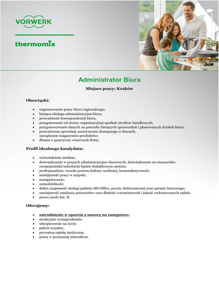 Administrator Biura Miejsce pracy: Kraków Obowiązki: organizowanie pracy biura regionalnego; bieżąca obsługa administracyjna biura; prowadzenie korespondencji biura; przygotowanie od strony organizacyjnej spotkań struktur handlowych; przygotowywanie danych na potrzeby bieżących sprawozdań i planowanych działań biura; prowadzenie sprzedaży asortymentu dostępnego w biurach; zarządzanie magazynem produktów; dbanie o pozytywny wizerunek firmy. Profil idealnego kandydata: wykształcenie średnie; doświadczenie w pracach administracyjno-biurowych, doświadczenie na stanowisku recepcjonistki/sekretarki będzie dodatkowym atutem; profesjonalizm, wysoki poziom kultury osobistej, komunikatywność; umiejętność pracy w zespole; zaangażowanie; samodzielność; dobra znajomość obsługi pakietu MS Office, poczty elektronicznej oraz sprzętu biurowego; umiejętność ustalania priorytetów oraz dbałość o terminowość i jakość wykonywanych zadań; prawo jazdy kat. B. Oferujemy: zatrudnienie w oparciu o umowę na zastępstwo; atrakcyjne wynagrodzenie; ubezpieczenie na życie; pakiet socjalny; prywatną opiekę medyczną; pracę w przyjaznej atmosferze.