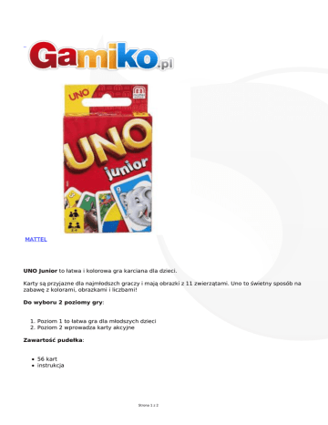 MATTEL UNO Junior to łatwa i kolorowa gra karciana dla dzieci. Karty są przyjazne dla najmłodszch graczy i mają obrazki z 11 zwierzątami. Uno to świetny sposób na zabawę z kolorami, obrazkami i liczbami! Do wyboru 2 poziomy gry: 1. Poziom 1 to łatwa gra dla młodszych dzieci 2. Poziom 2 wprowadza karty akcyjne Zawartość pudełka: 56 kart instrukcja Strona 1 z 2 Wiek 3+ Liczba graczy 2-4 Producent MATTEL Strona 2 z 2