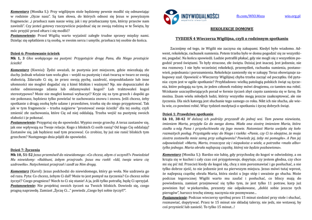 Komentarz (Monika S.): Przy wigilijnym stole będziemy pewnie modlić się odmawiając w rodzinie „Ojcze nasz”. Są tam słowa, do których odnosi się Jezus w powyższym fragmencie: „i przebacz nam nasze winy, jak i my przebaczamy tym, którzy przeciw nam zawinili”. Czy jesteś gotowy rzeczywiście pojednać się ze swoją rodziną w te Święta, by móc przyjść przed ołtarz i się modlić? Postanowienie: Przed Wigilią warto wyjaśnić zaległe trudne sprawy między nami. Dzieląc się opłatkiem z tą osobą, w swoim sercu i umyśle, przebacz tej osobie do końca. Dzień 6: Prostowanie ścieżek Mk 1, 3 Głos wołającego na pustyni: Przygotujcie drogę Panu, dla Niego prostujcie ścieżki! Komentarz (Ksenia): Żydzi uważali, że pustynia jest miejscem, gdzie mieszkają złe duchy. Jednak właśnie tam woła głos – wejdź na pustynię i stań twarzą w twarz ze swoją słabością. Zdarzało Ci się, że przez swoją pychę, zazdrość, niepoukładanie lub inne ułomności nie mogłeś dogadać się z kimś bliskim i ważnym? Np. nie dopuszczałeś do siebie odmiennego zdania lub okłamywałeś kogoś? Lub traktowałeś kogoś stereotypowo? Może nie mogłeś komuś wybaczyć? Kryje się za tym grzech i dopóki go nie pokonasz, będziesz tylko powielać te zachowania znowu i znowu. Jeśli chcesz, żeby spotkanie z drugą osobą było udane i prawdziwe, trzeba się do niego przygotować. Tak jak w tym fragmencie – trzeba najpierw “prostować swoje ścieżki” dla tej osoby, czyli zmienić złe zachowania, które Cię od niej oddalają. Trzeba wejść na pustynię swoich słabości i je pokonać. Postanowienie: Przygotuj się do spowiedzi. Wypisz swoje grzechy. A teraz zastanów się, jak one wpływają na Twoje relacje. Kogo z bliskich Ci osób ranią? Od kogo Cię oddalają? Zastanów się, jak będziesz nad tym pracować. Co zrobisz, by już nie ranić bliskich tym grzechem? Następnego dnia pójdź do spowiedzi. Dzień 7: Życzenia Mk 10, 51-52 Jezus przemówił do niewidomego: «Co chcesz, abym ci uczynił?» Powiedział Mu niewidomy: «Rabbuni, żebym przejrzał». Jezus mu rzekł: «Idź, twoja wiara cię uzdrowiła». Natychmiast przejrzał i szedł za Nim drogą. Komentarz (Karol): Jezus podchodzi do niewidomego, który go woła. Nie uzdrawia go od razu. Pyta: Co chcesz, żebym Ci dał? Może to jest pomysł na życzenia? Co chcesz sobie życzyć? Czego pragniesz? Niech to Ci się stanie! A ja, jeśli tylko potrafię, będę Ci sprzyjał. Postanowienie: Nie projektuj swoich życzeń na Twoich bliskich. Dowiedz się, czego pragną naprawdę. Zamiast „Życzę Ci…” powiedz „Czego byś sobie życzył?”. fb.com/WIO.Msza wio.org.pl REKOLEKCJE DOMOWE TYDZIEŃ 4 Wieczerza Wigilijna, czyli o rodzinnym spotkaniu Zacznijmy od tego, że Wigilii nie zaczyna się zakupami. Kiedyś było wiadomo. Adwent, rekolekcje, rachunek sumienia. Potem trzeba było w domu pogodzić się ze wszystkimi, pogadać. Na końcu spowiedź. Ludzie potrafili płakać, gdy nie mogli się z wszystkim pogodzić przed świętami. To były stracone, złe święta. Dzisiaj jest inaczej. Jest jedzenie, nie ma rozmowy. I nie było wcześniej rekolekcji, przemyśleń, rachunku sumienia, postanowień, pojednania i porozumienia. Rekolekcje zamieniły się w zakupy. Teraz obowiązuje zakupowy szał. Opowieść o Wieczerzy Wigilijnej chyba trzeba zacząć od początku. Od pytania: czym jest w ogóle spotkanie? Przykładowo: wielką patologią polskich świąt są życzenia, które polegają na tym, że jeden członek rodziny mówi drugiemu, co tamten ma robić. Wciskanie uszczęśliwiających porad w formie życzeń zbyt często zamienia się w farsę. Ile można. Znam wielu młodych ludzi, którzy wszystko mogą jeszcze zaakceptować, ale nie życzenia. Dla nich katorgą jest słuchanie tego samego co roku. Nikt ich nie słucha, ale wielu wie, co powinni robić. Więc tydzień medytacji o spotkaniu i życzę dobrych świąt. Dzień 1: Prawdziwe spotkanie Łk 10, 38-42 W dalszej ich podróży przyszedł do jednej wsi. Tam pewna niewiasta, imieniem Marta, przyjęła Go do swego domu. Miała ona siostrę imieniem Maria, która siadła u nóg Pana i przysłuchiwała się Jego mowie. Natomiast Marta uwijała się koło rozmaitych posług. Przystąpiła więc do Niego i rzekła: «Panie, czy Ci to obojętne, że moja siostra zostawiła mnie samą przy usługiwaniu? Powiedz jej, żeby mi pomogła». A Pan jej odpowiedział: «Marto, Marto, troszczysz się i niepokoisz o wiele, a potrzeba <mało albo> tylko jednego. Maria obrała najlepszą cząstkę, której nie będzie pozbawiona». Komentarz (Monika S.): Bardzo nie lubię, gdy przychodzę do kogoś w odwiedziny, a on krząta się w kuchni i cały czas coś przygotowuje, dopytuje, czy jestem głodna, czy chce mi się pić itd. Przecież kiedy do kogoś idę, chcę z nim porozmawiać i go posłuchać, a nie tylko dobrze zjeść, to nie jedzenie jest na pierwszym miejscu. Jezus mówi tutaj wprost, że najlepszą cząstkę obrała Maria, która siedzi u Jego stóp i uważnie go słucha. Może podczas tegorocznej Wigilii warto mu zaufać i posłuchać, co bliscy mają do powiedzenia, zamiast przejmować się tylko tym, że jest tylko 11 potraw, karp już powinien być w piekarniku, prezenty nie odpakowane, „dołóż sobie jeszcze tych pierogów”, barszcz trochę zimny, naczynia nie pozmywane... Postanowienie: Podczas wieczerzy spróbuj przez 15 minut siedzieć przy stole i słuchać, rozmawiać, dopytywać. Przez te 15 minut nie składaj talerzy, nie jedz, nie wstawaj, by coś przynieść lub zanieść. To tylko 15 minut...! Dzień 2: Postawa otwartości J 1, 14 A Słowo stało się ciałem i zamieszkało wśród nas. Komentarz (Magda): Kiedyś z zazdrością słuchałam opowieści przyjaciół jak wygląda Wigilia w ich domach. Dla mnie najczęściej było to bardzo trudne spotkanie. Rodzice zwykle znajdowali jakiś powód, by się pokłócić – a t