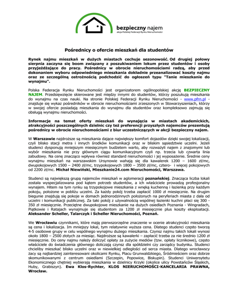 Pośrednicy o ofercie mieszkań dla studentów Rynek najmu mieszkań w dużych miastach cechuje sezonowość. Od drugiej połowy sierpnia zaczyna się boom związany z poszukiwaniem lokum przez studentów i osoby przyjeżdżające do pracy. Pośrednicy w obrocie nieruchomościami radzą, aby przed dokonaniem wyboru odpowiedniego mieszkania dokładnie przeanalizować koszty najmu oraz ze szczególną ostrożnością podchodzić do ogłoszeń typu "Tanie mieszkanie do wynajmu". Polska Federacja Rynku Nieruchomości jest organizatorem ogólnopolskiej akcję BEZPIECZNY NAJEM. Przedsięwzięcie skierowane jest między innymi do studentów, którzy poszukują mieszkania do wynajmu na czas nauki. Na stronie Polskiej Federacji Rynku Nieruchomości - www.pfrn.pl znajduje się wykaz pośredników w obrocie nieruchomościami zrzeszonych w Stowarzyszeniach, którzy w swojej ofercie posiadają mieszkania do wynajmu dla studentów oraz kompleksowo zajmują się obsługą wynajmu nieruchomości. Informacje na temat oferty mieszkań do wynajęcia w miastach akademickich, atrakcyjności poszczególnych dzielnic czy też preferencji przyszłych najemców prezentują pośrednicy w obrocie nieruchomościami z biur uczestniczących w akcji bezpieczny najem. W Warszawie najdroższe są mieszkania dające największy komfort dojazdów dzięki swojej lokalizacji, czyli blisko stacji metra i innych środków komunikacji oraz w bliskim sąsiedztwie uczelni. Jeżeli studenci dysponują mniejszym miesięcznym budżetem warto, aby rozważyli najem z znajomymi lub wybór mieszkania nie przy głównym ciągu komunikacyjnym czyli np. trzecia lub czwarta linia zabudowy. Na cenę znacząco wpływa również standard nieruchomości i jej wyposażenie. Średnie ceny wynajmu mieszkań na warszawskim Ursynowie wahają się dla kawalerek 1200 – 1600 zł/mc, dwupokojowych 1500 – 2400 zł/mc, trzypokojowych 1800 – 3500 zł/mc, cztero- i więcej pokojowych od 2200 zł/mc. Michał Niewiński, Mieszkanie24.com Nieruchomości, Warszawa. Studenci są największą grupą najemców mieszkań w aglomeracji poznańskiej. Znacząca liczba lokali została wyspecjalizowana pod kątem potrzeb studentów, a ich właściciele prowadzą profesjonalny wynajem. Hitem na tym rynku są trzypokojowe mieszkania z wnęką kuchenną i łazienką przy każdym pokoju, położone w pobliżu uczelni. Za każdy pokój trzeba zapłacić 1000 zł miesięcznie. Na drugim biegunie znajdują się pokoje w domach jednorodzinnych położonych na peryferiach miasta z dala od uczelni i komunikacji publicznej. Za taki pokój z używalnością wspólnej łazienki kuchni płaci się 300 350 zł miesięcznie. Przeciętne dwupokojowe mieszkanie na dużych osiedlach Poznania - Wingradach, Piątkowie i Ratajach wynajmuje się studentom za 1200 zł miesięcznie plus koszty eksploatacji. Aleksander Scheller, Talarczyk i Scheller Nieruchomości, Poznań. We Wrocławiu czynnikami, które mają pierwszorzędne znaczenie w ocenie atrakcyjności mieszkania są cena i lokalizacja. Im mniejszy lokal, tym relatywnie wyższa cena. Dlatego studenci często tworzą 4-5 osobowe grupy w celu wspólnego wynajmu dużego mieszkania. Czynsz najmu takich lokali wynosi około 1800 – 2500 złotych za miesiąc. Najdroższe są kawalerki – zapłacić trzeba za nie średnio 1200 zł miesięcznie. Do ceny najmu należy doliczyć opłaty za zużycie mediów (tzw. opłaty licznikowe), często właściciele do świadczenia głównego doliczają czynsz dla spółdzielni czy zarządcy budynku. Studenci chcieliby mieszkać blisko uczelni oraz w niewielkiej odległości od serca miasta. Dlatego wrocławscy żacy są najbardziej zainteresowani okolicami Rynku, Placu Grunwaldzkiego, Śródmieściem oraz dobrze skomunikowanymi z centrum osiedlami (Szczepin, Popowice, Biskupin). Studenci Uniwersytetu Ekonomicznego chętniej wybierają mieszkania w dzielnicy Krzyki (okolice ulicy Powstańców Śląskich, Huby, Grabiszyn). Ewa Klos-Rychter, KLOS NIERUCHOMOŚCI-KANCELARIA PRAWNA, Wrocław. Sopocki rynek charakteryzuje się dużą ilością ofert mieszkań na wynajem zwalnianych po sezonie wakacyjnym. Właściciele nieruchomości są w tym okresie mocno zainteresowani wynajmem na okres długoterminowy. Stąd atrakcyjną dla nich grupą docelową są studenci. Z reguły wymagalna jest kaucja w wysokości jedno lub dwumiesięcznego czynszu. Mieszkania są w pełni wyposażone do wynajmu całorocznego. Sławomir Szostek, Centrum Developera, Sopot. W Katowicach największą popularnością cieszą się małe mieszkania blisko najważniejszych uczelni. Studenci wybierając lokum zwracają uwagę na bliskość uczelni, dojazd do centrum miasta, koszt najmu oraz inne koszty utrzymania. Ideałem są mieszkania do 30 m2 z centralnym ogrzewaniem wliczonym w cenę najmu. Przedział cenowy takiej kawalerki zależy w głównej mierze od standardu i lokalizacji. Najtańsze mieszkania w pobliżu Akademii Ekonomicznej można wynająć za ok 700 zł m-c. Wyższe ceny pojawiają się w centrum miasta jak i dzielnicach przyległych takich jak Koszutka czy Brynów. Kawalerka w centrum miasta w wysokim standardzie może kosztować nawet 1300 zł. Małgorzata Szydlak, biuro Domnet Plus S. C. J. Adamus, K. Bednarek, Katowice. W Lublinie najbardziej poszukiwane dzielnice to: Wieniawa, LSM, bliskie Czuby, Czechów w okolicy Akademii Medycznej oraz coraz częściej Bronowice z racji umiejscowienia w tym rejonie niektórych wydziałów KUL. Najczęściej poszukiwane przez studentów mieszkania: 2-3 pokoje. Pokoje muszą być samodzielne, umeblowane, ze sprzętem AGD i RTV. Bardzo ważny jest standard wykończenia mieszkania, wtedy za mieszkanie 2 pokojowe do 40 mkw. studenci płacą ok. 1200-1300 zł plus opłaty licznikowe, za 3 pokojowe z metrażem ok. 50 mkw. – 1200 – 1500 zł plus opłaty licznikowe. Halina Fromińska, Biuro Nieruchomości ARKADIA, Lublin. Lokalizacja a następnie cena mieszkania to główne i najbardzie
