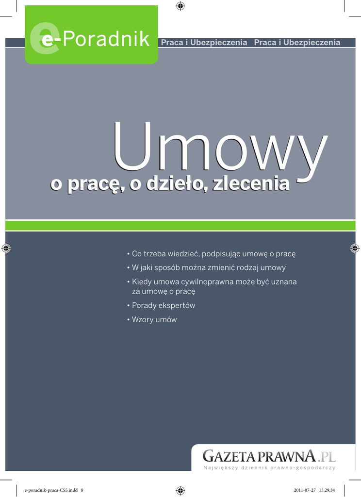 e e-Poradnik Praca i Ubezpieczenia Praca i Ubezpieczenia Umowy o pracę, o dzieło, zlecenia • Co trzeba wiedzieć, podpisując umowę o pracę • W jaki sposób można zmienić rodzaj umowy • Kiedy umowa cywilnoprawna może być uznana za umowę o pracę • Porady ekspertów • Wzory umów e-poradnik-praca-CS5.indd 8 2011-07-27 13:29:34 Adres redakcji: 01-042 Warszawa, ul. Okopowa 58/72 tel. (22) 530 40 40; www.gazetaprawna.pl Redakcja: Monika Bugaj-Wojciechowska, Anna Puszkarska; DTP: Joanna Archacka Biuro Obsługi Klienta: 05-270 Marki, ul. Okólna 40 tel. (22) 761 30 30, 0 801 62 66 66; e-mail: [email protected] © Copyright by INFOR Biznes Sp. z o.o. ISBN 978-83-61957-78-2 Wydanie I/2011, lipiec 2011 r. SPIS TREŚCI Wstęp . . . . . . . . . . . . . . . . . . . . . . . . . . . . . . . . . . . . . . . . . . . . . . . . . . . . . . . . . . . 5 Rozdział 1. Kiedy warto podpisać przedwstępną umowę o pracę . . . . . .7 Treść umowy . . . . . . . . . . . . . . . . . . . . . . . . . . . . . . . . . . . . . . . . . . . . . . . . . . . . . .7 Bez określenia terminu . . . . . . . . . . . . . . . . . . . . . . . . . . . . . . . . . . . . . . . . . . . . . .8 Skutki odmowy wykonania umowy . . . . . . . . . . . . . . . . . . . . . . . . . . . . . . . . . . . . .8 Dochodzenie odszkodowania . . . . . . . . . . . . . . . . . . . . . . . . . . . . . . . . . . . . . . . . .9 Kara umowna . . . . . . . . . . . . . . . . . . . . . . . . . . . . . . . . . . . . . . . . . . . . . . . . . . . .10 Przymusowe zawarcie umowy . . . . . . . . . . . . . . . . . . . . . . . . . . . . . . . . . . . . . . . .10 Właściwość sądu . . . . . . . . . . . . . . . . . . . . . . . . . . . . . . . . . . . . . . . . . . . . . . . . . .11 Przedawnienie roszczeń . . . . . . . . . . . . . . . . . . . . . . . . . . . . . . . . . . . . . . . . . . . . .11 Przerwanie biegu przedawnienia . . . . . . . . . . . . . . . . . . . . . . . . . . . . . . . . . . . . . .12 PORADY . . . . . . . . . . . . . . . . . . . . . . . . . . . . . . . . . . . . . . . . . . . . . . . . . . . . . . . .14 Rozdział 2. Co trzeba wiedzieć, podpisując umowę o pracę . . . . . . .18 Dodatkowe dokumenty . . . . . . . . . . . . . . . . . . . . . . . . . . . . . . . . . . . . . . . . . . . . .19 Ochrona danych osobowych . . . . . . . . . . . . . . . . . . . . . . . . . . . . . . . . . . . . . . . . .19 Treść umowy . . . . . . . . . . . . . . . . . . . . . . . . . . . . . . . . . . . . . . . . . . . . . . . . . . . . .20 Forma umowy . . . . . . . . . . . . . . . . . . . . . . . . . . . . . . . . . . . . . . . . . . . . . . . . . . . .21 Uprawnienia pracownicze . . . . . . . . . . . . . . . . . . . . . . . . . . . . . . . . . . . . . . . . . . .22 PORADY . . . . . . . . . . . . . . . . . . . . . . . . . . . . . . . . . . . . . . . . . . . . . . . . . . . . . . . .23 Rozdział 3. Jakie obowiązki informacyjne obciążają pracodawcę . . .42 Informacja o ryzyku zawodowym . . . . . . . . . . . . . . . . . . . . . . . . . . . . . . . . . . . . .43 Informacja o tajemnicy przedsiębiorstwa . . . . . . . . . . . . . . . . . . . . . . . . . . . . . . .43 Zapoznanie z treścią regulaminu pracy . . . . . . . . . . . . . . . . . . . . . . . . . . . . . . . . .44 Zakres informacji o warunkach zatrudnienia . . . . . . . . . . . . . . . . . . . . . . . . . . . .44 Informacja o równym traktowaniu . . . . . . . . . . . . . . . . . . . . . . . . . . . . . . . . . . . .47 Informacja o zmianie wymiaru etatu i o miejscach pracy . . . . . . . . . . . . . . . . . .48 Zawiadomienie o przejściu zakładu pracy . . . . . . . . . . . . . . . . . . . . . . . . . . . . . . .49 PORADY . . . . . . . . . . . . . . . . . . . . . . . . . . . . . . . . . . . . . . . . . . . . . . . . . . . . . . . .50 Rozdział 4. Umowa na okres próbny . . . . . . . . . . . . . . . . . . . . . .51 PORADY . . . . . . . . . . . . . . . . . . . . . . . . . . . . . . . . . . . . . . . . . . . . . . . . . . . . . . . .52 Rozdział 5. Umowy na czas nieokreślony i określony . . . . . . . . . . .56 Długotrwałe umowy na czas określony . . . . . . . . . . . . . . . . . . . . . . . . . . . . . . . . .57 Kolejna umowa na czas nieokreślony . . . . . . . . . . . . . . . . . . . . . . . . . . . . . . . . . .58 Wyłączenie stosowania . . . . . . . . . . . . . . . . . . . . . . . . . . . . . . . . . . . . . . . . . . . . .59 Adresaci ustawy antykryzysowej . . . . . . . . . . . . . . . . . . . . . . . . . . . . . . . . . . . . . .60 Umowy na czas określony w ustawie antykryzysowej . . . . . . . . . . . . . . . . . . . . . .61 PORADY . . . . . . . . . . . . . . . . . . . . . . . . . . . . . . . . . . . . . . . . . . . . . . . . . . . . . . . .64 Rozdział 6. Umowa o pracę na zastępstwo . . . . . . . . . . . . . . . . . .65 Konieczne podanie danych nieobecnego pracownika . . . . . . . . . . . . . . . . . . . . . .65 Wskazanie terminu końcowego . . . . . . . . . . . . . . . . . . . . . . . . . . . . . . . . . . . . . . .65 Wymiar czasu pracy i wynagrodzenie . . . . . . . . . . . . . . . . . . . . . . . . . . . . . . . . . .66 PORADY . . . . . . . . . . . . . . . . . . . . . . . . . . . . . . . . . . . . . . . . . . . . . . . . . . . . . . . .67 Rozdział 7. Umowa na czas wykonania określonej pracy . . . . . . . . .72 PORADY . . . . . . . . . . . . . . . . . . . . . . . . . . . . . . . . . . . . . . . . . . . . . . . . . . . . . . . .74 Rozdział 8. Zatrudnienie na podstawie umowy zlecenia . . . . . . . . .76 Wynagrodzenie zleceniobiorcy . . . . . . . . . . . . . . . . . . . . . . . . . . . . . . . . . . . . . . .76 Wykonanie zlecenia . . . . . . . . . . . . . . . . . . . . . . . . . . . . . . . . . . . . . . . . . . . . . . . .76 Rozwiązanie umowy . . . . . . . . . . . . . . . . . . . . . . . . . . . . . . . . . . . . . . . . . . . . . . .77 PORADY . . . . . . . . . . . . . . . . . . . . . . . . . . . . . . . . . . . . . . . . . . . . . . . . . . . . . . . .78 Rozdział 9. Zatrudnienie na podst