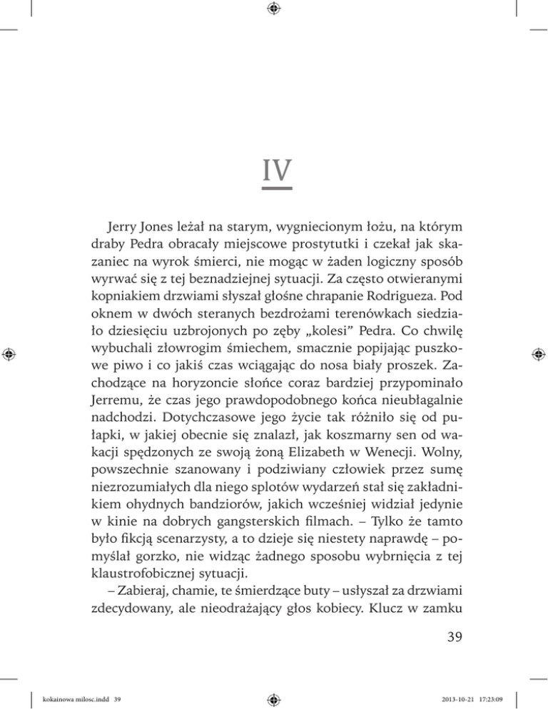 IV Jerry Jones leżał na starym, wygniecionym łożu, na którym draby Pedra obracały miejscowe prostytutki i czekał jak skazaniec na wyrok śmierci, nie mogąc w żaden logiczny sposób wyrwać się z tej beznadziejnej sytuacji. Za często otwieranymi kopniakiem drzwiami słyszał głośne chrapanie Rodrigueza. Pod oknem w dwóch steranych bezdrożami terenówkach siedziało dziesięciu uzbrojonych po zęby „kolesi” Pedra. Co chwilę wybuchali złowrogim śmiechem, smacznie popijając puszkowe piwo i co jakiś czas wciągając do nosa biały proszek. Zachodzące na horyzoncie słońce coraz bardziej przypominało Jerremu, że czas jego prawdopodobnego końca nieubłagalnie nadchodzi. Dotychczasowe jego życie tak różniło się od pułapki, w jakiej obecnie się znalazł, jak koszmarny sen od wakacji spędzonych ze swoją żoną Elizabeth w Wenecji. Wolny, powszechnie szanowany i podziwiany człowiek przez sumę niezrozumiałych dla niego splotów wydarzeń stał się zakładnikiem ohydnych bandziorów, jakich wcześniej widział jedynie w kinie na dobrych gangsterskich filmach. – Tylko że tamto było fikcją scenarzysty, a to dzieje się niestety naprawdę – pomyślał gorzko, nie widząc żadnego sposobu wybrnięcia z tej klaustrofobicznej sytuacji. – Zabieraj, chamie, te śmierdzące buty – usłyszał za drzwiami zdecydowany, ale nieodrażający głos kobiecy. Klucz w zamku 39 kokainowa milosc.indd 39 2013-10-21 17:23:09 Robert Gong zgrzytnął i do pokoju weszła latynoska kobieta, piękna niczym Afrodyta wyłaniająca się z błękitnych wód oceanu. Ubrana w drogą bordową suknię do połowy łydek z niewielkim dekoltem pod szyją. Z rozpuszczonymi kruczoczarnymi włosami, grubymi brwiami koloru włosów i lekko śniadą cerą wyglądała, jakby właśnie po raz pierwszy wyszła z solarium. Urody mogłyby jej pozazdrościć największe gwiazdy filmowe popularnego kina światowego. A przy jej figurze, choć przy wzroście metr siedemdziesiąt, krępowałyby się wyjść na wybieg najlepsze modelki naszego globu. W rękach trzymała dużą przykrytą srebrną tacę. Bardzo seksownym lekkim ruchem prawej nogi zatrzasnęła za sobą drzwi. Jonesowi na jej widok zupełnie odebrało mowę. Zerwał się z łóżka i stanął jak uczniak przed profesorem olśniony jej urodą, jakby zobaczył tuż nad głową przelatujący spodek UFO. Był zdezorientowany, bo kobieta pasowała do tej speluny jak słoń do składu porcelany. – Witaj, Jerry – odezwała się tak słodko, jakby od lat byli przynajmniej dobrymi przyjaciółmi. Na małym stojącym pośrodku pokoju stoliku postawiła tacę z jedzeniem. Jerry tylko kiwnął głową na znak przywitania, nadal z wrażenia nic nie mówiąc. – Przyniosłam ci podwieczorek – powiedziała wskazując ręką na stół i usiadła obok na starym sfatygowanym krześle. – Ty mnie znasz? – zdobył się na odwagę Jones. Kobieta uśmiechnęła się, wyraźnie go kokietując, i powtórzyła za nim: – Czy cię znam? Przecież jesteś jednym z moich ulubionych pisarzy. – Wybacz, ale nic z tego nie rozumiem – nie krył zdziwienia Jerry. 40 kokainowa milosc.indd 40 2013-10-21 17:23:09 — Kokainowa Miłość — – W ogóle ci się nie dziwię – oznajmiła smutno i po chwili dodała – wiem, jak to wygląda – jak perła wśród wieprzy, tylko że ja z nimi nie mam nic wspólnego. Jones pokiwał kpiąco głową. – To co ta „perła” tu robi? Kobieta wyciągnęła swą delikatną dłoń do Jerrego. – Wybacz, nie przedstawiłam się. Mam na imię Gloria i, niestety, jestem córką chrzestną Pedra. Jones przeczesał ręką włosy, pogardliwie się uśmiechnął i już bez wielkiej kurtuazji powiedział: – To wujcio przysłał cię na przeszpiegi, czy czegoś nie kombinuję? Czy tak? – Wiem, że to wygląda dziwnie, ale albo mi uwierzysz, albo zginiesz, a ja za miesiąc będę musiała wyjść za mąż za jednego z tych wieprzy Pedra. Zza drzwi nagle dobiegł ironiczny głos Rodrigueza: – Gloria, ty mu miałaś dać obiad, a nie to, co masz najlepszego – zaczął się głośno śmiać swoim chrypliwym głosem. Kobieta wstała z krzesła, podeszła do okna, otworzyła je i kategorycznym głosem nakazała jednemu z typów siedzących w terenówkach, aby poprosił na górę do pokoju jej wuja. Ten zerwał się z miejsca i biegiem poleciał na dół do lokalu, gdzie w swym zakurzonym mocno sfatygowanym kapeluszu wolno delektował się piwem jej wuj. Po chwili drzwi w mało elegancki sposób otworzyły się i ze strzelbą w prawej ręce wszedł niewielki człowiek z twarzą ogorzałą od słońca, który w swoich rękach trzymał prawie cały przemyt kokainy z Ameryki Południowej do USA i Kanady. – Pedro zrób coś, bo ten wieprz znowu mnie zaczepia – poskarżyła się kobieta, udając zbulwersowaną. 41 kokainowa milosc.indd 41 2013-10-21 17:23:09 Robert Gong – Rodriguez – spokojnie powiedział Pedro i obrócił się w kierunku oprycha ze strzelbą wycelowaną w jego głowę. – Dzisiaj to jeszcze przeżyjesz, bo masz z tym białasem za chwilę jechać, ale jeżeli jeszcze raz powiesz mojej chrześnicy chociażby dzień dobry, to własnoręcznie obetnę ci jaja. Dotarło? – zapytał bardzo spokojnie, patrząc mu prosto w oczy. Rodriguez, milcząc, zszedł na dół do lokalu. – Chodź, Gloria – rzekł Pedro i gdy zwrócił się ku wyjściu usłyszał: – Dziękuję. – Nie ma za co, przecież jesteś dla mnie jak córka. – A mogę wuju trochę porozmawiać z panem Jonesem – poprosiła. Pedro uśmiechnął się pod nosem. – Możesz, ale niech to będzie tylko rozmowa. A ty białasie miej się lepiej na baczności – zakończył rozmowę i trzasnął za sobą drzwiami. – Teraz mnie uważnie słuchaj – oznajmiła podekscytowana kobieta. – Jesteś mądrym człowiekiem i widzisz, że jesteśmy w piekle. Mamy dzisiaj jedyną niepowtarzalną szansę stąd uciec. Wiem, że mi nie wierzysz, ale ja