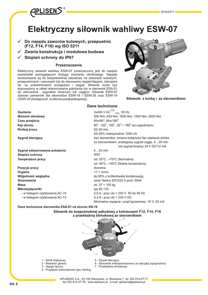 2016/2017 Elektryczny si³ownik wahliwy ESW-07 Do napêdu zaworów kulowych, przepustnic [ (F12, F14, F16) wg ISO 5211 [ Zwarta konstrukcja i modu³owa budowa [ Stopieñ ochrony do IP67 Przeznaczenie Elektryczny si³ownik wahliwy ESW-07 przeznaczony jest do napêdu zawierade³ wymagaj¹cych du¿ego momentu obrotowego. Napêdy dostosowane s¹ do bezpoœredniej zabudowy na zaworach kulowych, przepustnicach i zasuwach lub do sterowania ciêgie³ klapami, ¿aluzjami itp. za poœrednictwem przegubów i ciêgie³. Si³ownik mo¿e byæ wyposa¿ony w uk³ad odwzorowania po³o¿enia lub w sterownik ESA-01 do sterowania sygna³em binarnym lub ci¹g³ym. Si³ownik ESW-07 stanowi zamiennik dla si³owników ESW-16 i ESW-26 oraz ESW-19 i ESW-20 (dostêpnych w ofercie pozakatalogowej). Si³ownik z korb¹ i ze sterownikiem Dane techniczne 10% Zasilanie Moment obrotowy Czas przejœcia K¹t obrotu Rodzaj pracy 3x400 V AC -15%, 50 Hz 500 Nm; 630 Nm; 1000 Nm; 1500 Nm; 2000 Nm 60s/90O; 60s/180O 90O, 120O, 150O, 30O ÷ 180O po uzgodnieniu S2-30 min. S4-25% maksymalnie 1200 c/h bez sterownika: zmiana kolejnoœci faz zasilania silnika ze sterownikiem: analogowy sygna³ ci¹g³y 4…20 mA lub sygna³ binarny 24 V DC/12 mA 4…20 mA IP67 od -25oC...+70oC (Normalna) od -40oC...+55oC (Niskie temperatury) dowolna <7,1 mm/s do 95% z krótkotrwa³¹ kondensacj¹ smar Gadus S2V220 0 prod. Shell ok. 37 ÷ 100 kg typ 83.133 2,5 A - przy Ue = 230 V 50 do 60 Hz 0,3 A - przy Ue = 230 V DC Minimalne napiêcie i pr¹d ³¹czeniowy: 10 V, 20 mA Sygna³ steruj¹cy Sygna³ odwzorowania po³o¿enia Stopieñ ochrony Temperatura pracy Pozycja pracy Drgania Wilgotnoœæ wzglêdna Smarowanie Masa Mikrowy³¹czniki - w kategorii u¿ytkowania AC-15 - w kategorii u¿ytkowania AC-13 Dane techniczne sterownika ESA-01 na stronie XIII.16 Si³ownik do bezpoœredniej zabudowy z ko³nierzami F12, F14, F16 z przek³adni¹ œlimakow¹ ze sterownikiem 6 5 3 4 7 2 1 1 - Silnik trójfazowy 2 - Reduktor g³ówny 3 - Napêd rêczny 4 - Przy³¹cze wielostykowe typu Harting XIII. 8 5 - Zespó³ steruj¹cy 6 - Sterownik mikroprocesorowy ze stacyjk¹ (opcjonalnie) 7 - Przek³adnia œlimakowa APLISENS S.A., 03-192 Warszawa, ul. Morelowa 7, tel. 022 814-07-77 fax 022 814-07-78, www.aplisens.pl, e-mail: [email protected] 2016/2017 Elektryczny si³ownik wahliwy E S W A X 90O A 0 120O A 1 150O A 2 wg zamówienia klienta (w zakresie od 30 O…180O) - po uzgodnieniu - A X MOMENT OBROTOWY 500Nm - 0 7 - X X 1 1 2 1 3 1 4 1 - - X X - X - X X X - X CZAS PRZEJŒCIA KOD1 630Nm 1000Nm 60s/90O 1500Nm 2000Nm O 1500Nm 60s/180 5 1 4 2 KOD2 K¥T OBROTU KOD3 WYKONANIE KLIMATYCZNE Normalne -25OC…70OC * O 1 O Niskie temperatury -40 C…55 C - po uzgodnieniu 2 KOD4 WYPOSA¯ENIE Przetwornik po³o¿enia EPO-01 (analogowy potencjometryczny 4…20mA dwuprzewodowy) B Przetwornik po³o¿enia EPO-02 (bezstykowy cyfrowy 4…20mA dwuprzewodowy) Przetwornik po³o¿enia EPO-03 (bezstykowy cyfrowy 4…20mA dwuprzewodowy) z wyœwietlaczem) C Sterownik analogowy ESA-01 ze stacyjk¹ sterowania miejscowego Bez wyposa¿enia D E A KOD5 PRZY£¥CZA ELEKTRYCZNE Z³¹cze wielostykowe typu Harting (dla si³ownika ze stopniem ochrony IP67) 1 Z³¹cze wielostykowe typu Harting + kontrolna listwa zaciskowa (dla si³ownika ze stopniem ochrony IP67) 2 Z³¹cze wielostykowe typu Harting (dla si³ownika ze stopniem ochrony IP65) 3 Z³¹cze wielostykowe typu Harting + kontrolna listwa zaciskowa (dla si³ownika ze stopniem ochrony IP65) 4 KOD6 PRZY£¥CZA MECHANICZNE Wg zamówienia klienta - po uzgodnieniu X X X Korba K 0 0 Korba + koñcówka ciêgna przegubowa K 0 2 Korba + amortyzator K 0 3 Korba + koñcówka ciêgna przegubowa + amortyzator K 0 5 Korba + koñcówka ciêgna przegubowa 2 szt. K 0 7 Korba + koñcówka ciêgna przegubowa 2 szt. + amortyzator K 0 9 KOD7 WYPOSA¯ENIE DODATKOWE Bez wyposa¿enia dodatkowego 0 Zasilacz z przetwarzaniem sygna³u (czteroprzewodowy) - wy³¹cznie do zabudowy na zewn¹trz si³ownika 1 * - do niskich temperatur -40°C...55°C mo¿na stosowaæ wyposa¿enie o wyró¿niku A, B i C - wykonanie opcjonalne w zakresie temperatur -30°C...70°C; dla wyposa¿enia o wyró¿niku (KOD4) D i E - po uzgodnieniu z konsultantem Aplisens o o Przyk³ad: Elektryczny si³ownik wahliwy ESW-07 z momentem obrotowym 1000 Nm, czas przejœcia 60s/90 , k¹t obrotu 90 , wykonanie normalne z przetwornikiem po³o¿enia EPO-02, z³¹cze wielostykowe typu Harting IP67, z korb¹, bez wyposa¿enia dodatkowego ESW-07-31-A0-1-C1-K00-0 APLISENS S.A., 03-192 Warszawa, ul. Morelowa 7, tel. 022 814-07-77 fax 022 814-07-78, www.aplisens.pl, e-mail: [email protected] XIII. 9