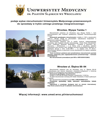podaje wykaz nieruchomości Uniwersytetu Medycznego przeznaczonych do sprzedaży w trybie ustnego przetargu nieograniczonego: Wrocław, Wyspa Tamka 1 Nieruchomość położona we Wrocławiu przy Wyspa Tamka 1, była wykorzystywana jako budynek dydaktyczny Wydziału Farmaceutycznego Uczelni. Oznaczenie geodezyjne nieruchomości: działka nr 18/3 o powierzchni 2 1804 m , AM-26, Obręb Pl. Grunwaldzki, zabudowana budynkiem o 2 powierzchni użytkowej 1358,50 m . Nieruchomość położona jest w strefie centrum wielkomiejskiego Wrocławiu, jako fragment obszaru stanowiącego ,,Teren Wysp Odrzańskich: Tamki, Piaskowej, Słodowej, Bielarskiej i Tumskiej w granicach ulic: Wieczorka – Sienkiewicza – z pl. Bema wraz z zabudową, układem komunikacji oraz zarysem wód” podlega ochronie konserwatora zabytków na podstawie decyzji z dnia 12.05.1967 r. – nr rejestru 213. W 2013 r. nieruchomość wpisano w granicach murów obwodowych do rejestru zabytków pod nr A/5854. Teren na którym położona jest przedmiotowa nieruchomość posiada aktualny miejscowy plan zagospodarowania przestrzennego – Uchwała XXXVII/855/13r. Dla nieruchomości prowadzona jest KW nr WR1K/00181260/2. Wrocław ul. Ślężna 88–94 Nieruchomość położona jest we Wrocławiu przy ul. Ślężnej 88–94 i zabudowana jest dwoma budynkami mieszkalno-usługowymi o zmiennej wysokości 6–8 kondygnacji oraz budynkiem usługowym. Oznaczenie geodezyjne nieruchomości. Działka nr 23/2,AM-38,Obreb Południe o powierzchni 1,3140 ha. W skład nieruchomości wchodzą 253 lokale mieszkalne, 8 lokali użytkowych i 7 garaży. Dla nieruchomości prowadzona jest KW nr WR1K/00093137/7. Przedmiot sprzedaży będą stanowić samodzielne lokale użytkowe. Ogłoszenie o przetargu dostępne jest na stronie internetowej: http://www.umed.wroc.pl/ w zakładce nieruchomości. Więcej informacji: www.umed.wroc.pl/nieruchomosci