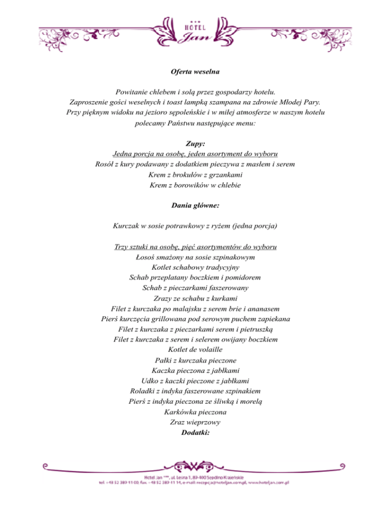 Oferta weselna Powitanie chlebem i solą przez gospodarzy hotelu. Zaproszenie gości weselnych i toast lampką szampana na zdrowie Młodej Pary. Przy pięknym widoku na jezioro sępoleńskie i w miłej atmosferze w naszym hotelu polecamy Państwu następujące menu: Zupy: Jedna porcja na osobę, jeden asortyment do wyboru Rosół z kury podawany z dodatkiem pieczywa z masłem i serem Krem z brokułów z grzankami Krem z borowików w chlebie Dania główne: Kurczak w sosie potrawkowy z ryżem (jedna porcja) Trzy sztuki na osobę, pięć asortymentów do wyboru Łosoś smażony na sosie szpinakowym Kotlet schabowy tradycyjny Schab przeplatany boczkiem i pomidorem Schab z pieczarkami faszerowany Zrazy ze schabu z kurkami Filet z kurczaka po malajsku z serem brie i ananasem Pierś kurczęcia grillowana pod serowym puchem zapiekana Filet z kurczaka z pieczarkami serem i pietruszką Filet z kurczaka z serem i selerem owijany boczkiem Kotlet de volaille Pałki z kurczaka pieczone Kaczka pieczona z jabłkami Udko z kaczki pieczone z jabłkami Roladki z indyka faszerowane szpinakiem Pierś z indyka pieczona ze śliwką i morelą Karkówka pieczona Zraz wieprzowy Dodatki: Ziemniaki, frytki, ziemniaki ze skórką, sos pieczeniowy Surówki: Jedna porcja na osobę, trzy asortymenty do wyboru Surówka z kapusty pekińskiej z sosem ogrodowym Surówka z kapusty czerwonej Surówka z kapusty białej Marchewka z jabłkiem Buraki z cebulą Surówka z selera (z rodzynkami i orzechami) Ciepłe dodatki: Jedna porcja na osobę, jeden asortyment do wyboru Marchewka z groszkiem Kalafior z wody z masłem i bułką tartą Brokuł z wody z masłem i bułka tartą Mieszanka warzyw gotowanych (kalafior, brokuł, marchewka mini) Deser: Ciasta krojone w kawałkach dwie i pół sztuki na osobę, asortyment do uzgodnienia Kawa, herbata podawana na stole szwedzkim bez ograniczeń Możliwość dokupienia deseru: Lody waniliowe ze śmietaną i sosem malinowym -10,00 zł/szt Lody na gorąco na sosie malinowym- 8,00 zł/szt Tiramizu – włoski deser z serka mascarpone na sosie malinowym- 10,00 zł Szarlotka z lodami waniliowymi na sosie malinowym – 10,00 zł Owoce: Winogrona, banany, kiwi, mandarynki, arbuzy lub inne aktualnie dostępne na rynku Zimna płyta: Zakąski zimne z ryb: Jedna porcja na osobę jeden lub dwa asortymenty do wyboru Pstrąg faszerowany sandaczem w galarecie Roladki z łososia w biszkopcie szpinakowym Tatar z łososia Łosoś wędzony ze szparagami Sandacz w galarecie Ryba po japońsku Ryba po grecku Ryba w zalewie octowej Śledź bajeczny w oleju z vinaigrettem malinowym Pstrąg wędzony Zakąski zimne z mięs: Trzy porcje na osobę cztery asortymenty do wyboru Galantyna z kurczaka z kurkami Mus drobiowy z czerwonym pesto w polędwiczce wieprzowej Pasztet wieprzowo drobiowy w cieście francuskim Pasztet drobiowy z pieczarkami Schab ze śliwką i orzechami owijany boczkiem wędzonym Schab po warszawsku z masłem i chrzanem Polędwiczki wieprzowe z porami Schab w galarecie z brzoskwinią Ruloniki z szynek faszerowane sałatką z ogórków pieczarek i papryki Szynka ze szparagami i jajkiem Roladki z szynki z sałatką ziemniaczaną Klopsiki w occie Karkówka z sosem barbecue Do wszystkich zakąsek podajemy pieczywo i masło Sałatki: Jedna porcja na osobę, dwa asortymenty do wyboru Sałatka jarzynowa tradycyjna Sałatka z czerwoną fasolą(ziemniaki, kukurydz, ogórek kisz, jajka, majonez, fasola czerwona) Sałatka orientalna (orzeszki ziemnie, kukurydza , por, ananas, pierś kurczaka, majonez, ketchup) Sałatka egzotyczna (kurczak wędzony, śliwki, brzoskwinie, majonez) Sałatka grecka(pomidor, ogorek, cebula, papryka, ser feta, oliwki) Sałatka z kurczaka ( ryż, ananas, kurczak gotowany, rodzynki, majonez) Sałatka z tuńczyka(tuńczyk, groszek konserwowy, kukurydza konserwowa, tuńczyk, ryż, majonez Sałatka „Jana”(kukurydz, ogórek konserw, majonez, ryż, pieczarki ,czosnek, jajka Sałatka gyros (pierś kurczaka, papryka, ogórek kon. kukurydza kon .kapusta pekińska, majonez, ketchup) Sałatka z pierożkami tortelini i ananasem (tortelini, por, ananas, majonez) Ciepła płyta: Jedna porcja na osobę jeden asortyment Polędwiczki wieprzowe w sosie estragonowym Gulasz po węgiersku z warzywami Buef Strogonoff Strogonoff z indyka Żurek z jajkiem i białą kiełbasą Flaki wołowe Tort :godz:23:00 Tort kilku piętrowy (ilość pięter uzależniona od ilości gości) Ciepła płyta: 1:30 Barszcz czysty (jedna porcja na osobę) Pozostałe mięsa jedna porcja na osobę do wyboru dwa asortymenty Szaszłyk z drobiu Stek z udka kurczęcia na warzywach grillowanych Panierowany filet z kurczaka ze szpinakiem i parmezanem Golonki peklowane z kapustą Rolada ze schabu po sztygarsku(mięso mielone, wędlina, boczek wędzony) Schab po królewsku(z szynka konserwową i serem żółtym) Plastry karkówki pieczonej w warzywach Napoje: Dwa litry na osobę Soki: pomarańczowy, czarna porzeczka, jabłkowy, grejpfrutowy, wieloowocowy, Woda niegazowana z cytryną i lodem Podane menu proponujemy Państwu w cenie 199,00 zł od osoby Dzieci w wieku do 6 lat – GRATIS. Standardowy wystrój sali gratis. Korkowe 150,00 zł Dodatkowo oferujemy w dniu wesela jeden pokój dla Pary Młodej gratis i jeden pokój gratis przy organizacji wesela powyżej 50 osób Cennik noclegów: pokój 1-os.100,00 zł, pokój 2-os. 140,00 zł, pokój 3-os.170,00 zł, pokój 4-os. 200,00 zł Podane ceny są cenami brutto. Oferta ważna do 31.12.2017 r. Dodatkowe atrakcje wieczoru: Prosiak pieczony faszerowany nadzieniem mięsnym podawany z kaszą ogórkami i papryką konserwową – 900,00 zł Marynowana szynka wieprzowa pieczona w całości z sosem żurawinowym – 600,00 zł Indyk pieczony faszerowany nadzieniem mięsnym podawany z sosem serowym – 600,00 zł Stół wiejski (wędliny suche, kaszanka, smalec wiejski ze skwarkami, ogórki konserwowe, papryka konserwowa, pieczywo, szynka wieprzowa parzona, chrzan, żurawina) –600,00 zł Pop