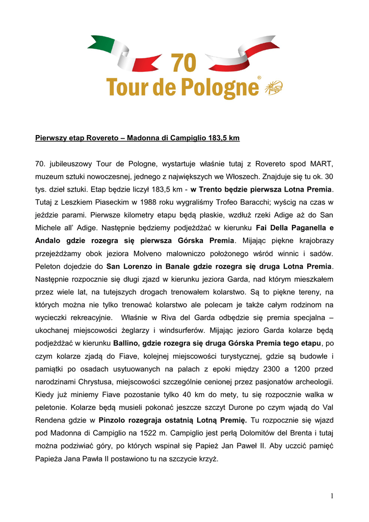 Pierwszy etap Rovereto – Madonna di Campiglio 183,5 km 70. jubileuszowy Tour de Pologne, wystartuje właśnie tutaj z Rovereto spod MART, muzeum sztuki nowoczesnej, jednego z największych we Włoszech. Znajduje się tu ok. 30 tys. dzieł sztuki. Etap będzie liczył 183,5 km - w Trento będzie pierwsza Lotna Premia. Tutaj z Leszkiem Piaseckim w 1988 roku wygraliśmy Trofeo Baracchi; wyścig na czas w jeździe parami. Pierwsze kilometry etapu będą płaskie, wzdłuż rzeki Adige aż do San Michele all’ Adige. Następnie będziemy podjeżdżać w kierunku Fai Della Paganella e Andalo gdzie rozegra się pierwsza Górska Premia. Mijając piękne krajobrazy przejeżdżamy obok jeziora Molveno malowniczo położonego wśród winnic i sadów. Peleton dojedzie do San Lorenzo in Banale gdzie rozegra się druga Lotna Premia. Następnie rozpocznie się długi zjazd w kierunku jeziora Garda, nad którym mieszkałem przez wiele lat, na tutejszych drogach trenowałem kolarstwo. Są to piękne tereny, na których można nie tylko trenować kolarstwo ale polecam je także całym rodzinom na wycieczki rekreacyjnie. Właśnie w Riva del Garda odbędzie się premia specjalna – ukochanej miejscowości żeglarzy i windsurferów. Mijając jezioro Garda kolarze będą podjeżdżać w kierunku Ballino, gdzie rozegra się druga Górska Premia tego etapu, po czym kolarze zjadą do Fiave, kolejnej miejscowości turystycznej, gdzie są budowle i pamiątki po osadach usytuowanych na palach z epoki między 2300 a 1200 przed narodzinami Chrystusa, miejscowości szczególnie cenionej przez pasjonatów archeologii. Kiedy już miniemy Fiave pozostanie tylko 40 km do mety, tu się rozpocznie walka w peletonie. Kolarze będą musieli pokonać jeszcze szczyt Durone po czym wjadą do Val Rendena gdzie w Pinzolo rozegraja ostatnią Lotną Premię. Tu rozpocznie się wjazd pod Madonna di Campiglio na 1522 m. Campiglio jest perłą Dolomitów del Brenta i tutaj można podziwiać góry, po których wspinał się Papież Jan Paweł II. Aby uczcić pamięć Papieża Jana Pawła II postawiono tu na szczycie krzyż. 1 Drugi etap Marilleva/Val di Sole - Passo Pordoi 195,5 km Drugi etap wystartuje z Marilleva 900 Val di Sole – w sercu Dolomiti del Brenta, i będzie liczył 195,5 km. To na pewno będzie królewski etap, będziemy przejeżdżali przez Val di Sole. Val di Sole jest jednym z najpiękniejszych kurortów narciarskich ale także latem licznie odwiedzanym przez turystów ze względu na wspaniałe ścieżki rowerowe i możliwość uprawiania raftingu na rzece Noce. Następnie peleton przejedzie przez Val di Non, wśród pięknych winnic i sadów. W Cles kolarze przejadą obok domu mistrza świata i byłego zwycięzcy Tour de Pologne - Maurizio Fondriesta. Dojedziemy do miejscowości Fondo gdzie rozegra się Lotna Premia a następnie do miejscowości Segno gdzie odbędzie się Premia Specjalna. Opuścimy Val di Non aby dojechać do Val di Cembra i właśnie stąd z miejscowości Palu di Giovo pochodzi rodzina Moser, między innymi mój przyjaciel Francesco Moser i zwycięzca ostatniego Tour de Pologne - Moreno Moser. Francesco bardzo mi pomógł przy wyborze i opracowaniu trasy tych dwóch etapów, bo nikt lepiej od niego nie zna tych gór. I właśnie dzisiaj wspólnie z Alessandro Bertolini towarzyszą mi na tej trasie. Wyjeżdżając z Val di Cembra mijamy premię lotną w miejscowości Cembra i zbliżamy się do Cavalese, jednej z najpiękniejszych miejscowość regionu Trentino z piękna historią i architekturą miejsc takich jak pałac Della Magnifica i kościół San Vigilio. Tu zaczyna się podjazd pod Pampeago, gdzie będzie pierwsza Górska Premia tego etapu i wiele razy rozgrywały się mety Giro d’ Italia, jest to bardzo trudny podjazd, na którym rozpocznie się selekcja. Zjeżdżając z Pampeago podjedziemy pod drugą Górską Premię na Passo Costalunga. Jadąc w stronę Canazei będziemy mogli podziwiać piękne widoki na górę Marmolada, Sasso Lungo i Gruppo del Sella. Meta będzie na Passo Pordoi na wysokości 2239 m, po raz pierwszy w historii Tour de Pologne wjedzie na taki wysoki szczyt – co zawsze był o moim marzeniem. Wiele gwiazd tutaj się ścigało, między innymi Bartali i Coppi, któremu zadedykowano tę górę. Wiele razy podczas Giro d’Italia ten podjazd rozstrzygał klasyfikację generalną. Pozostawiamy piękne Trentino, gdzie w Dolomitach kolarze z pewnością rozpoczną walkę o klasyfikację generalną i przemieszczamy się z ziemi włoskiej do Polski. III etap Kraków - Rzeszów 226 km 2 III etap o długości 226 km wyruszy z Krakowa, historycznej stolicy Polski, miasta bliskiego sercu Papieża Jana Pawła II, w którym mieszkał przez 40 lat, w okresie studiów, pracy kapłańskiej a później jako biskup i metropolita. W Krakowie można także odwiedzić szlak turystyczny “Ścieżkami Jana Pawła II”, który prowadzi przez 20 miejsc związanych z życiem Karola Wojtyły. Po starcie z zabytkowego Krakowskiego Rynku peleton pojedzie w kierunku Wieliczki, skąd odbędzie się start ostry. Pierwszy Polski etap będzie w większości płaski. Mijając malownicze tereny peleton przyjedzie do Strzyżowa, tu rozegrana zostanie pierwsza Lotna Premia. Strzyżów, to jedno z najpiękniej położonych miasteczek na Pogórzu Strzyżowsko - Dynowskim. Piękne pagórkowate tereny, z łagodnymi wzgórzami, rozległymi lasami, czystym powietrzem i bogatą fauną, tworzą doskonałe warunki do uprawiania turystyki. Następnie peleton pojedzie w kierunku Lubenia, gdzie rozegra się kolejna Premia Lotna. Lubenia leży u zbiegu rzek Lubenki i Wisłoka. Atrakcyjne usytuowanie Gminy, jej wąskie i kręte drogi oraz duże spadki, sprawiły, iż jest to raj dla kolarzy. W okolicy znajdziemy też ciekawe miejca historycze, m. in. drewniany, modrzewiowy kościół barokowy p.w. św. Urszuli zbudowany w 1739r. oraz kaskady solankowe z okresu mioceńskiego. Następnie na krótkim ale ciężkim po