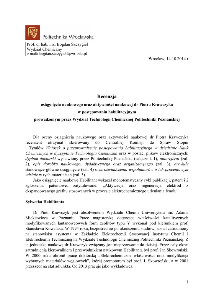 Prof. dr hab. inż. Bogdan Szczygieł Wydział Chemiczny e-mail: [email protected] Wrocław, 14.10.2014 r Recenzja osiągnięcia naukowego oraz aktywności naukowej dr Piotra Krawczyka w postępowaniu habilitacyjnym prowadzonym przez Wydział Technologii Chemicznej Politechniki Poznańskiej Dla oceny osiągnięcia naukowego oraz aktywności naukowej dr Piotra Krawczyka recenzent otrzymał skierowany do Centralnej Komisji do Spraw Stopni i Tytułów Wniosek o przeprowadzenie postępowania habilitacyjnego w dziedzinie Nauk Chemicznych w dyscyplinie Technologia Chemiczna oraz w postaci plików elektronicznych: dyplom doktorski wystawiony przez Politechnikę Poznańską (załącznik 1), autoreferat (zał. 2), opis dorobku naukowego, dydaktycznego oraz organizacyjnego (zał. 3), artykuły stanowiące główne osiągnięcie (zał. 4) oraz oświadczenia współautorów o ich procentowym udziale w tych materiałach (zał. 5). Jako osiągnięcie naukowe Habilitant wskazał monotematyczny cykl publikacji, patent i 2 zgłoszenia patentowe, zatytułowane: „Aktywacja oraz regeneracja elektrod z ekspandowanego grafitu stosowanych w procesie elektrochemicznego utleniania fenolu”. Sylwetka Habilitanta Dr Piotr Krawczyk jest absolwentem Wydziału Chemii Uniwersytetu im. Adama Mickiewicza w Poznaniu. Pracę magisterską dotyczącą właściwości katalitycznych modyfikowanych lantanowcowych form zeolitów typu Y wykonał pod kierunkiem prof. Stanisława Kowalaka. W 1994 roku, bezpośrednio po ukończeniu studiów, został zatrudniony na stanowisku asystenta w Zakładzie Elektrochemii Stosowanej Instytutu Chemii i Elektrochemii Technicznej na Wydziale Technologii Chemicznej Politechniki Poznańskiej. Z tą jednostką naukową dr Krawczyk związany jest nieprzerwanie do dzisiaj. Przez cały okres zatrudnienia kierownikiem i przewodnikiem naukowym Habilitanta był prof. Jan Skowroński. W 2000 roku obronił pracę doktorską „Elektrochemiczne właściwości oraz modyfikacja wybranych materiałów węglowych”, której promotorem był prof. J. Skowroński, a w 2001 przeszedł na etat adiunkta. Od 2013 pracuje jako wykładowca. 1 Główne osiągnięcie naukowe Wszystkie prace wchodzące w skład głównego osiągnięcia naukowego (monotematyczny cykl 16 publikacji, 1 patent i 2 zgłoszenia patentowe) zostały opublikowane w latach 20042014. Tytuł osiągnięcia wskazuje, że dotyczy ono stosunkowo wąskiego obszaru badawczego i ma charakter wyraźnie technologiczny. Lektura publikacji Habilitanta pokazuje jednak, że udział badań naukowych o charakterze podstawowym jest znaczny, a często dominujący. Można zatem stwierdzić, że wybór jako dziedziny – nauk chemicznych i technologii chemicznej jako dyscypliny dla oceny dorobku naukowego dr P. Krawczyka jest właściwy. Usuwanie fenolu ze ścieków jest tematem ważnym, badanym i realizowanym już od kilkudziesięciu lat. Ciągle jednak szuka się rozwiązań wydajniejszych i tańszych. Habilitant w badaniach, z racji swoich zainteresowań naukowych, skupia się na metodzie elektrochemicznej. Metoda elektrochemiczna utleniania fenolu obok niewątpliwych zalet ma również poważne wady. Najpoważniejsza łączy się z powstawaniem nierozpuszczalnych produktów pośrednich, które potrafią skutecznie blokować powierzchnię elektrody, aż do całkowitego zatrzymania reakcji. Jednym z ważniejszych czynników wpływających na przebieg procesu jest wybór materiału elektrodowego. Rozwiązań opisywanych w literaturze, w tym stosowanych w praktyce jest wiele, natomiast Habilitant uznał, że największe możliwości daje użycie jako anody materiału węglowego – materiału od dawna wykorzystywanego w zespole prof. Jana Skowrońskiego. Za cel postawił sobie zastosowanie ekspandowanego grafitu, jego aktywację i opracowanie metody regeneracji takich elektrod. W przedstawionym autoreferacie Habilitant swoje badania dzieli na trzy stanowiące logiczną sekwencję nurty. Pierwszy nurt badań polegający na modyfikacji materiału elektrodowego, czyli ekspandowanego grafitu, zmierzał do zwiększenia jego aktywności elektrochemicznej i odporności na dezaktywację. Dr Krawczyk zastosował w większości standardowe, dobrze znane z literatury metody obróbki materiału, a więc: utlenianie w warunkach potencjostatycznych, termiczną aktywację, aktywację za pomocą ozonu, oraz dwustopniową obróbkę - najpierw oddziaływanie chemiczne a potem termiczne w wyznaczonych środowiskach. Natomiast jako pierwszy zaproponował wtórną eksfoliację ekspandowanego grafitu połączoną z wtórną interkalacją H2SO4 w strukturę ekspandowanego grafitu. Po modyfikacji materiału elektrodowego Habilitant badał mechanizm procesu utleniania fenolu, oceniając czy uzyskane zmiany idą w zamierzonym kierunku. Najlepszy wariant to uzyskanie jako produktu końcowego wody i ditlenku węgla. Określał rodzaj grup funkcyjnych znajdujących się na powierzchni ekspandowanego grafitu i ich ilość, rozwinięcie powierzchni, analizował produkty rozpuszczone w roztworze i oznaczał stężenie fenolu. Proces utleniania fenolu prowadził w warunkach galwano- lub potencjostatycznych. Dla oceny efektu modyfikacji elektrod, ewentualnie zastosowanego dodatku do roztworu, standardowo wykorzystywał woltamperometrię cykliczną, spektroskopię fotoelektronów, spektroskopię w podczerwieni i skaningową mikroskopię elektronową. Metodami tymi Habilitant posługiwał się sprawnie i po rzeczowej dyskusji wyciągał wnioski, w których łączył poprawę aktywności elektrod z konkretnymi zmianami stanu ich powierzchni po modyfikacji oraz zmianami w mechanizmie utleniania. Tym samym dawał odpowiedź na jedno z ważniejszych pytań w nauce, czyli „dlaczego?”. Trzeba jednak wspomnieć, że często zadanie Habilitanta było ułatwione z uwagi na fakt, że wiele ważnych podpowiedzi do 2 prowadzonych rozważań dała mu literatura naukowa i opisane w niej badania prowadzone w inn