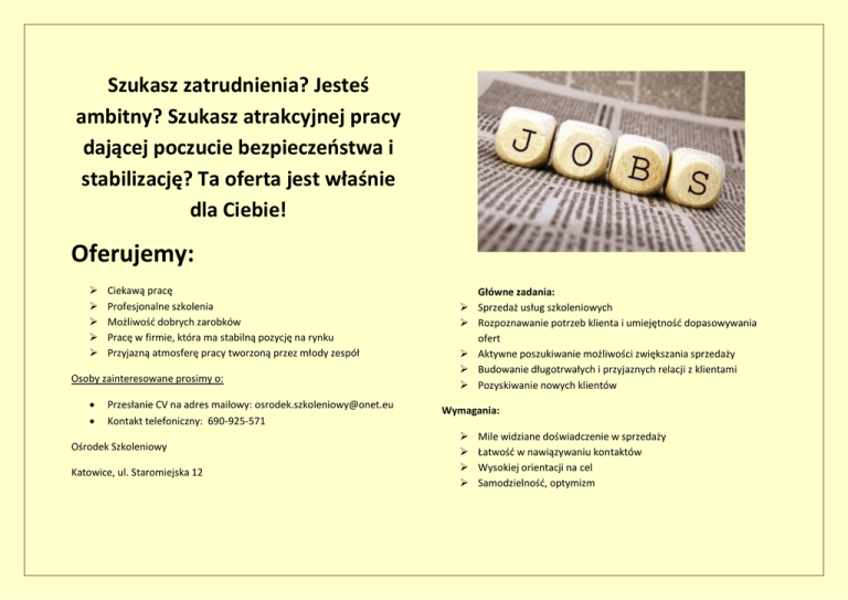 Szukasz zatrudnienia? Jesteś ambitny? Szukasz atrakcyjnej pracy dającej poczucie bezpieczeństwa i stabilizację? Ta oferta jest właśnie dla Ciebie! Oferujemy: Ciekawą pracę Profesjonalne szkolenia Możliwość dobrych zarobków Pracę w firmie, która ma stabilną pozycję na rynku Przyjazną atmosferę pracy tworzoną przez młody zespół Osoby zainteresowane prosimy o: Przesłanie CV na adres mailowy: [email protected] Kontakt telefoniczny: 690-925-571 Ośrodek Szkoleniowy Katowice, ul. Staromiejska 12 Główne zadania: Sprzedaż usług szkoleniowych Rozpoznawanie potrzeb klienta i umiejętność dopasowywania ofert Aktywne poszukiwanie możliwości zwiększania sprzedaży Budowanie długotrwałych i przyjaznych relacji z klientami Pozyskiwanie nowych klientów Wymagania: Mile widziane doświadczenie w sprzedaży Łatwość w nawiązywaniu kontaktów Wysokiej orientacji na cel Samodzielność, optymizm