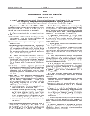 Dziennik Ustaw Nr 289 — 16790 — Poz. 1699 1699 ROZPORZĄDZENIE PREZESA RADY MINISTRÓW z dnia 27 grudnia 2011 r. w sprawie wymagań technicznych dla dokumentów elektronicznych zawierających akty normatywne i inne akty prawne, dzienników urzędowych wydawanych w postaci elektronicznej oraz środków komunikacji elektronicznej i informatycznych nośników danych Na podstawie art. 28c ustawy z dnia 20 lipca 2000 r. o ogłaszaniu aktów normatywnych i niektórych innych aktów prawnych (Dz. U. z 2011 r. Nr 197, poz. 1172 i Nr 232, poz. 1378) zarządza się, co następuje: § 1. Rozporządzenie określa wymagania techniczne dla: 1) dokumentów elektronicznych zawierających akty normatywne i inne akty prawne kierowane do ogłoszenia w dziennikach urzędowych; 2) dzienników urzędowych wydawanych w postaci elektronicznej; 3) środków komunikacji elektronicznej i informatycznych nośników danych używanych do udostępniania dzienników urzędowych oraz zbiorów aktów prawa miejscowego stanowionych przez powiat lub gminę lub zawartych w nich aktów normatywnych i innych aktów prawnych. § 2. Użyte w rozporządzeniu określenia oznaczają: 1) adres względny — adres określający położenie dokumentu elektronicznego względem katalogu głównego zawierającego akt podlegający ogłoszeniu w postaci zbioru dokumentów elektronicznych; 2) metadane — zestaw logicznie powiązanych z dokumentem elektronicznym usystematyzowanych informacji opisujących ten dokument, ułatwiających jego wyszukiwanie, kontrolę, zrozumienie i długotrwałe przechowanie oraz zarządzanie nim; 3) wzór aktu — wzór dokumentu elektronicznego przekazywany do centralnego repozytorium wzorów dokumentów elektronicznych w rozumieniu art. 19b ust. 1 ustawy z dnia 17 lutego 2005 r. o informatyzacji działalności podmiotów realizujących zadania publiczne (Dz. U. Nr 64, poz. 565, z późn. zm.1)), zawierający: a) określenie struktury aktu prawnego zdefiniowanej w formacie XSD (schemacie XML), b) ustalenie sposobu wizualizacji aktu prawnego, w rozumieniu przepisów wydanych na podstawie art. 16 ust. 3 ustawy z dnia 17 lutego 2005 r. o informatyzacji działalności podmiotów realizujących zadania publiczne, zdefiniowane w szablonie wizualizacji określonym w formacie XSL, 1) § 3. 1. Dokumenty elektroniczne zawierające akty normatywne i inne akty prawne, podlegające ogłoszeniu na podstawie ustawy z dnia 20 lipca 2000 r. o ogłaszaniu aktów normatywnych i niektórych innych aktów prawnych, zwane dalej „aktami podlegającymi ogłoszeniu”, sporządza się w formacie XML. 2. Dokumenty elektroniczne, o których mowa w ust. 1, są zgodne z wzorami aktów ogłoszonymi w centralnym repozytorium wzorów dokumentów elektronicznych oraz na stronie internetowej, o której mowa w § 7 ust. 4. 3. Wzory aktów podlegających ogłoszeniu ustala Prezes Rady Ministrów. 4. Informacja o ogłoszeniu nowego wzoru aktu w centralnym repozytorium wzorów dokumentów elektronicznych jest niezwłocznie udostępniana w Biuletynie Informacji Publicznej Kancelarii Prezesa Rady Ministrów. 5. Organ upoważniony do wydania aktu podlegającego ogłoszeniu wprowadza do stosowania wzory aktów nie później niż w terminie 6 miesięcy od dnia ich ogłoszenia w centralnym repozytorium wzorów dokumentów elektronicznych. § 4. 1. Struktura aktu prawnego zdefiniowana w schemacie XML jest zgodna ze strukturą aktów podlegających ogłoszeniu określoną w rozporządzeniu Prezesa Rady Ministrów z dnia 20 czerwca 2002 r. w sprawie „Zasad techniki prawodawczej” (Dz. U. Nr 100, poz. 908). 2. W skład schematu XML wchodzą w szczególności znaczniki XML zawierające mechanizmy do przedstawienia: 1) budowy aktu podlegającego ogłoszeniu, w szczególności podziału na jednostki redakcyjne i ich systematyzacji; 2) zawartości tekstowej poszczególnych jednostek systematyzacyjnych i ich nazw, o ile są tytułowane; 3) włączonych w treść aktu podlegającego ogłoszeniu elementów zewnętrznych przechowywanych w osobnych dokumentach elektronicznych, w szczególności obrazów, znaków graficznych, map, wykresów, zwanych dalej „elementami zewnętrznymi”. c) metadane opisujące wzór aktu zapisany w formacie XML. 3. Mechanizmy do przedstawienia elementów zewnętrznych przyjmują postać adresów względnych wobec katalogu zawierającego akty podlegające ogłoszeniu. Zmiany wymienionej ustawy zostały ogłoszone w Dz. U. z 2006 r. Nr 12, poz. 65 i Nr 73, poz. 501, z 2008 r. Nr 127, poz. 817, z 2009 r. Nr 157, poz. 1241, z 2010 r. Nr 40, poz. 230, Nr 167, poz. 1131 i Nr 182, poz. 1228 oraz z 2011 r. Nr 112, poz. 654, Nr 185, poz. 1092 i Nr 204, poz. 1195. 4. Elementy zewnętrzne są włączone do aktu podlegającego ogłoszeniu w postaci umożliwiającej osiągnięcie jakości prezentacji niepozostawiającej wątpliwości co do ich zawartości. Dziennik Ustaw Nr 289 — 16791 — § 5. 1. Załącznik do aktu podlegającego ogłoszeniu może być przekazany do ogłoszenia w postaci: 1) pliku XML o strukturze specyficznej dla danego rodzaju załącznika wraz ze schematem zdefiniowanym w formacie XSD oraz wygenerowaną na podstawie tego pliku wizualizacją w formacie PDF zgodnym z minimalnymi wymaganiami dla systemów teleinformatycznych określonymi w przepisach wydanych na podstawie art. 18 ustawy z dnia 17 lutego 2005 r. o informatyzacji działalności podmiotów realizujących zadania publiczne, zwanymi dalej „minimalnymi wymaganiami dla systemów teleinformatycznych”; 2) pliku XML w jednym z formatów określonych w minimalnych wymaganiach dla systemów teleinformatycznych, którego postać: a) umożliwia konwersję do pliku PDF, b) umożliwia, bez konieczności dokonywania zmian w dokumencie, wydruk treści w formacie A4 w jakości prezentacji niepozostawiającej wątpliwości co do treści dokumentu; Poz. 1699 2. Bezpieczny podpis elektroniczny dokumentów elektronicznych, o których mowa w § 3, wraz z załącznikami