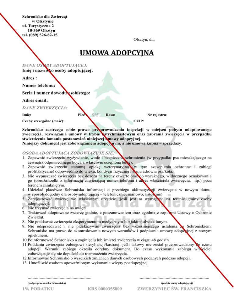 Schronisko dla Zwierząt w Olsztynie ul. Turystyczna 2 10-369 Olsztyn tel. (089) 526-82-15 Olsztyn, dn. UMOWA ADOPCYJNA DANE OSOBY ADOPTUJĄCEJ: Imię i nazwisko osoby adoptującej: Adres : Numer telefonu: Seria i numer dowodu osobistego: Adres email: DANE ZWIERZĘCIA: Imię: Płeć : ♀/♂ Rasa: Cechy szczególne (maść): Nr rejestru: CZIP: Schronisko zastrzega sobie prawo przeprowadzenia inspekcji w miejscu pobytu adoptowanego zwierzęcia, rozwiązania umowy w trybie natychmiastowym oraz zabrania zwierzęcia w przypadku stwierdzenia łamania postanowień niniejszej umowy adopcyjnej. Niniejszy dokument jest zobowiązaniem adopcyjnym, a nie umową kupna – sprzedaży. OSOBA ADOPTUJĄCA ZOBOWIĄZUJĘ SIĘ: 1. Zapewnić zwierzęciu wyżywienie, wodę i bezpieczne schronienie (w przypadku psa mieszkającego na zewnątrz odpowiedniego kojca z właściwie ocieploną budę); 2. Zapewnić zwierzęciu staranną opiekę weterynaryjną (w tym szczepienia ochronne i zabiegi profilaktyczne) odpowiednio do wieku, kondycji fizycznej i stanu zdrowia psa/kota. 3. Nie wypuszczać zwierzęcia bez dozoru na tereny otwarte oraz do wyraźnego, widocznego oznakowania go (obroża/szelki z informacją zawierającą numer telefonu i adres właściciela zwierzęcia, itp.) poza terenem zamkniętym. 4. Udzielać placówce Schroniska informacji o przebiegu aklimatyzacji zwierzęcia w nowym domu, w sposób dogodny dla osoby adoptującej – telefonicznie, mailowo, listownie). 5. Zarejestrować zwierzę we właściwym urzędzie (jeśli jest to wymagane na terenie gminy osoby adoptującej). 6. Nie trzymać zwierzęcia na uwięzi. 7. Traktować adoptowane zwierzę godnie, z poszanowaniem oraz zgodnie z zapisami Ustawy o Ochronie Zwierząt. 8. Nie poddawać zwierzęcia eksperymentom medycznym lub jakimkolwiek innym. 9. Nie odsprzedawać i nie przekazywać zwierzęcia bez wcześniejszego ustalenia ze Schroniskiem. Schronisko ma prawo do skontrolowania nowych warunków i podpisania umowy adopcyjnej z nowym opiekunem. 10. Poinformować Schronisko o zaginięciu lub śmierci zwierzęcia w ciągu 48 godzin. 11. Poddania zwierzęcia zabiegowi sterylizacji/kastracji jeśli takowy nie został przeprowadzony do czasu adopcji. Warunki zabiegu określa odrębny dokument. Do czasu wykonania zabiegu właściciel zobowiązuje się nie dopuścić do rozmnożenia zwierzęcia. 12. Informować Schronisko o wszelkich zmianach danych osobowych podanych podczas adopcji. 13. Umożliwić osobom upoważnionym wykonanie wizyty poadopcyjnej. ...................................................... (podpis osoby adoptującej) (podpis pracownika Schroniska) 1% PODATKU ........................................................... KRS 0000355809 ZWERZYNIEC ŚW. FRANCISZKA