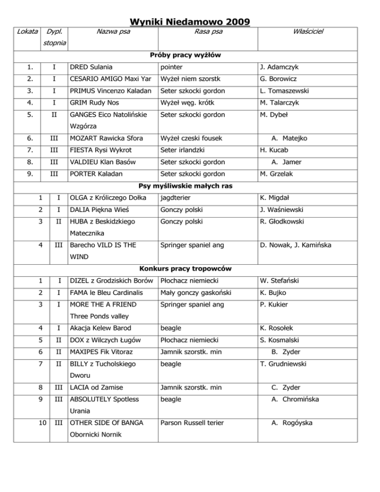 Wyniki Niedamowo 2009 Lokata Dypl. Nazwa psa Rasa psa Właściciel stopnia Próby pracy wyżłów 1. I DRED Sulania pointer J. Adamczyk 2. I CESARIO AMIGO Maxi Yar Wyżeł niem szorstk G. Borowicz 3. I PRIMUS Vincenzo Kaladan Seter szkocki gordon L. Tomaszewski 4. I GRIM Rudy Nos Wyżeł węg. krótk M. Talarczyk 5. II GANGES Eico Natolińskie Seter szkocki gordon M. Dybeł Wzgórza 6. III MOZART Rawicka Sfora Wyżeł czeski fousek 7. III FIESTA Rysi Wykrot Seter irlandzki 8. III VALDIEU Klan Basów Seter szkocki gordon 9. III PORTER Kaladan Seter szkocki gordon A. Matejko H. Kucab A. Jamer M. Grzelak Psy myśliwskie małych ras 1 I OLGA z Króliczego Dołka jagdterier K. Migdał 2 I DALIA Piękna Wieś Gonczy polski J. Waśniewski 3 II HUBA z Beskidzkiego Gonczy polski R. Głodkowski Springer spaniel ang D. Nowak, J. Kamińska Matecznika 4 III Barecho VILD IS THE WIND Konkurs pracy tropowców 1 I DIZEL z Grodziskich Borów Płochacz niemiecki W. Stefański 2 I FAMA le Bleu Cardinalis Mały gonczy gaskoński K. Bujko 3 I MORE THE A FRIEND Springer spaniel ang P. Kukier Three Ponds valley 4 I Akacja Kelew Barod beagle K. Rosołek 5 II DOX z Wilczych Ługów Płochacz niemiecki S. Kosmalski 6 II MAXIPES Fik Vitoraz Jamnik szorstk. min 7 II BILLY z Tucholskiego beagle B. Zyder T. Grudniewski Dworu 8 III LACIA od Zamise Jamnik szorstk. min C. Zyder 9 III ABSOLUTELY Spotless beagle A. Chromińska Parson Russell terier A. Rogóyska Urania 10 III OTHER SIDE Of BANGA Obornicki Nornik
