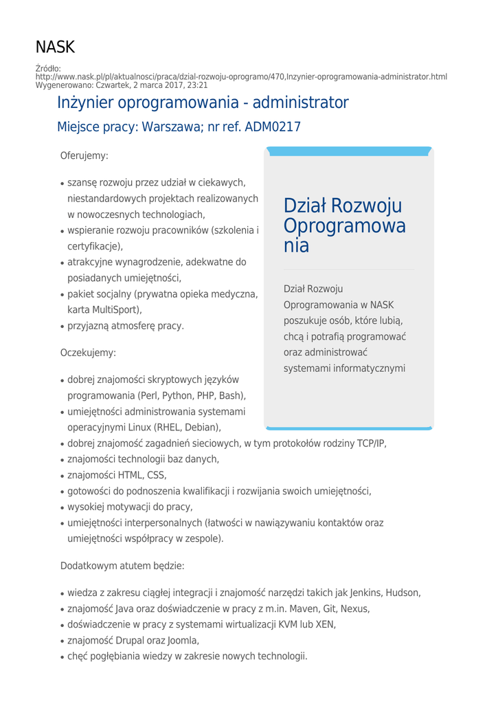 NASK Źródło: http://www.nask.pl/pl/aktualnosci/praca/dzial-rozwoju-oprogramo/470,Inzynier-oprogramowania-administrator.html Wygenerowano: Czwartek, 2 marca 2017, 23:21 Inżynier oprogramowania - administrator Miejsce pracy: Warszawa; nr ref. ADM0217 Oferujemy: ● szansę rozwoju przez udział w ciekawych, niestandardowych projektach realizowanych w nowoczesnych technologiach, ● wspieranie rozwoju pracowników (szkolenia i certyfikacje), ● atrakcyjne wynagrodzenie, adekwatne do posiadanych umiejętności, ● pakiet socjalny (prywatna opieka medyczna, karta MultiSport), ● przyjazną atmosferę pracy. Oczekujemy: ● dobrej znajomości skryptowych języków Dział Rozwoju Oprogramowa nia Dział Rozwoju Oprogramowania w NASK poszukuje osób, które lubią, chcą i potrafią programować oraz administrować systemami informatycznymi programowania (Perl, Python, PHP, Bash), ● umiejętności administrowania systemami operacyjnymi Linux (RHEL, Debian), ● dobrej znajomość zagadnień sieciowych, w tym protokołów rodziny TCP/IP, ● znajomości technologii baz danych, ● znajomości HTML, CSS, ● gotowości do podnoszenia kwalifikacji i rozwijania swoich umiejętności, ● wysokiej motywacji do pracy, ● umiejętności interpersonalnych (łatwości w nawiązywaniu kontaktów oraz umiejętności współpracy w zespole). Dodatkowym atutem będzie: ● wiedza z zakresu ciągłej integracji i znajomość narzędzi takich jak Jenkins, Hudson, ● znajomość Java oraz doświadczenie w pracy z m.in. Maven, Git, Nexus, ● doświadczenie w pracy z systemami wirtualizacji KVM lub XEN, ● znajomość Drupal oraz Joomla, ● chęć pogłębiania wiedzy w zakresie nowych technologii. Zainteresowane osoby prosimy o złożenie swojej aplikacji na stronie: https://rekrutacja.nask.pl