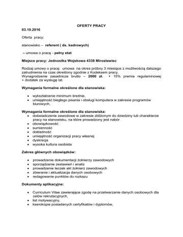 OFERTY PRACY 03.10.2016 Oferta pracy: stanowisko – referent ( ds. kadrowych) – umowa o pracę - pełny etat Miejsce pracy: Jednostka Wojskowa 4338 Mirosławiec Rodzaj umowy o pracę: umowa na okres próbny 3 miesiące z możliwością dalszego zatrudnienia na czas określony zgodnie z Kodeksem pracy. Wynagrodzenie zasadnicze brutto – 2000 zł. + 15% premia regulaminowej + dodatek za wysługę lat. Wymagania formalne określone dla stanowiska: wykształcenie minimum średnie, umiejętność biegłego pisania i obsługi komputera w zakresie programów biurowych, Wymagania formalne określone dla stanowiska: doświadczenie zawodowe w zakresie zbliżonym do dziedziny lub charakterze pracy na stanowisku, na które prowadzony jest nabór obowiązkowość sumienność dokładność umiejętność organizacji pracy własnej dyskrecja wysoka kultura osobista Zakres głównych obowiązków: prowadzenie dokumentacji żołnierzy zawodowych sporządzanie zestawień i analiz prowadzenie teczek akt żołnierz zawodowych zbieranie i aktualizacja danych osobowych redagowanie punktów do rozkazu Dokumenty aplikacyjne: Curriculum Vitae zawierające zgodę na przetwarzanie danych osobowych dla celów rekrutacyjnych, list motywacyjny, kserokopie posiadanych certyfikatów i dyplomów, Miejsce i termin złożenia CV: Dokumenty należy składać osobiście w Kancelarii Jawnej Jednostki Wojskowej 4338 w Mirosławcu, bud. 49 p.11c w godzinach 800 – 1030 i 1230 – 1500 lub przesłać na adres: JEDNOSTKA WOJSKOWA 4338 78-650 Mirosławiec z dopiskiem na kopercie „Oferta zatrudnienia na stanowisko referenta ds. kadrowych w JW. 4338 Mirosławiec”. Termin składania ofert pracy do dnia 17.10.2016r. Inne informacje : Dodatkowe informacje w kwestii naboru można uzyskać pod numerem telefonu: 261 525 534. Dokument złożone przed terminem ogłoszenia o naborze lub które wpłynęły po terminie, zostaną odrzucone. Oferty nie spełniające wymogów formalnych zostaną odrzucone i zniszczone. Jednostka zastrzega sobie prawo do kontaktu z wybranymi osobami oraz unieważnienia naboru bez podania przyczyny.