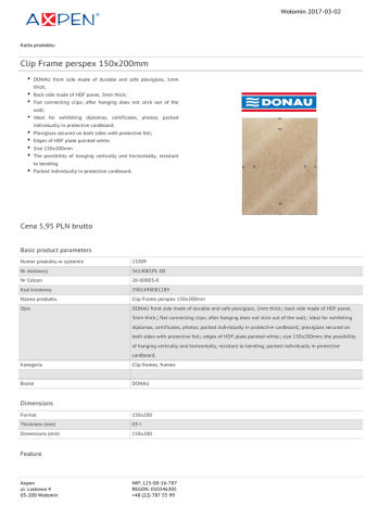 Wołomin 2017-03-02 Karta produktu: Clip Frame perspex 150x200mm DONAU front side made of durable and safe plexiglass, 1mm thick; Back side made of HDF panel, 3mm thick; Flat connecting clips; after hanging does not stick out of the wall; Ideal for exhibiting diplomas, certificates, photos; packed individually in protective cardboard; Plexiglass secured on both sides with protective foil; Edges of HDF plate painted white; Size 150x200mm The possibility of hanging vertically and horizontally, resistant to bending Packed individually in protective cardboard, Cena 5,95 PLN brutto Basic product parameters Numer produktu w systemie 13309 Nr dostawcy 5614001PL-00 Nr Celcen 20-00003-0 Kod kreskowy 5901498081289 Nazwa produktu Clip Frame perspex 150x200mm Opis DONAU front side made of durable and safe plexiglass, 1mm thick;; back side made of HDF panel, 3mm thick;; flat connecting clips; after hanging does not stick out of the wall;; ideal for exhibiting diplomas, certificates, photos; packed individually in protective cardboard;; plexiglass secured on both sides with protective foil;; edges of HDF plate painted white;; size 150x200mm; the possibility of hanging vertically and horizontally, resistant to bending; packed individually in protective cardboard, Kategoria Clip frames, frames Brand DONAU Dimensions Format 150x200 Thickness (mm) 03-I Dimensions (mm) 150x200 Feature Axpen ul. Laskowa 4 05-200 Wołomin NIP: 125-00-16-787 REGON: 010346305 +48 (22) 787 55 99 Wołomin 2017-03-02 Karta katalogowa produktu cd. Clip Frame perspex 150x200mm Offer from 2013-01 Material Plexiglass (perspex)/HDF Type Non-breakable Product Clip frame Replacement Replacement KF15651 Procurement vocabulary CPV 39298200-9 Ramki do obrazków Certifications New product Standard Hit Standard Colour Colour Transparent Pozostałe zdjęcia produktu Serdecznie zapraszamy do współpracy Axpen zespół. Axpen ul. Laskowa 4 05-200 Wołomin NIP: 125-00-16-787 REGON: 010346305 +48 (22) 787 55 99