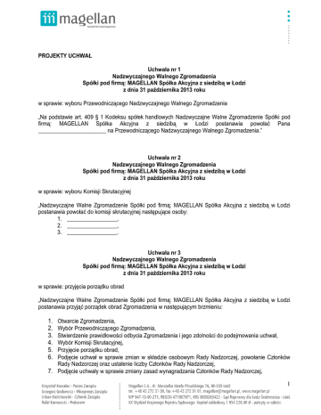 PROJEKTY UCHWAŁ Uchwała nr 1 Nadzwyczajnego Walnego Zgromadzenia Spółki pod firmą: MAGELLAN Spółka Akcyjna z siedzibą w Łodzi z dnia 31 października 2013 roku w sprawie: wyboru Przewodniczącego Nadzwyczajnego Walnego Zgromadzenia „Na podstawie art. 409 § 1 Kodeksu spółek handlowych Nadzwyczajne Walne Zgromadzenie Spółki pod firmą: MAGELLAN Spółka Akcyjna z siedzibą w Łodzi postanawia powołać Pana _______________________ na Przewodniczącego Nadzwyczajnego Walnego Zgromadzenia.” Uchwała nr 2 Nadzwyczajnego Walnego Zgromadzenia Spółki pod firmą: MAGELLAN Spółka Akcyjna z siedzibą w Łodzi z dnia 31 października 2013 roku w sprawie: wyboru Komisji Skrutacyjnej „Nadzwyczajne Walne Zgromadzenie Spółki pod firmą: MAGELLAN Spółka Akcyjna z siedzibą w Łodzi postanawia powołać do komisji skrutacyjnej następujące osoby: 1. _________________, 2. _________________, 3. _________________. Uchwała nr 3 Nadzwyczajnego Walnego Zgromadzenia Spółki pod firmą: MAGELLAN Spółka Akcyjna z siedzibą w Łodzi z dnia 31 października 2013 roku w sprawie: przyjęcia porządku obrad „Nadzwyczajne Walne Zgromadzenie Spółki pod firmą: MAGELLAN Spółka Akcyjna z siedzibą w Łodzi postanawia przyjąć porządek obrad Zgromadzenia w następującym brzmieniu: 1. 2. 3. 4. 5. 6. Otwarcie Zgromadzenia, Wybór Przewodniczącego Zgromadzenia, Stwierdzenie prawidłowości odbycia Zgromadzenia i jego zdolności do podejmowania uchwał, Wybór Komisji Skrutacyjnej, Przyjęcie porządku obrad, Podjęcie uchwał w sprawie zmian w składzie osobowym Rady Nadzorczej, powołanie Członków Rady Nadzorczej oraz ustalenie liczby Członków Rady Nadzorczej, 7. Podjęcie uchwały w sprawie zmiany zasad wynagradzania Członków Rady Nadzorczej, 1 8. Rozpatrzenie wniosku Zarządu Spółki w sprawie zmian w statucie w zakresie zasad dotyczących powoływania i odwoływania Członków Rady Nadzorczej i podjęcie uchwał w przedmiotowym zakresie, 9. Podjęcie uchwały w sprawie wyrażenia zgody na podniesienie do 550.000.000,00 zł (słownie: pięćset pięćdziesięciu milionów złotych) wartości istniejącego Programu Emisji Obligacji Spółki, realizowanego na podstawie umów zawartych dnia 17 stycznia 2007 roku z BRE Bank S.A. z siedzibą w Warszawie, tj. Umowy Dealerskiej i Umowy Agencyjnej, zastąpionych umową Programu z dnia 17 stycznia 2013 roku , 10. Podjęcie uchwały w sprawie wprowadzenia przez Spółkę Programu Opcji Menedżerskich, 11. Podjecie uchwały w sprawie ustalenia zasad przeprowadzenia przez Spółkę Dodatkowego Programu Opcji Menedżerskich, 12. Podjęcie uchwały w sprawie emisji warrantów subskrypcyjnych oraz warunkowego podwyższenia kapitału zakładowego w drodze emisji akcji serii E i serii F z wyłączeniem prawa poboru warrantów subskrypcyjnych i akcji serii E i serii F w celu umożliwienia objęcia akcji osobom biorącym udział w programach motywacyjnych, 13. Podjęcie uchwały w sprawie zmiany statutu Spółki dotyczącej uwzględnienia w treści Statutu warunkowych podwyższeń kapitału zakładowego, 14. Podjęcie uchwały w sprawie wprowadzenia zasad finansowania przez Magellan S.A. obejmowania lub nabywania akcji przez Osoby Uprawnione w rozumieniu Programu Opcji Menedżerskich oraz Dodatkowego Programu Opcji Menedżerskich, 15. Przedstawienie przez Zarząd Spółki informacji o aktualnym stanie dotyczącym celu nabycia akcji własnych Spółki, liczbie i wartości nominalnej nabytych akcji własnych Spółki oraz ich udziale w kapitale zakładowym, 16. Zamknięcie obrad Zgromadzenia. 2 Uchwała nr 4 Nadzwyczajnego Walnego Zgromadzenia Spółki pod firmą: MAGELLAN Spółka Akcyjna z siedzibą w Łodzi z dnia 31 października 2013 roku w sprawie: powołania Pana ____________ do Rady Nadzorczej Spółki Nadzwyczajne Walne Zgromadzenie Spółki pod firmą: MAGELLAN Spółka Akcyjna z siedzibą w Łodzi działając na podstawie §14 ust. 2 i 3 Statutu Spółki z dniem 01 listopada 2013 roku powołuje do Rady Nadzorczej Spółki Pana ______________, na wspólną, trzyletnią kadencję, która zakończy się z dniem 09 maja 2015 roku. Nadzwyczajne Walne Zgromadzenie Spółki pod firmą: Magellan Spółka Akcyjna z siedzibą w Łodzi, działając na zasadzie art. 392 §1 Kodeksu Spółek Handlowych w związku z §16 ust.6 Statutu Spółki postanawia, iż od dnia 31 października 2013 roku Członkowi Rady Nadzorczej Panu _________________ przysługuje/nie przysługuje wynagrodzenie z tytułu pełnienia funkcji w Radzie Nadzorczej. Uzasadnienie Zgodnie z art. 392 Kodeksu Spółek Handlowych w związku z §16 ust.6 Statutu Spółki organ uprawniony do powołania Członków Rady Nadzorczej może postanowić, iż Radzie Nadzorczej bądź poszczególnym jej członkom nie przysługuje wynagrodzenie. Uchwała nr 5 Nadzwyczajnego Walnego Zgromadzenia Spółki pod firmą: MAGELLAN Spółka Akcyjna z siedzibą w Łodzi z dnia 31 października 2013 roku w sprawie: powołania Pana ____________ do Rady Nadzorczej Spółki Nadzwyczajne Walne Zgromadzenie Spółki pod firmą: MAGELLAN Spółka Akcyjna z siedzibą w Łodzi działając na podstawie §14 ust. 2 i 3 Statutu Spółki z dniem 01 listopada 2013 roku powołuje do Rady Nadzorczej Spółki Pana ______________, na wspólną, trzyletnią kadencję, która zakończy się z dniem 09 maja 2015 roku. Nadzwyczajne Walne Zgromadzenie Spółki pod firmą: Magellan Spółka Akcyjna z siedzibą w Łodzi, działając na zasadzie art. 392 §1 Kodeksu Spółek Handlowych w związku z §16 ust.6 Statutu Spółki postanawia, iż od dnia 31 października 2013 roku Członkowi Rady Nadzorczej Panu _________________ przysługuje/nie przysługuje wynagrodzenie z tytułu pełnienia funkcji w Radzie Nadzorczej. Uzasadnienie 3 Zgodnie z art. 392 Kodeksu Spółek Handlowych w związku z §16 ust.6 Statutu Spółki organ uprawniony do powołania Członków Rady Nadzorczej może postanowić, iż Radzie Nadzorczej bądź poszczeg