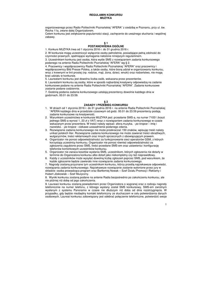 REGULAMIN KONKURSU MUZYKA organizowanego przez Radio Politechniki Poznańskiej “AFERA” z siedzibą w Poznaniu, przy ul. św. Rocha 11a, zwane dalej Organizatorem. Celem konkursu jest zwiększenie popularności stacji, zachęcenie do uważnego słuchania i wspólnej zabawy. §1 POSTANOWIENIA OGÓLNE 1. Konkurs MUZYKA trwa od 1 stycznia 2016 r. do 31 grudnia 2016 r. 2. W konkursie mogą uczestniczyć wyłącznie osoby pełnoletnie, posiadające pełną zdolność do czynności prawnych, spełniające wymagania nałożone niniejszym regulaminem. 3. Uczestnikiem konkursu jest osoba, która wyśle SMS z rozwiązaniem zadania konkursowego podanego na antenie Radia Politechniki Poznańskiej “AFERA” wg § 2. 4. Pracownicy i współpracownicy Radia Politechniki Poznańskiej “AFERA” oraz pracownicy i współpracownicy Bild Presse Polska, a także osoby, które biorą udział w organizowaniu konkursu, wraz z krewnymi w linii prostej (np. rodzice, mąż, żona, dzieci, wnuki) oraz rodzeństwo, nie mogą brać udziału w konkursie. 5. Laureatami konkursu jest dowolna liczba osób, wskazana przez prezenterów. 6. Laureatami konkursu są osoby, które w sposób najbardziej kreatywny odpowiedzą na zadanie konkursowe podane na antenie Radia Politechniki Poznańskiej “AFERA”. Zadanie konkursowe zostanie podane codziennie. 7. Godzinę podania zadania konkursowego ustalają prezenterzy dowolnie każdego dnia w godzinach, 00.01 do 23.59. §2 ZASADY I PRZEBIEG KONKURSU 1. W dniach od 1 stycznia 2016 r. do 31 grudnia 2016 r. na antenie Radia Politechniki Poznańskiej “AFERA każdego dnia w przedziale czasowym od godz. 00.01 do 23.59 prezenterzy podają zadanie konkursowe na kreatywność. 2. Warunkiem uczestnictwa w konkursie MUZYKA jest: przesłanie SMS-a, na numer 71051 (koszt jednego SMS-a wynosi 1, 23 zł z VAT) wraz z rozwiązaniem zadania konkursowego w czasie wskazanym przez prezentera. W treści należy wpisać: afera.muzyka. - po kropce – imię i nazwisko. - po kropce - ciekawe uzasadnienie podanego zdania. 3. Rozwiązanie zadania konkursowego nie może przekraczać 150 znaków, wpisując treść należy unikać polskich liter. Rozwiązanie zadania konkursowego nie może zawierać treści obraźliwych, wulgaryzmów, treści reklamowych oraz innych sprzecznych z obowiązującym prawem. 4. Organizator nie ponosi odpowiedzialności za funkcjonowanie sieci operatorów GSM, z których korzystają uczestnicy konkursu. Organizator nie ponosi również odpowiedzialności za zgłoszenia zagubione przez SMS, treści przesłane SMS-em oraz ustawienia i konfigurację telefonów komórkowych uczestników konkursu. 5. Organizator nie zwraca kosztów wysłania SMS, uczestnikom, których zgłoszenia nie dotarły w terminie do Organizatora konkursu albo dotarł jako niekompletny czy też nieprawidłowy. 6. Każdy z uczestników może wysyłać dowolną liczbę zgłoszeń poprzez SMS, pod warunkiem, że każde zgłoszenie będzie zawierało inne rozwiązanie zadania konkursowego. 7. Nagrody zostaną przyznane tym uczestnikom konkursu, którzy prześlą najciekawsze odpowiedzi, rozwiązania zadania konkursowego. Najciekawsze rozwiązanie zostanie wyłonione przez jury w składzie: osoba prowadząca program oraz Bartłomiej Nowak – Szef Działu Promocji i Reklamy i Hubert Jóskowiak – Szef Muzyczny. 8. Wyniki konkursu zostaną podane na antenie Radia bezpośrednio po zakończeniu konkursu, ale nie później niż dobę od jego zakończenia. 9. Laureaci konkursu zostaną powiadomieni przez Organizatora o wygranej oraz o rodzaju nagrody telefonicznie na numer telefonu, z którego wysłany został SMS konkursowy, SMS-em zwrotnym wysłanym z systemu Panoramix w czasie nie dłuższym niż doba od dnia rozstrzygnięcia. W przypadku, gdy będzie niezbędny kontakt telefoniczny ze słuchaczem w celu potwierdzenia danych osobowych, Laureat konkursu zobowiązany jest odebrać połączenie telefoniczne, potwierdzić swoje 1 uczestnictwo w konkursie poprzez odpowiedź na zadane pytanie: „Czy brał Pan/Pani udział w konkursie?” oraz przesłać na adres Organizatora swoje dane osobowe (imię, nazwisko, adres zameldowania lub zamieszkania, datę urodzenia oraz numer telefonu). Próba uzyskania połączenia z laureatem podejmowana jest co najmniej dwukrotnie w ciągu jednej godziny, przy czym za każdym razem oczekiwanie na połączenie powinno obejmować co najmniej 5 sygnałów przy braku odpowiedzi ze strony laureata. W przypadku sygnału "zajęty", następna próba połączenia zostanie przeprowadzona po 60 sekundach. W przypadku rozłączenia połączenia w trakcie rozmowy, próba ponownego połączenia podejmowana jest według wyżej opisanej procedury. W przypadku braku możliwości uzyskania połączenia telefonicznego z Laureatem zgodnie z opisaną powyżej procedurą, zostanie on poinformowany za pomocą SMS-a na numer telefonu, z którego wysłany został SMS konkursowy o terminie (wyrażonym w formacie DD-MM-RRRR) i sposobie spełnienia warunków formalnych koniecznych do przyznania nagrody. 10. Nagrody zostaną wydane Laureatom w terminie 15 dni od dnia rozstrzygnięcia konkursu. Nagrody nie odebrane w terminie ulegają przepadkowi na rzecz Organizatora. 11. Laureatom konkursu nie przysługuje prawo otrzymania ekwiwalentu pieniężnego w zamian za nagrodę. §3 NAGRODY 1. Nagrody w konkursie MUZYKA to płyty lub zaproszenia na koncerty. 2. Pula nagród to minimum 1 płyta/zaproszenie dziennie, wartość jednej nagrody wynosi minimum 10 zł. W sumie wartość nagród nie przekracza 600 zł miesięcznie. §4 REKLAMACJE 1. Wszelkie reklamacje mogą być kierowane do powołanej przez Organizatora Komisji Reklamacyjnej, na adres Radio Politechniki Poznańskiej “AFERA, ul. św. Rocha 11a, 61-142 Poznań. Reklamacje powinny być składane w formie pisemnej, w terminie 7 dni od dnia rozstrzygnięcia konkursu. Wszelkie reklamacje, które wpłyną do Komisji Reklamacyjnej po wyznaczonym terminie nie bę