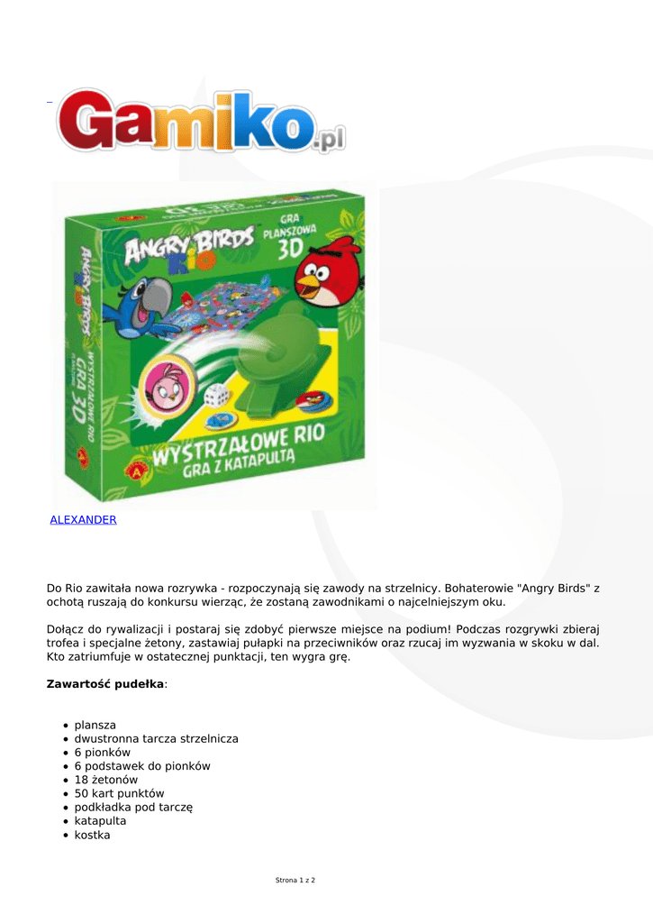 ALEXANDER Do Rio zawitała nowa rozrywka - rozpoczynają się zawody na strzelnicy. Bohaterowie "Angry Birds" z ochotą ruszają do konkursu wierząc, że zostaną zawodnikami o najcelniejszym oku. Dołącz do rywalizacji i postaraj się zdobyć pierwsze miejsce na podium! Podczas rozgrywki zbieraj trofea i specjalne żetony, zastawiaj pułapki na przeciwników oraz rzucaj im wyzwania w skoku w dal. Kto zatriumfuje w ostatecznej punktacji, ten wygra grę. Zawartość pudełka: plansza dwustronna tarcza strzelnicza 6 pionków 6 podstawek do pionków 18 żetonów 50 kart punktów podkładka pod tarczę katapulta kostka Strona 1 z 2 instrukcja Wiek 6+ Liczba graczy 2-6 Czas gry 30 minut Instrukcja polska Wydanie polskie Producent Alexander Strona 2 z 2