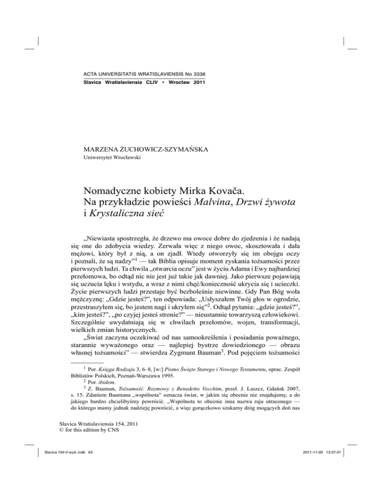 ACTA UNIVERSITATIS WRATISLAVIENSIS No 3336 Slavica Wratislaviensia CLIV • Wroc³aw 2011 MARZENA ŻUCHOWICZ-SZYMAŃSKA Uniwersytet Wrocławski Nomadyczne kobiety Mirka Kovača. Na przykładzie powieści Malvina, Drzwi żywota i Krystaliczna sieć „Niewiasta spostrzegła, że drzewo ma owoce dobre do zjedzenia i że nadają się one do zdobycia wiedzy. Zerwała więc z niego owoc, skosztowała i dała mężowi, który był z nią, a on zjadł. Wtedy otworzyły się im obojgu oczy i poznali, że są nadzy”1 — tak Biblia opisuje moment zyskania tożsamości przez pierwszych ludzi. Ta chwila „otwarcia oczu” jest w życiu Adama i Ewy najbardziej przełomowa, bo odtąd nic nie jest już takie jak dawniej. Jako pierwsze pojawiają się uczucia lęku i wstydu, a wraz z nimi chęć/konieczność ukrycia się i ucieczki. Życie pierwszych ludzi przestaje być bezboleśnie niewinne. Gdy Pan Bóg woła mężczyznę: „Gdzie jesteś?”, ten odpowiada: „Usłyszałem Twój głos w ogrodzie, przestraszyłem się, bo jestem nagi i ukryłem się”2. Odtąd pytania: „gdzie jesteś?”, „kim jesteś?”, „po czyjej jesteś stronie?” — nieustannie towarzyszą człowiekowi. Szczególnie uwydatniają się w chwilach przełomów, wojen, transformacji, wielkich zmian historycznych. „Świat zaczyna oczekiwać od nas samookreślenia i posiadania poważnego, starannie wyważonego oraz — najlepiej bystrze dowiedzionego — obrazu własnej tożsamości” — stwierdza Zygmunt Bauman3. Pod pojęciem tożsamości 1 Por. Księga Rodzaju 3, 6–8, [w:] Pismo Święte Starego i Nowego Testamentu, oprac. Zespół Biblistów Polskich, Poznań-Warszawa 1995. 2 Por. ibidem. 3 Z. Bauman, Tożsamość. Rozmowy z Benedetto Vecchim, przeł. J. Łaszcz, Gdańsk 2007, s. 15. Zdaniem Baumana „wspólnota” oznacza świat, w jakim się obecnie nie znajdujemy, a do jakiego bardzo chcielibyśmy powrócić. „Wspólnota to obecnie inna nazwa raju utraconego — do którego mamy jednak nadzieję powrócić, a więc gorączkowo szukamy dróg mogących doń nas Slavica Wratislaviensia 154, 2011 © for this edition by CNS Slavica 154-II wyd..indb 63 2011-11-09 13:37:47 64 • Marzena Żuchowicz-Szymańska rozumie on kategorię podlegającą negocjacji i odwoływalną, na którą wpływ mają własne decyzje, działania oraz sposób wcielania ich w życie. Według Baumana myśl o posiadaniu tożsamości nie przychodzi ludziom do głowy tak długo, jak długo gdzieś „przynależą”, jak długo nie mają alternatywy. Takie myśli mogą się pojawiać dopiero w postaci zadania, które staje przed nami i którego nie da się „odfajkować” raz na zawsze4. O tym, że tożsamość nie jest czymś danym raz na zawsze, przekonał się także Mirko Kovač. Można nawet powiedzieć, że na własnej skórze. Pisarz urodził się na pograniczu czarnogórsko-hercegowińskim w 1938 roku jako syn Chorwata i Czarnogórki. Nie było to całkiem zwyczajne pogranicze, bo przez znaczną część jego życia nie istniała w tym miejscu granica formalna. Do chwili rozpadu socjalistycznej Jugosławii Kovač nie musiał odpowiadać na pytanie, z którym narodem czuje się mocniej związany. Sytuacja diametralnie się zmieniła w ostatniej dekadzie XX wieku. Wtedy właśnie stał się rozumianym po Baumanowsku człowiekiem w ruchu5, czy też nawiązując do historii Adama i Ewy — wygnańcem z bezpiecznej krainy. Otrzymał wezwanie do samookreślenia. Twórczość Kovača od początku nosiła ciężkie autobiograficzne brzemię, nic więc dziwnego, że przed podobnym wyzwaniem stawia bohaterów swoich powieści. Mam tu na myśli zwłaszcza wydaną po raz pierwszy w 1971 roku powieść Malvina6, Drzwi żywota (Vrata od utrobe)7 oraz Krystaliczną sieć (Kristalne rešetke)8. Akcja tej ostatniej toczy się w Belgradzie, na przełomie lat 60. i 70., w podziemnym świecie bohemy artystycznej, handlarzy i zbieraczy staroci. Główny bohater/narrator, alter ego autora, nie znajduje miejsca, które mógłby uznać za swoje „naturalne środowisko”, nieustannie zmienia miejsce pobytu, role, a nawet pozycję społeczną, oscylując między różnymi opozycjami. Nie ma gruntu, na którym mógłby się oprzeć, ani miejsca, do którego mógłby w pełni pasować. Pod wieczór przed wyjazdem znów dopadły mnie lęki. Chociaż już wcześniej podróże były dla mnie problemem, mogę jednak powiedzieć, że dość się napodróżowałem, docierając aż na krańce rozmaitych światów. I wciąż nie wiem, czy podróżowałem do odległych krajów, czy też — udając się dokądś, najczęściej tkwiłem w tym samym miejscu, jak człowiek, który nie ma się od czego oddalić (KS, s. 350). doprowadzić” (idem, Wspólnota. W poszukiwaniu bezpieczeństwa w niepewnym świecie, przeł. J. Margański, Kraków 2008, s. 8). 4 Por. ibidem, s. 14. 5 Zdaniem Baumana żywiołowy, nieuregulowany i wymykający się politycznej kontroli charakter procesów globalizacyjnych zaowocował powstaniem nowego typu „pogranicza” w postaci planetarnej „przestrzeni przepływów”. Krucha i nieuleczalnie niepewna równowaga sił panująca na owym „pograniczu” opiera się na „wzajemnie gwarantowanym zagrożeniu” (por. Z. Bauman, Życie na przemiał, przeł. T. Kunz, Kraków 2004, s. 16). 6 M. Kovač, Malvina. Životopis Malvine Trifković, Beograd 2009. Dalej w tekście jako M z paginacją tego wydania. 7 M. Kovač, Drzwi żywota, przeł. G. Łatuszyński, Łódź 1988. 8 M. Kovač, Krystaliczna sieć, przeł. D.J. Ćirlić, Sejny 2006. Dalej w tekście jako KS z paginacją tego wydania. Slavica Wratislaviensia 154, 2011 © for this edition by CNS Slavica 154-II wyd..indb 64 2011-11-09 13:37:47 Nomadyczne kobiety Mirka Kovača • 65 Jest to — odpowiednio udramatyzowany — opis procesów, które według Baumana dziś zdają się powszechne i niemal uniwersalne: W naszych czasach świat został pokawałkowany na luźno powiązane fragmenty,