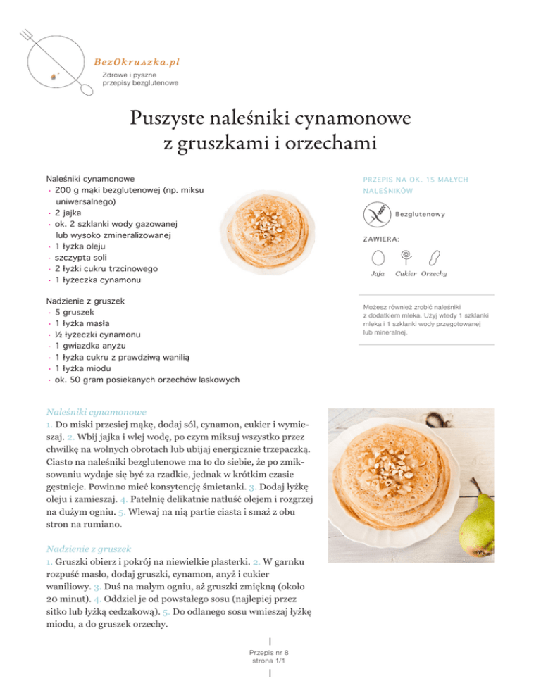 Naleśniki cynamonowe ·· 200 g mąki bezglutenowej (np. miksu uniwersalnego) ·· 2 jajka ·· ok. 2 szklanki wody gazowanej lub wysoko zmineralizowanej ·· 1 łyżka oleju ·· szczypta soli ·· 2 łyżki cukru trzcinowego ·· 1 łyżeczka cynamonu PR ZEPIS NA OK. 15 MAŁYCH NALEŚNIKÓW Bezglutenow y Z AWIER A: Jaja Nadzienie z gruszek ·· 5 gruszek ·· 1 łyżka masła ·· ½ łyżeczki cynamonu ·· 1 gwiazdka anyżu ·· 1 łyżka cukru z prawdziwą wanilią ·· 1 łyżka miodu ·· ok. 50 gram posiekanych orzechów laskowych Cukier Orzechy Możesz również zrobić naleśniki z dodatkiem mleka. Użyj wtedy 1 szklanki mleka i 1 szklanki wody przegotowanej lub mineralnej. Naleśniki cynamonowe 1. Do miski przesiej mąkę, dodaj sól, cynamon, cukier i wymieszaj. 2. Wbij jajka i wlej wodę, po czym miksuj wszystko przez chwilkę na wolnych obrotach lub ubijaj energicznie trzepaczką. Ciasto na naleśniki bezglutenowe ma to do siebie, że po zmiksowaniu wydaje się być za rzadkie, jednak w krótkim czasie gęstnieje. Powinno mieć konsytencję śmietanki. 3. Dodaj łyżkę oleju i zamieszaj. 4. Patelnię delikatnie natłuść olejem i rozgrzej na dużym ogniu. 5. Wlewaj na nią partie ciasta i smaż z obu stron na rumiano. Nadzienie z gruszek 1. Gruszki obierz i pokrój na niewielkie plasterki. 2. W garnku rozpuść masło, dodaj gruszki, cynamon, anyż i cukier waniliowy. 3. Duś na małym ogniu, aż gruszki zmiękną (około 20 minut). 4. Oddziel je od powstałego sosu (najlepiej przez sitko lub łyżką cedzakową). 5. Do odlanego sosu wmieszaj łyżkę miodu, a do gruszek orzechy. Przepis nr 8 strona 1/1