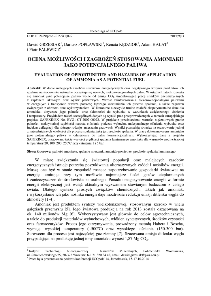 Proceedings of ECOpole DOI: 10.2429/proc.2015.9(1)029 2015;9(1) Dawid GRZESIAK1, Dariusz POPŁAWSKI1, Renata KĘDZIOR1, Adam HAŁAT1 i Piotr FALEWICZ1 OCENA MOŻLIWOŚCI I ZAGROŻEŃ STOSOWANIA AMONIAKU JAKO POTENCJALNEGO PALIWA EVALUATION OF OPPORTUNITIES AND HAZARDS OF APPLICATION OF AMMONIA AS A POTENTIAL FUEL Abstrakt: W dobie malejących zasobów surowców energetycznych oraz negatywnego wpływu produktów ich spalania na środowisko naturalne poszukuje się nowych, niekonwencjonalnych paliw. W ostatnich latach rozważa się amoniak jako potencjalne paliwo wolne od emisji CO2, umożliwiające pracę silników pneumatycznych z zapłonem iskrowym oraz ogniw paliwowych. Wzrost zainteresowania niekonwencjonalnymi paliwami w energetyce i transporcie stwarza potrzebę lepszego zrozumienia ich procesu spalania, a także zagrożeń związanych z obrotem oraz wykorzystaniem. W literaturze niezwykle trudno znaleźć eksperymentalne dane dla amoniaku, dotyczące jego palności oraz skłonności do wybuchu w warunkach zwiększonego ciśnienia i temperatury. Przykładem takich szczególnych danych są wyniki prac przeprowadzonych w ramach europejskiego projektu SAFEKINEX No. EVG1-CT-2002-00072. W projekcie przedstawiono wartości stężeniowych granic palności, maksymalnej szybkości narostu ciśnienia podczas wybuchu, maksymalnego ciśnienia wybuchu oraz indeksu deflagracji dla różnego rodzaju mieszanin gazowych. Wyniki pozwalają również na oszacowanie jednej z najważniejszych wielkości dla procesu spalania, jaką jest prędkość spalania. W pracy dokonano oceny amoniaku jako potencjalnego paliwa w odniesieniu do paliw konwencjonalnych. Wykorzystując dane z projektu SAFEKINEX, oszacowano także wartości prędkości spalania laminarnego amoniaku dla warunków podwyższonej temperatury 20, 100, 200, 250ºC przy ciśnieniu 1 i 5 bar. Słowa kluczowe: palność amoniaku, spalanie mieszanki amoniak-powietrze, prędkość spalania laminarnego W miarę zwiększania się światowej populacji oraz malejących zasobów energetycznych istnieje potrzeba poszukiwania alternatywnych źródeł i nośników energii. Muszą one być w stanie zaspokoić rosnące zapotrzebowanie gospodarki światowej na energię, emitując przy tym możliwie najmniejsze ilości gazów cieplarnianych i zanieczyszczeń do środowiska naturalnego. Ponadto magazynowanie energii w formie energii elektrycznej jest wciąż aktualnym wyzwaniem stawianym badaczom z całego świata. Dlatego synteza prostych związków chemicznych, takich jak amoniak, i wykorzystanie ich jako nośnika energii daje możliwość redukcji emisji ditlenku węgla do atmosfery [1-4]. Amoniak jest produktem syntezy wielkotonażowej, stosowanym szeroko w wielu gałęziach przemysłu [5]. Jego światowa produkcja na rok 2013 została oszacowana na ok. 140 milionów Mg [6]. Wykorzystywany jest głównie do celów agrotechnicznych, a także do produkcji materiałów wybuchowych, włókien syntetycznych, środków czystości oraz farmaceutyków. Proces jego otrzymywania, prowadzony metodą Habera i Boscha, wymaga wysokiej temperatury (~500ºC) oraz wysokiego ciśnienia (150-300 bar). Surowcem dla procesu jest najczęściej gaz ziemny [7]. Szacowana emisja ditlenku węgla przypadająca na produkcję jednej tony amoniaku wynosi 1,87 Mg CO2. 1 Instytut Technologii Nieorganicznej i Nawozów Mineralnych, Politechnika ul. Smoluchowskiego 25, 50-372 Wrocław, tel. 71 320 34 42, email: [email protected] * Praca była prezentowana podczas konferencji ECOpole’14, Jarnołtówek, 15-17.10.2014 Wrocławska, 224 Dawid Grzesiak, Dariusz Popławski, Renata Kędzior, Adam Hałat i Piotr Falewicz Tak duża ilość emitowanego ditlenku węgla oraz złożoność i trudności techniczne związane z prowadzeniem procesu metodą Habera i Boscha zmuszają do poszukiwania alternatywnych źródeł wodoru, a także nowych procesów syntezy amoniaku [6-8]. Amoniak jako nośnik energii Największe zainteresowanie amoniakiem jako paliwem wynika z faktu, że zarówno jego synteza, jak i spalanie nie muszą być obarczone emisją ditlenku węgla [1, 4]. Proces spalania jest niezwykle złożonym procesem o dużej liczbie reakcji elementarnych i produktów pośrednich [9, 10]. Głównymi produktami spalania amoniaku w powietrzu są azot, para wodna, a także tlenki azotu, których ilość jest zależna od rodzaju mieszanki i warunków spalania [11]. W przypadku ich nadmiernej emisji w gazach spalinowych proponuje się selektywną redukcję katalityczną jako metodę ich usuwania. Surowcem dla tego procesu jest amoniak [12]. Przez ostatnie lata za najbardziej obiecujące paliwo przyszłości uważany jest wodór, jednak z powodu jego niskiej temperatury krytycznej wciąż trwają prace nad nowymi metodami jego efektywnego magazynowania [13]. Dla zastosowań danego paliwa w transporcie bardzo ważne są: masa, objętość zbiornika paliwowego, zasięg oraz szybkość i łatwość jego uzupełnienia/regeneracji. Niska objętościowa gęstość energii wodoru powoduje, że amoniak zyskuje przewagę jako paliwo transportowe. Sprężony do 10 bar amoniak wykazuje objętościową gęstość energii (13,6 GJ m–3) większą niż w przypadku wodoru przechowywanego w postaci wodorków metali pod ciśnieniem 14 bar (3,6 GJ m–3), a nawet aktualnie wykorzystywanych paliw, np. metan sprężony do 250 bar (10,4 GJ m–3). Amoniak może być również bezpośrednim źródłem atomów wodoru w ogniwach paliwowych oraz silnikach z zapłonem iskrowym [2]. Synteza amoniaku metodą Habera i Boscha wiąże się z procesem otrzymywania wodoru. Obecnie najpopularniejszymi metodami otrzymywania wodoru są konwersja metanu parą wodną oraz zgazowanie paliw stałych. Oznacza to, że prawie cały produkowany aktualnie wodór pochodzi z procesów, w których wykorzystywane są paliwa kopalne. Wolne od emisji CO2 paliwo nie może być obciążone nadmierną emisją na żadnym etapie jego produkcji. Wymusza to konie