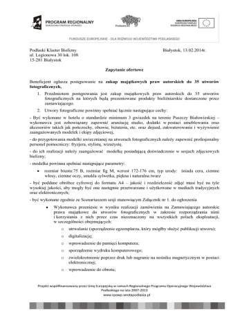 Białystok, 13.02.2014r. Podlaski Klaster Bielizny ul. Legionowa 30 lok. 108 15-281 Białystok Zapytanie ofertowe Beneficjent ogłasza postępowanie na zakup majątkowych praw autorskich do 35 utworów fotograficznych, 1. Przedmiotem postępowania jest zakup majątkowych praw autorskich do 35 utworów fotograficznych na których będą prezentowane produkty bieliźniarskie dostarczone przez zamawiającego. 2. Utwory fotograficzne powinny spełniać łącznie następujące cechy: - Być wykonane w hotelu o standardzie minimum 3 gwiazdek na terenie Puszczy Białowieskiej – wykonawca jest zobowiązany zapewnić aranżację studio, dodatki w postaci umeblowania oraz akcesoriów takich jak pończochy, obuwie, biżuteria, etc. oraz dojazd, zakwaterowanie i wyżywienie zaangażowanych modelek i ekipy zdjęciowej, - do przygotowania modelki uwiecznianej na utworach fotograficznych należy zapewnić profesjonalny personel pomocniczy: fryzjera, stylistę, wizażystę. - do ich realizacji należy zaangażować modelkę posiadającą doświadczenie w sesjach zdjęciowych bielizny; - modelka powinna spełniać następujące parametry: rozmiar biustu:75 B, rozmiar fig M, wzrost 172-176 cm, typ urody: śniada cera, ciemne włosy, ciemne oczy, smukła sylwetka, piękna i naturalna twarz - być poddane obróbce cyfrowej do formatu A4 – jakość i rozdzielczość zdjęć musi być na tyle wysokiej jakości, aby mogły być one następnie przetwarzane i użytkowane w mediach tradycyjnych oraz elektronicznych; - być wykonane zgodnie ze Scenariuszem sesji stanowiącym Załącznik nr 1. do ogłoszenia Wykonawca przeniesie w wyniku realizacji zamówienia na Zamawiającego autorskie prawa majątkowe do utworów fotograficznych w zakresie rozporządzania nimi i korzystania z nich przez czas nieoznaczony na wszystkich polach eksploatacji, w szczególności obejmujących: o utrwalanie (sporządzenie egzemplarza, który mógłby służyć publikacji utworu); o digitalizację; o wprowadzenie do pamięci komputera; o sporządzenie wydruku komputerowego; o zwielokrotnienie poprzez druk lub nagranie na nośniku magnetycznym w postaci elektronicznej; o wprowadzenie do obrotu; Projekt współfinansowany przez Unię Europejską w ramach Regionalnego Programu Operacyjnego Województwa Podlaskiego na lata 2007-2013 o nieodpłatne wypożyczenie lub udostępnienie zwielokrotnionych egzemplarzy; o wprowadzenie w całości lub w części do sieci komputerowej Internet w sposób umożliwiający transmisję odbiorczą przez zainteresowanego użytkownika łącznie z utrwalaniem materiałów w pamięci RAM wraz z prawem do dokonywania opracowań i zmian, na terytorium Rzeczypospolitej Polskiej oraz poza jej granicami, a także prawem do wykonywania zależnego prawa autorskiego. 3. Zamawiający nie dopuszcza składania ofert częściowych. 4. Zamawiający nie dopuszcza możliwości powierzenia części zamówienia podwykonawcom. 5. Oferty wypełnione wg załączonego wzoru prosimy kierować na nasz adres tradycyjną drogą pocztową: Adres do korespondencji: ul. Legionowa 30 lok. 108, 15-281 Białystok, mailem na adres: [email protected] lub faxem – nr 85 742 02 47. 6. Ostateczny termin składania ofert to 19.02.2014 g. 9:00 7. Maksymalny termin realizacji zamówienia do 31.03.2014r. 8. Kryterium wyboru oferty: - cena – waga 100 % - 100 pkt. Sposób liczenia w/w kryteriów - (Najniższa cena/ cena ocenianej oferty) * 100 9. Okres ważności oferty – co najmniej 1 miesiąc od dnia upływu terminu składania ofert . 10. Oferty złożone po terminie nie będą rozpatrywane. 11. Dodatkowe informacje można uzyskać pod nr tel/fax 85 742 02 47; 12. Strona internetowa na której zamieszczono ogłoszenie spkb.com.pl ………………………… (podpis i pieczęć) Projekt współfinansowany przez Unię Europejską w ramach Regionalnego Programu Operacyjnego Województwa Podlaskiego na lata 2007-2013 Załącznik nr 1. do ogłoszenia Scenariusz sesji 1. Typ sesji: studyjna (Hotel o standardzie minimum 3 gwiazdek na terenie Puszczy Białowieskiej) 2. Długość sesji: 1 dzień 3. Termin organizacji sesji: luty 2014r. 4. Temat przewodni: carska Rosja 5. Opis sesji: Sesja zdjęciowa nowej kolekcji bielizny dla sezonu jesień-zima 2014-2015 odbędzie się w sercu Białowieskiej Puszczy, tam gdzie wpływające na siebie wzajemnie tradycje wschodu i zachodu wykształciły wyjątkową kulturę Podlasia. Białowieża to w XIX wieku miejsce rezydencji cara Rosji Aleksandra III, który upodobał sobie to miejsce jak żadne inne w całym swym rozległym kraju. Jako jedna z najpotężniejszych osób w ówczesnym świecie pozwolił sobie na budowę pałacu niezwykłego, pełnego przepychu i wygód, dzięki którym mroźne podlaskie zimy stawały się jedynie urokliwym pejzażem za oknem. Udawał się tam by zakosztować wyjątkowych darów jakie dawała prastara puszcza. Urządzane przez niego polowania na białowieskie żubry przeszły do miejscowych legend. Chcemy by nowa kolekcja bielizny skierowana na sezon jesienno-zimowy zyskała na zdjęciach ten sam urok: wrażenie ciepłej przystani w mrozie codzienności. By to osiągnąć, stylizacja nawiąże do czasów carskiej Rosji i tej niepowtarzalnej atmosfery sąsiedztwa prastarej Białowieskiej Puszczy. Wykorzystane zostaną pomieszczenia Hotelu w Puszczy Białowieskiej , z których kilka ma być inspirowanych XIX wieczną modłą jak np. sauna cedrowa o rustykalnych wykończeniach. Dla ukazania przepychu i blichtru tak powszechnego w otoczeniu carów, a także podkreślenia srogich zim Podlasia, modelka będzie mieć na sobie ciężkie okrycia takie jak futrzane kurtki, płaszcze, czapki oraz mufki. Całość carskiej sesji mają wzbogacić zdjęcia w innych tematycznie pomieszczeniach hotelu, stylistycznie odmiennych, acz historycznie uzasadnionych, bowiem zawierających się w rozległym imperium XIX wiecznej Rosji. Zarówno bowiem wnętrza o nucie orientalnej jak i dalekowschodnie bu