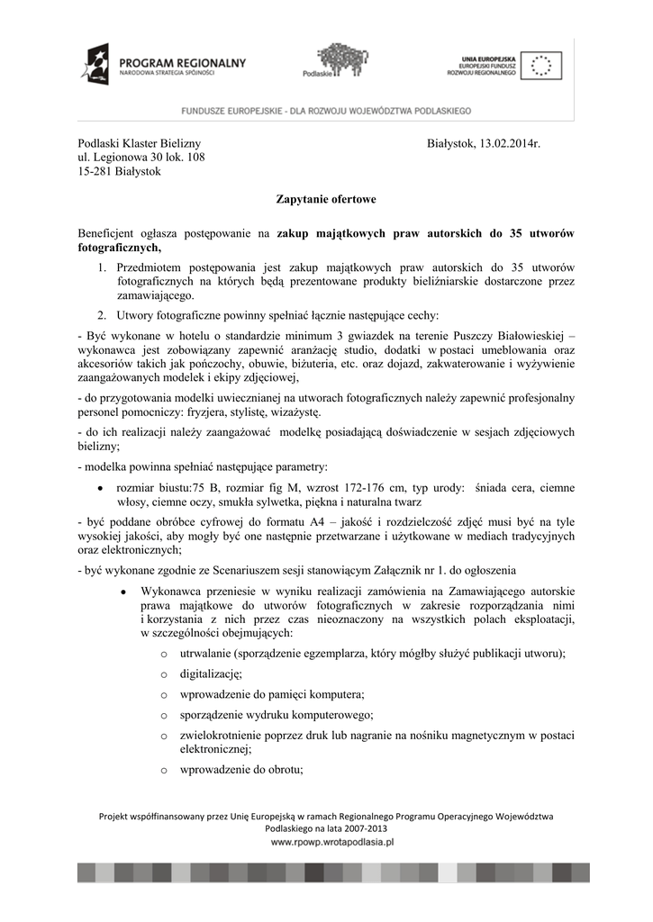 Podlaski Klaster Bielizny Białystok, 13.02.2014r. ul. Legionowa 30
