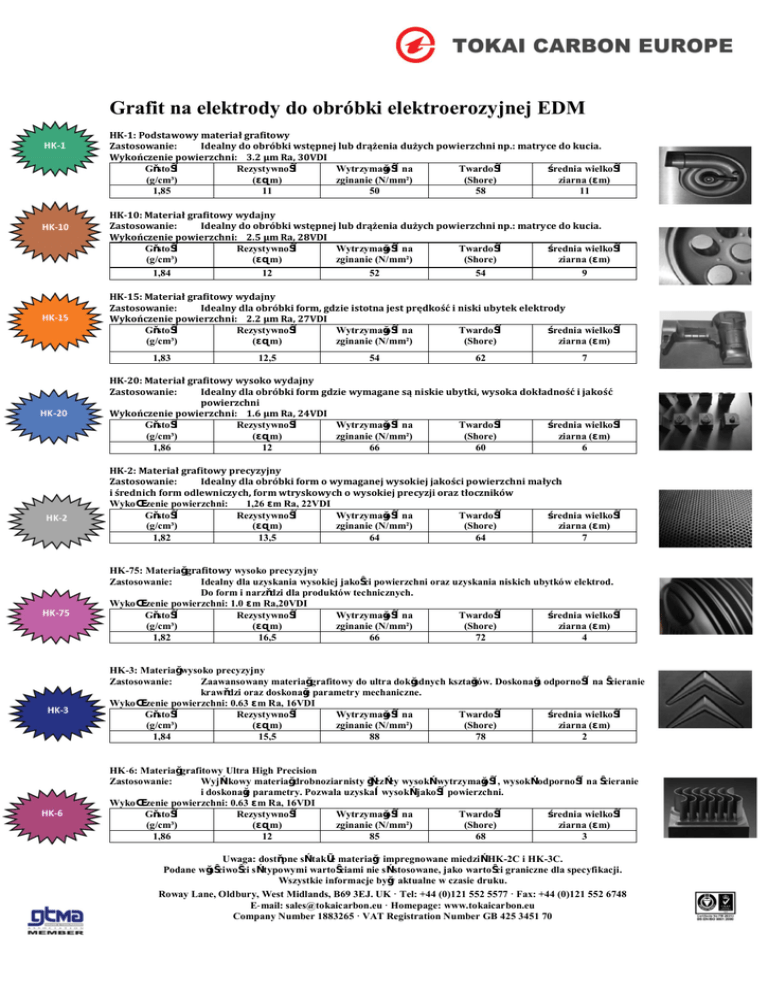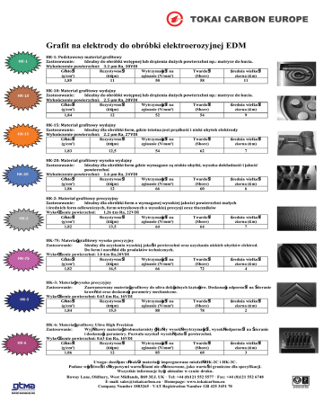 Grafit na elektrody do obróbki elektroerozyjnej EDM HK-1: Podstawowy materiał grafitowy Zastosowanie: Idealny do obróbki wstępnej lub drążenia dużych powierzchni np.: matryce do kucia. Wykończenie powierzchni: 3.2 μm Ra, 30VDI Gęstość Rezystywność Wytrzymałość na Twardość Średnia wielkość (g/cm³) (μΩm) zginanie (N/mm²) (Shore) ziarna (μm) 1,85 11 50 58 11 HK-10: Materiał grafitowy wydajny Zastosowanie: Idealny do obróbki wstępnej lub drążenia dużych powierzchni np.: matryce do kucia. Wykończenie powierzchni: 2.5 μm Ra, 28VDI Gęstość Rezystywność Wytrzymałość na Twardość Średnia wielkość (g/cm³) (μΩm) zginanie (N/mm²) (Shore) ziarna (μm) 1,84 12 52 54 9 HK-15: Materiał grafitowy wydajny Zastosowanie: Idealny dla obróbki form, gdzie istotna jest prędkość i niski ubytek elektrody Wykończenie powierzchni: 2.2 μm Ra, 27VDI Gęstość Rezystywność Wytrzymałość na Twardość Średnia wielkość (g/cm³) (μΩm) zginanie (N/mm²) (Shore) ziarna (μm) 1,83 12,5 54 62 7 HK-20: Materiał grafitowy wysoko wydajny Zastosowanie: Idealny dla obróbki form gdzie wymagane są niskie ubytki, wysoka dokładność i jakość powierzchni Wykończenie powierzchni: 1.6 μm Ra, 24VDI Gęstość Rezystywność Wytrzymałość na Twardość Średnia wielkość (g/cm³) (μΩm) zginanie (N/mm²) (Shore) ziarna (μm) 1,86 12 66 60 6 HK-2: Materiał grafitowy precyzyjny Zastosowanie: Idealny dla obróbki form o wymaganej wysokiej jakości powierzchni małych i średnich form odlewniczych, form wtryskowych o wysokiej precyzji oraz tłoczników Wykończenie powierzchni: 1,26 μm Ra, 22VDI Gęstość Rezystywność Wytrzymałość na Twardość Średnia wielkość (g/cm³) (μΩm) zginanie (N/mm²) (Shore) ziarna (μm) 1,82 13,5 64 64 7 HK-75: Materiał grafitowy wysoko precyzyjny Zastosowanie: Idealny dla uzyskania wysokiej jakości powierzchni oraz uzyskania niskich ubytków elektrod. Do form i narzędzi dla produktów technicznych. Wykończenie powierzchni: 1.0 μm Ra,20VDI Gęstość Rezystywność Wytrzymałość na Twardość Średnia wielkość (g/cm³) (μΩm) zginanie (N/mm²) (Shore) ziarna (μm) 1,82 16,5 66 72 4 HK-3: Materiał wysoko precyzyjny Zastosowanie: Zaawansowany materiał grafitowy do ultra dokładnych kształtów. Doskonała odporność na ścieranie krawędzi oraz doskonałe parametry mechaniczne. Wykończenie powierzchni: 0.63 μm Ra, 16VDI Gęstość Rezystywność Wytrzymałość na Twardość Średnia wielkość (g/cm³) (μΩm) zginanie (N/mm²) (Shore) ziarna (μm) 1,84 15,5 88 78 2 HK‐6: Materiał grafitowy Ultra High Precision Zastosowanie: Wyjątkowy materiał drobnoziarnisty łączący wysoką wytrzymałość, wysoką odporność na ścieranie i doskonałe parametry. Pozwala uzyskać wysoką jakość powierzchni. Wykończenie powierzchni: 0.63 μm Ra, 16VDI Gęstość Rezystywność Wytrzymałość na Twardość Średnia wielkość (g/cm³) (μΩm) zginanie (N/mm²) (Shore) ziarna (μm) 1,86 12 85 68 3 Uwaga: dostępne są także materiały impregnowane miedzią HK-2C i HK-3C. Podane właściwości są typowymi wartościami nie są stosowane, jako wartości graniczne dla specyfikacji. Wszystkie informacje były aktualne w czasie druku. Roway Lane, Oldbury, West Midlands, B69 3EJ. UK · Tel: +44 (0)121 552 5577 · Fax: +44 (0)121 552 6748 E‐mail: [email protected] · Homepage: www.tokaicarbon.eu Company Number 1883265 · VAT Registration Number GB 425 3451 70