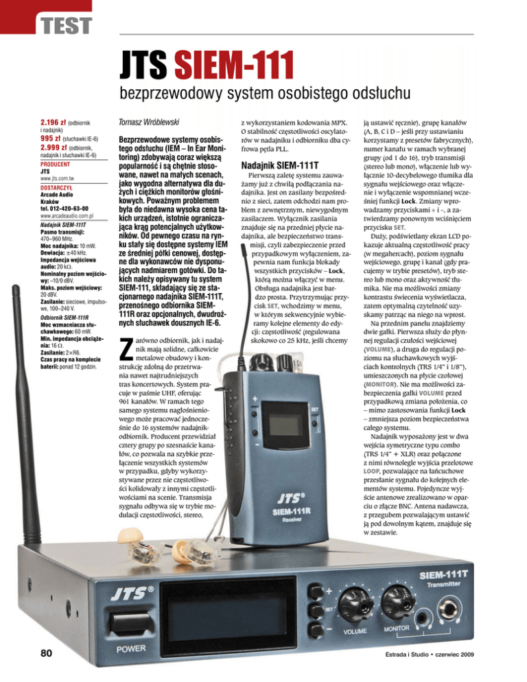 TEST JTS SIEM-111 bezprzewodowy system osobistego odsuchu 2.196 z (odbiornik Tomasz Wróblewski i nadajnik) 995 z (suchawki IE-6) 2.999 z (odbiornik, nadajnik i suchawki IE-6) PRODUCENT JTS www.jts.com.tw DOSTARCZY Arcade Audio Kraków tel. 012-420-63-00 www.arcadeaudio.com.pl Nadajnik SIEM-111T Pasmo transmisji: 470–960 MHz. Moc nadajnika: 10 mW. Dewiacja: ±40 kHz. Impedancja wejciowa audio: 20 k:. Nominalny poziom wejciowy: –10/0 dBV. Maks. poziom wejciowy: 20 dBV. Zasilanie: sieciowe, impulsowe, 100–240 V. Odbiornik SIEM-111R Moc wzmacniacza suchawkowego: 60 mW. Min. impedancja obcienia: 16 :. Zasilanie: 2×R6. Czas pracy na komplecie baterii: ponad 12 godzin. 80 Bezprzewodowe systemy osobistego odsuchu (IEM – In Ear Monitoring) zdobywaj coraz wiksz popularno i s chtnie stosowane, nawet na maych scenach, jako wygodna alternatywa dla duych i cikich monitorów gonikowych. Powanym problemem bya do niedawna wysoka cena takich urzdze, istotnie ograniczajca krg potencjalnych uytkowników. Od pewnego czasu na rynku stay si dostpne systemy IEM ze redniej póki cenowej, dostpne dla wykonawców nie dysponujcych nadmiarem gotówki. Do takich naley opisywany tu system SIEM-111, skadajcy si ze stacjonarnego nadajnika SIEM-111T, przenonego odbiornika SIEM111R oraz opcjonalnych, dwudronych suchawek dousznych IE-6. Z arówno odbiornik, jak i nadajnik mają solidne, całkowicie metalowe obudowy i konstrukcję zdolną do przetrwania nawet najtrudniejszych tras koncertowych. System pracuje w paśmie UHF, oferując 961 kanałów. W ramach tego samego systemu nagłośnieniowego może pracować jednocześnie do 16 systemów nadajnikodbiornik. Producent przewidział cztery grupy po szesnaście kanałów, co pozwala na szybkie przełączenie wszystkich systemów w przypadku, gdyby wykorzystywane przez nie częstotliwości kolidowały z innymi częstotliwościami na scenie. Transmisja sygnału odbywa się w trybie modulacji częstotliwości, stereo, z wykorzystaniem kodowania MPX. O stabilność częstotliwości oscylatorów w nadajniku i odbiorniku dba cyfrowa pętla PLL. Nadajnik SIEM-111T Pierwszą zaletę systemu zauważamy już z chwilą podłączania nadajnika. Jest on zasilany bezpośrednio z sieci, zatem odchodzi nam problem z zewnętrznym, niewygodnym zasilaczem. Wyłącznik zasilania znajduje się na przedniej płycie nadajnika, ale bezpieczeństwo transmisji, czyli zabezpieczenie przed przypadkowym wyłączeniem, zapewnia nam funkcja blokady wszystkich przycisków – Lock, którą można włączyć w menu. Obsługa nadajnika jest bardzo prosta. Przytrzymując przycisk SET, wchodzimy w menu, w którym sekwencyjnie wybieramy kolejne elementy do edycji: częstotliwość (regulowana skokowo co 25 kHz, jeśli chcemy ją ustawić ręcznie), grupę kanałów (A, B, C i D – jeśli przy ustawianiu korzystamy z presetów fabrycznych), numer kanału w ramach wybranej grupy (od 1 do 16), tryb transmisji (stereo lub mono), włączenie lub wyłącznie 10-decybelowego tłumika dla sygnału wejściowego oraz włączenie i wyłączenie wspomnianej wcześniej funkcji Lock. Zmiany wprowadzamy przyciskami + i –, a zatwierdzamy ponownym wciśnięciem przycisku SET. Duży, podświetlany ekran LCD pokazuje aktualną częstotliwość pracy (w megahercach), poziom sygnału wejściowego, grupę i kanał (gdy pracujemy w trybie presetów), tryb stereo lub mono oraz aktywność tłumika. Nie ma możliwości zmiany kontrastu świecenia wyświetlacza, zatem optymalną czytelność uzyskamy patrząc na niego na wprost. Na przednim panelu znajdziemy dwie gałki. Pierwsza służy do płynnej regulacji czułości wejściowej (VOLUME), a druga do regulacji poziomu na słuchawkowych wyjściach kontrolnych (TRS 1/4” i 1/8”), umieszczonych na płycie czołowej (MONITOR). Nie ma możliwości zabezpieczenia gałki VOLUME przed przypadkową zmiana położenia, co – mimo zastosowania funkcji Lock – zmniejsza poziom bezpieczeństwa całego systemu. Nadajnik wyposażony jest w dwa wejścia symetryczne typu combo (TRS 1/4” + XLR) oraz połączone z nimi równolegle wyjścia przelotowe LOOP, pozwalające na łańcuchowe przesłanie sygnału do kolejnych elementów systemu. Pojedyncze wyjście antenowe zrealizowano w oparciu o złącze BNC. Antena nadawcza, z przegubem pozwalającym ustawić ją pod dowolnym kątem, znajduje się w zestawie. Estrada i Studio • czerwiec 2009 Odbiornik SIEM-111R Korpus odbiornika wykonany jest z dwuczęściowego odlewu ZnAl i polakierowany proszkowo na kolor grafitowy. Boki obudowy są gumowe, dając pewny uchwyt podczas instalowania odbiornika przy garderobie wykonawcy. Mocowanie zapewnia sprężysta kształtka, wykonana z solidnego drutu stalowego. Elastyczna antena odbiorcza swobodnie wygina się we wszystkie strony. Wykonawca ma dostęp do regulatora głośności oraz regulatora panoramy. Gałki różnią się od siebie wielkością, zatem nie ma najmniejszych problemów z rozpoznaniem, która do czego służy. Regulator głośności funkcjonuje także jako wyłącznik odbiornika. Programowanie SIEM-111R odbywa się nieco inaczej niż w przypadku nadajnika, w oparciu o menu zawierające dziewięć pozycji: znane już z nadajnika Frequency, Group/ Channel, Key Lock i Stereo/Mono oraz charakterystyczne dla odbiornika: Hi Freq. Boost (włączenie lub wyłączenie podbicia wysokich tonów), Limiter (włączenie lub wyłączenie ogranicznika poziomu sygnału), Contrast (7-punktowa regulacja kontrastu ekranu LCD) i Light Time (regulacja czasu podświetlania ekranu LCD od momentu wciśnięcia dowolnego przycisku). Dziewiąta pozycja w menu to funkcja Exit, czyli wyjście z menu. Wyświetlacz odbiornika pokazuje częstotliwość, grupę i numer kanału, poziom sygnału RF, tryb pracy (mono/stereo) oraz poziom napięcia baterii zasilających (2×R6). Pod względem wykonania i obsługi odbiornik SIEM-111R zasługuje na same pochwały, jest jednak pewne „ale”. Dotyczy ono modułu zasilając