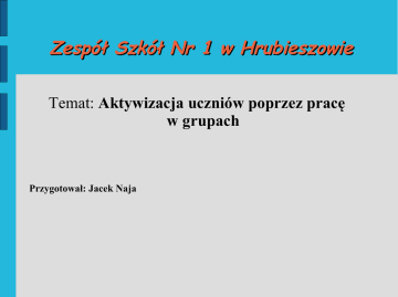 Zespół Szkół Nr 1 w Hrubieszowie Temat: Aktywizacja uczniów poprzez pracę w grupach Przygotował: Jacek Naja PROGRAM SZKOLENIA: I. WSTĘP II. DEFINICJE AKTYWNOŚCI III. PREFERENCJE UCZNIÓW IV. FORMY PRACY V. KONCEPCJA PRACY W GRUPACH VI. PODSUMOWANIE VII. LITERATURA I WSTĘP Efektywność nauczania to problem, którego rozwiązania ciągle poszukuje się. Mimo wysiłków nie wypracowano dotąd jednoznacznej odpowiedzi na pytanie: ”Jak uczyć?” Jest wiele przyczyn takiego stanu rzeczy, oto niektóre z nich: - określone predyspozycje pedagogiczne nauczyciela, - uwarunkowania społeczne i rodzinne ucznia, - zróżnicowane możliwości poznawcze uczniów, - warunki organizacyjne szkoły, - wyposażenie szkoły w pomoce dydaktyczne, - potrzeby zespołu klasowego I WSTĘP Metody aktywizujące, proponowane nauczycielom od dawna, nie są często stosowane ze względu na swą pracochłonność i brak dostępnych środków dydaktycznych a czasem odpowiednich warunków. Niejednokrotnie nauczyciele stosują je nie zdając sobie sprawy, że aktywizują dzieci do działania. Ze względu na to, że metody aktywizujące, w porównaniu z innymi zapewniają lepsze efekty nauczania należy zatem stosować je tak często jak tylko to możliwe. Należy jednak pamiętać, że każde takie zajęcia wymagają przemyślenia i starannego przygotowania. II DEFINICJE AKTYWNOŚCI ● Według słownika języka polskiego: Aktywność intensywnego inicjatyw. to skłonność, działania, do zdolność do podejmowania II DEFINICJE AKTYWNOŚCI ● Według W. Okonia: Aktywność jest własnością indywidualną jednostki, polegającą na większej niż u innych częstości i intensywności jakiegoś rodzaju działań. Uważa on, że szczególną cechą aktywności ludzkiej jest jej udział w zmienianiu otoczenia przyrodniczego i społeczno-przyrodniczego, stosownie do ludzkich potrzeb, celów i ideałów. Aktywność ucznia ma określony kierunek wyznaczony przez cel, któremu podporządkowany zostaje jej przebieg. Im bardziej cel jest atrakcyjny i ciekawy, tym większą wywołuje motywację i zainteresowanie uczniów. Stąd podstawową czynnością, jaką nauczyciel powinien wykonać, jest uświadomienie uczniom celu ich działania oraz umotywowanie potrzeby jego osiągnięcia. Źródłem aktywności ucznia są odczuwane przez niego potrzeby. Poprzez aktywność własną uczeń zaspokaja potrzeby (bezpieczeństwa, działania, uczucia, komunikowania się) i realizuje wynikające z nich cele. II DEFINICJE AKTYWNOŚCI ● Według J. Kujawińskiego: Cel i aktywność są ściśle ze sobą związane, ponieważ bez przejawiania aktywności nie można celu ustalić, ani osiągnąć. Nauczyciel powinien zdać sobie sprawę z faktu, że aktywność własną ucznia, mogą wzbudzić i ukierunkować nie tylko racje wewnętrzne, ale i zewnętrzne w postaci zadań. Racje te, będą jednak pobudzać aktywność własną ucznia tylko wtedy, gdy uzna je za swoje. Stanie się tak, gdy zadania pozwolą mu zaspokoić jakieś jego potrzeby. W procesie uczenia się, uczeń przejawia aktywność odtwórczą i twórczą. W procesie nauczania chodzi o to, żeby aktywność własna ucznia miała jak najczęściej charakter twórczy. Aktywność uczniów przejawia się w różnych formach i różnym nasileniu. Przejście od aktywności słabszej do aktywności intensywnej nazywamy aktywizacją. II DEFINICJE AKTYWNOŚCI Aktywizacja - wg słownika języka polskiego to pobudzanie do działania, aktywny jest ten, kto jest skłonny do działania, biorący w czymś żywy udział, pełen inicjatywy, czynny, ma aktywny stosunek do życia. Aktywizacja w procesie edukacji to ogół poczynań nauczyciela i uczniów zapewniający im czynny udział w realizacji zadań. Podczas tej aktywności uczniowie uczą się najlepiej i najwięcej, w sposób trwały i przyjemny. Aktywizacja nauczania to metoda nauczania polegająca na wyrabianiu w uczniu aktywnego stosunku do nauki, wdrażaniu go do samodzielnej pracy. Nie ulega wątpliwości, że należy często z tej metody korzystać. III PREFERENCJE UCZNIÓW W procesie nauczania chodzi o to, aby uczniowie nabywali potrzebną wiedzę w sposób: ● Trwały ● Skuteczny ● Przyjemny Wśród uczniów wyróżnia się trzy grupy: ● Wzrokowcy ● Słuchowcy ● Czuciowcy III PREFERENCJE UCZNIÓW Oznacza to, że uczniowie ci mają tylko sobie właściwy sposób reagowania na informacje, co decyduje o tym, jakie informacje najlepiej pamiętają. Charakterystyczny dla każdej z wymienionych grup sposób odbierania informacji za pomocą zmysłów, determinuje strategię uczenia się wzrokowców, słuchowców i uczuciowców. Preferowanie przez ucznia w trakcie uczenia się, jednego, dwóch rzadziej trzech z pięciu zmysłów, odbywa się podświadomie. Dominującą rolę w procesie nabywania wiedzy odgrywają trzy narządy zmysłów: wzrok, słuch i dotyk. ILE ZAPAMIĘTUJEMY ? ● 10% - z tego, co słyszymy ● 20% - z tego, co widzimy ● 40% - z tego, o czym rozmawiamy ● 90% - z tego, co robimy III PREFERENCJE UCZNIÓW Mając na uwadze przedstawione wyliczenia powinniśmy mieć świadomość, że istotnym elementem procesu uczenia się jest pamięć, a powiększenie jej zasobów jest związane z zastosowaną metodą nauczania. Aktywizowanie uczniów powinno odbywać się poprzez włączenie w proces uczenia i zapamiętywania jak najwięcej zmysłów. Nauczyciel w pracy z uczniem powinien ograniczać podawanie gotowych informacji, a w zamian stworzyć warunki do odkrywania i eksperymentowania, wprowadzać atrakcyjne środki dydaktyczne przyciągające wzrok, stwarzać możliwość rozmowy i dyskusji, umożliwić uczenie się przez działanie zwiększając w ten sposób ilość zapamiętywanych informacji. Proces zapamiętywania poprzez działanie jest najefektywniejszy, ponieważ w czasie wykonywania czynności angażujemy umysł , emocje, wolę i zmysły. IV FORMY PRACY W procesie organizacyjny dydaktycznym do
