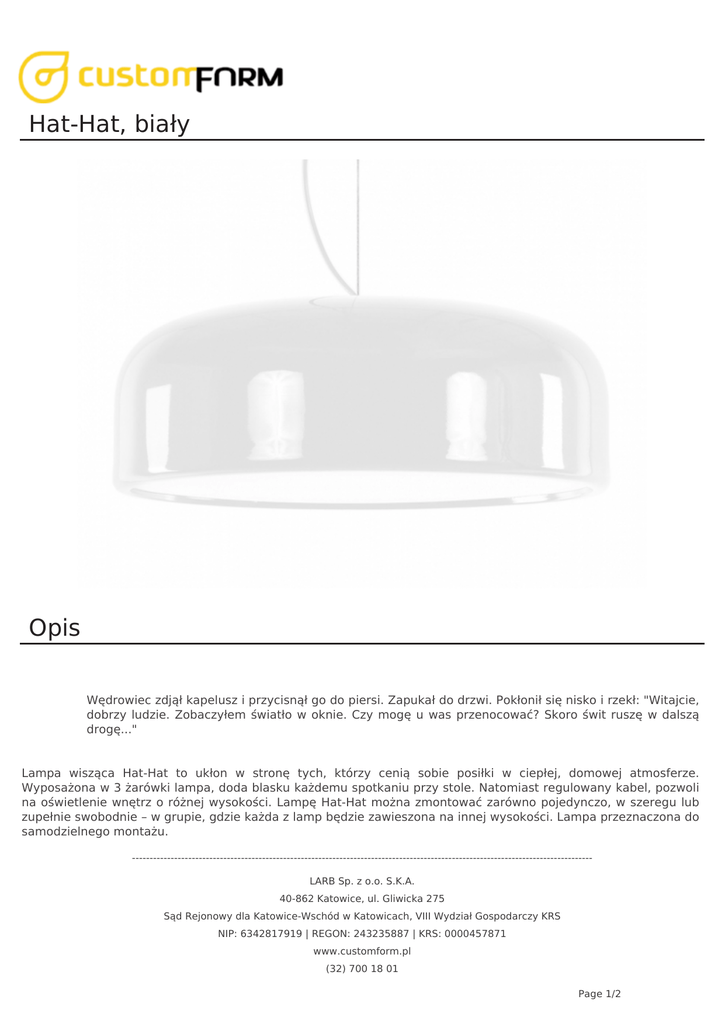 Hat-Hat, biały Opis Wędrowiec zdjął kapelusz i przycisnął go do piersi. Zapukał do drzwi. Pokłonił się nisko i rzekł: "Witajcie, dobrzy ludzie. Zobaczyłem światło w oknie. Czy mogę u was przenocować? Skoro świt ruszę w dalszą drogę..." Lampa wisząca Hat-Hat to ukłon w stronę tych, którzy cenią sobie posiłki w ciepłej, domowej atmosferze. Wyposażona w 3 żarówki lampa, doda blasku każdemu spotkaniu przy stole. Natomiast regulowany kabel, pozwoli na oświetlenie wnętrz o różnej wysokości. Lampę Hat-Hat można zmontować zarówno pojedynczo, w szeregu lub zupełnie swobodnie – w grupie, gdzie każda z lamp będzie zawieszona na innej wysokości. Lampa przeznaczona do samodzielnego montażu. ----------------------------------------------------------------------------------------------------------------------------------LARB Sp. z o.o. S.K.A. 40-862 Katowice, ul. Gliwicka 275 Sąd Rejonowy dla Katowice-Wschód w Katowicach, VIII Wydział Gospodarczy KRS NIP: 6342817919 | REGON: 243235887 | KRS: 0000457871 www.customform.pl (32) 700 18 01 Page 1/2 Lampa Hat-Hat. Ukłon w stronę światła Specyfikacja Wysokość 20 - max z kablem 180 cm Gwint żarówki E27 Średnica 48 cm Moc żarówki max 60W Ilość żarówek 3 Żarówka w komplecie nie Klosz aluminium Dodatkowe zdjęcia ----------------------------------------------------------------------------------------------------------------------------------LARB Sp. z o.o. S.K.A. 40-862 Katowice, ul. Gliwicka 275 Sąd Rejonowy dla Katowice-Wschód w Katowicach, VIII Wydział Gospodarczy KRS NIP: 6342817919 | REGON: 243235887 | KRS: 0000457871 www.customform.pl (32) 700 18 01 Page 2/2 Powered by TCPDF (www.tcpdf.org)