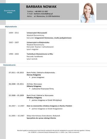 BARBARA NOWAK Cu rr ic ulu m Vit a e Telefon: +48 999 111 087 E-mail: [email protected] Adres: ul. Słoneczna, 11-220 Kwietnice Wykształcenie 2009 – 2011 Uniwersytet Warszawski Wydział Ekonomiczny kierunek: księgowość biznesowa, studia podyplomowe 2002 – 2007 Uniwersytet w Białymstoku Wydział Ekonomiczny Kierunek: finanse i rachunkowość tytuł: magister 1998 – 2002 Technikum Ekonomiczne w Ełku Kierunek: handlowiec tytuł: technik Doświadczenie 07.2011 – 05.2015 Bank Polski, Oddział w Białymstoku Starszy Księgowy prace księgowe 06.2008 – 05.2011 AirClub, Warszawa Główny Księgowy rozliczenia finansowe firmy 02.2008 – 05.2009 Bank Orzeł, Oddział w Warszawie Młodszy Księgowy pomoc księgowa w Dziale Windykacji 06.2007 – 12.2007 Staż na stanowisku młodszy księgowy w Banku Polskim pomoc księgowa w Dziale Księgowości 01.2005 – 02.2007 Sklep internetowy Dzieciakowo, Białystok Specjalista do spraw obsługi klienta Wyrażam zgodę na przetwarzanie moich danych osobowych dla potrzeb niezbędnych w procesie rekrutacji zgodnie z Ustawą z dn. 29.08.97r. o Ochronie Danych Osobowych (Dz. U. z 2014 r. poz. 1182 ze zmianami) 02.2004 – 10.2004 Staż na stanowisku asystent kierownika sklepu internetowego „Dzieciakowo” prace administracyjno-biurowe i księgowe 11.2002 – 12.2003 Poczta Polska, Białystok Asystent pocztowy wpisywanie listów poleconych 03.2002 – 09.2002 Sklep Karmel, Ełk Sprzedawca obsługa klienta Umiejętności język angielski: poziom B2, średniozaawansowany prawo jazdy kat. B znajomość obsługi komputera (Windows, Excel, Word, PowerPoint, Norma PRO) Zainteresowania gotowanie – kuchnia włoska kino – filmy Krzysztofa Kieślowskiego blogowanie – blog „Księgowość dla małego biznesu” Wyrażam zgodę na przetwarzanie moich danych osobowych dla potrzeb niezbędnych w procesie rekrutacji zgodnie z Ustawą z dn. 29.08.97r. o Ochronie Danych Osobowych (Dz. U. z 2014 r. poz. 1182 ze zmianami)