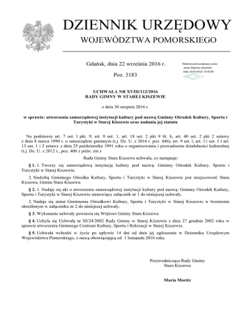DZIENNIK URZĘDOWY WOJEWÓDZTWA POMORSKIEGO Gdańsk, dnia 22 września 2016 r. Elektronicznie podpisany przez: Jacek Zbigniew Karpiński Data: 2016-09-22 10:50:56 Poz. 3183 UCHWAŁA NR XVIII/112/2016 RADY GIMNY W STAREJ KISZEWIE z dnia 30 sierpnia 2016 r. w sprawie: utworzenia samorządowej instytucji kultury pod nazwą Gminny Ośrodek Kultury, Sportu i Turystyki w Starej Kiszewie oraz nadania jej statutu Na podstawie art. 7 ust. l pkt. 9, art. 9 ust. 1, art. 18 ust. 2 pkt 9 lit. h, art. 40 ust. 2 pkt 2 ustawy z dnia 8 marca 1990 r. o samorządzie gminnym (t.j. Dz. U. z 2016 r. poz. 446), art. 9 ust. l, art. 11 ust. 1 i art. 13 ust. 1 i 2 ustawy z dnia 25 października 1991 roku o organizowaniu i prowadzeniu działalności kulturalnej (t.j. Dz. U. z 2012 r., poz. 406 z późn. zm.) Rada Gminy Stara Kiszewa uchwala, co następuje: § 1. 1. Tworzy się samorządową instytucję kultury pod nazwą: Gminny Ośrodek Kultury, Sportu i Turystyki w Starej Kiszewie. 2. Siedzibą Gminnego Ośrodka Kultury, Sportu i Turystyki w Starej Kiszewie jest miejscowość Stara Kiszewa, Gmina Stara Kiszewa. § 2. 1. Nadaje się akt o utworzeniu samorządowej instytucji kultury pod nazwą: Gminny Ośrodek Kultury, Sportu i Turystyki w Starej Kiszewie stanowiący załącznik nr 1 do niniejszej uchwały. 2. Nadaje się statut Gminnemu Ośrodkowi Kultury, Sportu i Turystyki w Starej Kiszewie w brzmieniu określonym w załączniku nr 2 do niniejszej uchwały. § 3. Wykonanie uchwały powierza się Wójtowi Gminy Stara Kiszewa § 4. Uchyla się Uchwałę nr III/24/2002 Rady Gminy w Starej Kiszewie z dnia 27 grudnia 2002 roku w sprawie utworzenia Gminnego Centrum Kultury, Sportu i Rekreacji w Starej Kiszewie. § 5. Uchwała wchodzi w życie po upływie 14 dni od dnia jej ogłoszenia w Dzienniku Urzędowym Województwa Pomorskiego, z mocą obowiązującą od 1 listopada 2016 roku Przewodnicząca Rady Gminy Stara Kiszewa Maria Moritz Dziennik Urzędowy Województwa Pomorskiego –2– Poz. 3183 Załącznik Nr 1 do Uchwały Nr XVIII/112/2016 Rady Gimny w Starej Kiszewie z dnia 30 sierpnia 2016 r. AKT o utworzeniu samorządowej instytucji kultury pod nazwą Gminny Ośrodek Kultury, Sportu i Turystyki w Starej Kiszewie Działając na podstawie art. 7 ust. l pkt. 9, art. 9 ust. 1, art. 18 ust. 2 pkt 9 lit. h, art. 40 ust. 2 pkt 2 stawy z dnia 8 marca 1990 r. o samorządzie gminnym (t.j. Dz. U. z 2016 r. poz. 446), art. 9 ust. l, art. 11 ust. 1 i art. 13 ust. 1 i 2 ustawy z dnia 25 października 1991 roku o organizowaniu i prowadzeniu działalności kulturalnej (t.j. Dz. U. z 2012 r., poz. 406, z późn. zm.) Rada Gminy Stara Kiszewa tworzy z dniem 1 listopada 2016 roku samorządową instytucję kultury pod nazwą: Gminny Ośrodek Kultury, Sportu i Turystyki w Starej Kiszewie 1. Siedzibą instytucji kultury jest miejscowość Stara Kiszewa, Gmina Stara Kiszewa. 2. Podstawowym zadaniem Gminnego Ośrodka Kultury, Sportu i Turystyki w Starej Kiszewie jest prowadzenie wielokierunkowej działalności społeczno-kulturalnej, zaspokajanie potrzeb i aspiracji kulturalnych społeczeństwa poprzez organizowanie różnorodnych form edukacji kulturalnej, upowszechnianie i promowanie kultury oraz organizowanie i popularyzowanie kultury fizycznej, rekreacji, sportu i turystyki na terenie Gminy Stara Kiszewa. 3. Terenem działania jest obszar Gminy Stara Kiszewa. W ramach współpracy i wymiany z innymi podmiotami także obszar Rzeczypospolitej Polskiej i poza jej granicami. 4. Gminny Ośrodek Kultury, Sportu i Turystyki w Starej Kiszewie nie jest instytucją artystyczną w zrozumieniu art. 11 ust. 2 ustawy z dnia 25 października 1991 roku o organizowaniu i prowadzeniu działalności kulturalnej. 5. Źródłem finansowania działalności jest dotacja organizatora oraz środki uzyskiwane z dochodów własnych i innych źródeł. Przewodnicząca Rady Gminy Stara Kiszewa Maria Moritz Dziennik Urzędowy Województwa Pomorskiego –3– Poz. 3183 Załącznik Nr 2 do Uchwały Nr XVIII/112/2016 Rady Gimny w Starej Kiszewie z dnia 30 sierpnia 2016 r. STATUT Gminnego Ośrodka Kultury, Sportu i Turystyki w Starej Kiszewie Rozdział 1. POSTANOWIENIA OGÓLNE § 1. 1. Gminny Ośrodek Kultury, Sportu i Turystyki w Starej Kiszewie jest samorządową instytucją kultury Gminy Stara Kiszewa i działa w szczególności na podstawie: 1) ustawy z dnia 25 października 1991 r. o organizowaniu i prowadzeniu działalności kulturalnej (t.j. Dz. U. z 2012 r., poz. 406 z późn. zm.); 2) aktu o utworzeniu; 3) niniejszego statutu. 2. Ilekroć w statucie jest mowa o ,,Ośrodku” – należy rozumieć Gminny Ośrodek Kultury, Sportu i Turystyki w Starej Kiszewie. § 2. 1. Ośrodek jest samorządową instytucję kultury. 2. Organizatorem Ośrodka jest Gmina Stara Kiszewa. 3. Organizator zapewnia warunki działalności i rozwoju na poziomie odpowiadającym zadaniom i wymaganiom stawianym Ośrodkowi. § 3. Ośrodek uzyskuje osobowość prawną z chwilą wpisu do rejestru samorządowych instytucji kultury prowadzonego przez Organizatora. § 4. 1. Ośrodek prowadzi działalność na terenie Gminy Stara Kiszewa, Rzeczpospolitej Polskiej i poza jej granicami. 2. Siedzibą Ośrodka jest miejscowość Stara Kiszewa, ul. Tysiąclecia 25A 83-430 Stara Kiszewa. 3. Ośrodek prowadzi swoją działalność w siedzibie oraz na terenie Gminy Stara Kiszewa w szczególności w następujących obiektach i terenach: 1) Gminna hala sportowa w Starej Kiszewie; 2) Centrum Informacji Turystycznej w Wilczych Błotach; 3) Świetlice wiejskie na terenie gminy; 4) Kąpielisko gminne nad jeziorem Wielkim w miejscowości Struga; 5) Przystań kajakowa nad rzeką Wierzyca w Starej Kiszewie. 4. Wyposażenie Ośrodka w mienie, w którym będzie prowadzona działalność Ośrodka nastąpi w trybie i na zasadach określonych przez Organizatora. § 5. 1. Ośrodek używa pieczęci: 1) podłużnej zawierającej w swej treści nazwę w pełnym brzmieniu oraz adresem siedziby; 2) okrągłej z napisem w 