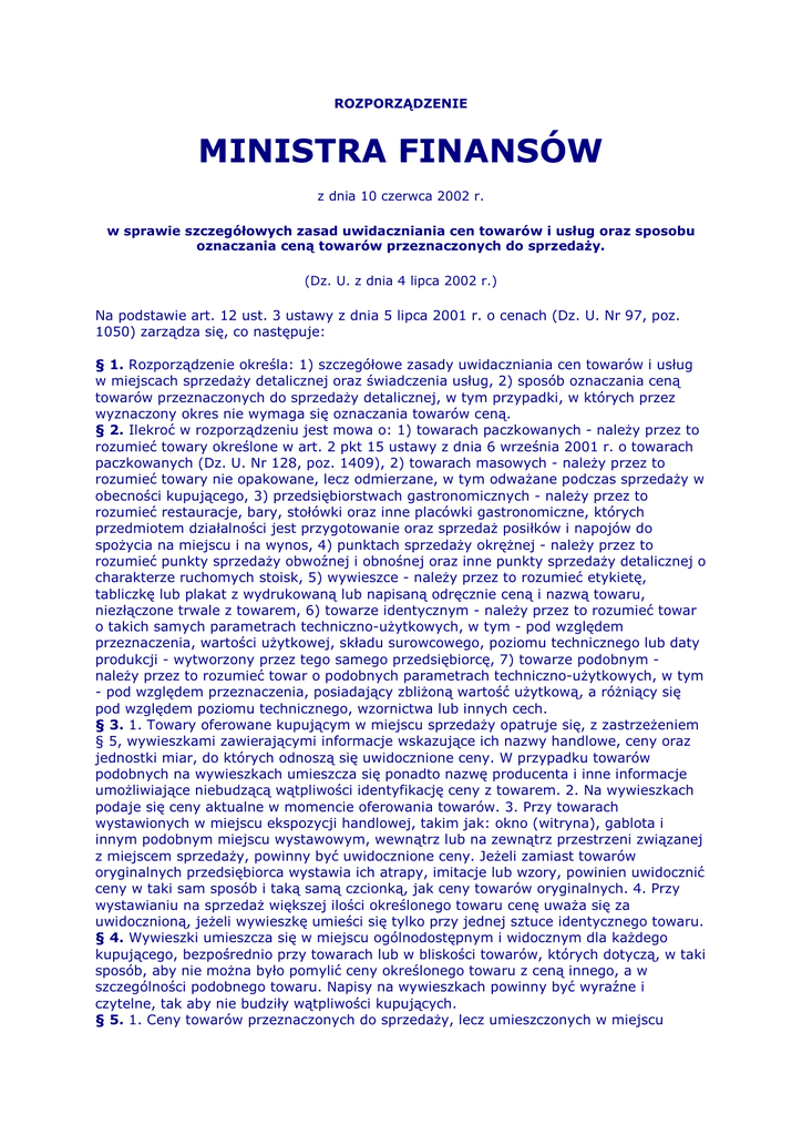 ROZPORZĄDZENIE MINISTRA FINANSÓW z dnia 10 czerwca 2002 r. w sprawie szczegółowych zasad uwidaczniania cen towarów i usług oraz sposobu oznaczania ceną towarów przeznaczonych do sprzedaŜy. (Dz. U. z dnia 4 lipca 2002 r.) Na podstawie art. 12 ust. 3 ustawy z dnia 5 lipca 2001 r. o cenach (Dz. U. Nr 97, poz. 1050) zarządza się, co następuje: § 1. Rozporządzenie określa: 1) szczegółowe zasady uwidaczniania cen towarów i usług w miejscach sprzedaŜy detalicznej oraz świadczenia usług, 2) sposób oznaczania ceną towarów przeznaczonych do sprzedaŜy detalicznej, w tym przypadki, w których przez wyznaczony okres nie wymaga się oznaczania towarów ceną. § 2. Ilekroć w rozporządzeniu jest mowa o: 1) towarach paczkowanych - naleŜy przez to rozumieć towary określone w art. 2 pkt 15 ustawy z dnia 6 września 2001 r. o towarach paczkowanych (Dz. U. Nr 128, poz. 1409), 2) towarach masowych - naleŜy przez to rozumieć towary nie opakowane, lecz odmierzane, w tym odwaŜane podczas sprzedaŜy w obecności kupującego, 3) przedsiębiorstwach gastronomicznych - naleŜy przez to rozumieć restauracje, bary, stołówki oraz inne placówki gastronomiczne, których przedmiotem działalności jest przygotowanie oraz sprzedaŜ posiłków i napojów do spoŜycia na miejscu i na wynos, 4) punktach sprzedaŜy okręŜnej - naleŜy przez to rozumieć punkty sprzedaŜy obwoźnej i obnośnej oraz inne punkty sprzedaŜy detalicznej o charakterze ruchomych stoisk, 5) wywieszce - naleŜy przez to rozumieć etykietę, tabliczkę lub plakat z wydrukowaną lub napisaną odręcznie ceną i nazwą towaru, niezłączone trwale z towarem, 6) towarze identycznym - naleŜy przez to rozumieć towar o takich samych parametrach techniczno-uŜytkowych, w tym - pod względem przeznaczenia, wartości uŜytkowej, składu surowcowego, poziomu technicznego lub daty produkcji - wytworzony przez tego samego przedsiębiorcę, 7) towarze podobnym naleŜy przez to rozumieć towar o podobnych parametrach techniczno-uŜytkowych, w tym - pod względem przeznaczenia, posiadający zbliŜoną wartość uŜytkową, a róŜniący się pod względem poziomu technicznego, wzornictwa lub innych cech. § 3. 1. Towary oferowane kupującym w miejscu sprzedaŜy opatruje się, z zastrzeŜeniem § 5, wywieszkami zawierającymi informacje wskazujące ich nazwy handlowe, ceny oraz jednostki miar, do których odnoszą się uwidocznione ceny. W przypadku towarów podobnych na wywieszkach umieszcza się ponadto nazwę producenta i inne informacje umoŜliwiające niebudzącą wątpliwości identyfikację ceny z towarem. 2. Na wywieszkach podaje się ceny aktualne w momencie oferowania towarów. 3. Przy towarach wystawionych w miejscu ekspozycji handlowej, takim jak: okno (witryna), gablota i innym podobnym miejscu wystawowym, wewnątrz lub na zewnątrz przestrzeni związanej z miejscem sprzedaŜy, powinny być uwidocznione ceny. JeŜeli zamiast towarów oryginalnych przedsiębiorca wystawia ich atrapy, imitacje lub wzory, powinien uwidocznić ceny w taki sam sposób i taką samą czcionką, jak ceny towarów oryginalnych. 4. Przy wystawianiu na sprzedaŜ większej ilości określonego towaru cenę uwaŜa się za uwidocznioną, jeŜeli wywieszkę umieści się tylko przy jednej sztuce identycznego towaru. § 4. Wywieszki umieszcza się w miejscu ogólnodostępnym i widocznym dla kaŜdego kupującego, bezpośrednio przy towarach lub w bliskości towarów, których dotyczą, w taki sposób, aby nie moŜna było pomylić ceny określonego towaru z ceną innego, a w szczególności podobnego towaru. Napisy na wywieszkach powinny być wyraźne i czytelne, tak aby nie budziły wątpliwości kupujących. § 5. 1. Ceny towarów przeznaczonych do sprzedaŜy, lecz umieszczonych w miejscu niedostępnym i niewidocznym dla kupujących, a w szczególności na zapleczu, uwidacznia się w zestawieniach cen, zwanych dalej "cennikami". 2. Cenniki wywiesza się, wykłada lub w inny sposób udostępnia w miejscu sprzedaŜy towarów tak, aby były one czytelne dla kupujących. 3. Ceny towarów oferowanych w punktach sprzedaŜy okręŜnej uwidacznia się w cenniku wywieszonym w miejscu dostępnym dla kupujących. 4. Ceny potraw lub wyrobów oferowanych w przedsiębiorstwach gastronomicznych uwidacznia się w sposób czytelny w cenniku, wywieszonym w miejscu ogólnodostępnym dla kupujących wewnątrz lub na zewnątrz lokalu, w pobliŜu drzwi wejściowych. Cennik powinien ponadto zawierać aktualne informacje dodatkowe umoŜliwiające łatwą identyfikację ceny z towarem, w szczególności: datę wystawienia, pełną nazwę potrawy lub wyrobu, określenie ilości nominalnej potrawy lub wyrobu, wyraŜonej w legalnej jednostce miary, zawartej w jednej porcji, w tym zwłaszcza ilości głównego składnika (mięsa, drobiu, ryb), dodatków uzupełniających (przystawek, deserów) i napojów. W przypadku towarów, które ze swej natury mogą być sprzedawane na sztuki, dopuszcza się określenie ilości nominalnej oferowanej porcji w sztukach. § 6. 1. Ceny porcji wyrobów garmaŜeryjnych uwidacznia się na wywieszkach przy poszczególnych towarach, wraz z pełną ich nazwą, określeniem ilości nominalnej oferowanej porcji kaŜdego wyrobu, wyraŜonej w legalnej jednostce miary. W przypadku towarów, które ze swej natury mogą być sprzedawane na sztuki, dopuszcza się określenie ilości nominalnej oferowanej porcji w sztukach. 2. Przedsiębiorcy prowadzący działalność usługową w zakresie gastronomii lub hotelarstwa: 1) zapewniają wystarczającą ilość cenników oferowanych potraw lub wyrobów i napojów, aby udostępniać je kupującym przed przyjęciem zamówienia i przy rozliczeniu końcowym, 2) wykładają w kaŜdym pokoju noclegowym katalog zawierający ceny noclegu, wyŜywienia lub innych oferowanych usług, 3) wywieszają lub wykładają w miejscu przeznaczonym do odbywania rozmów telefonicznych cennik, zawierający cenę za jeden impuls tele