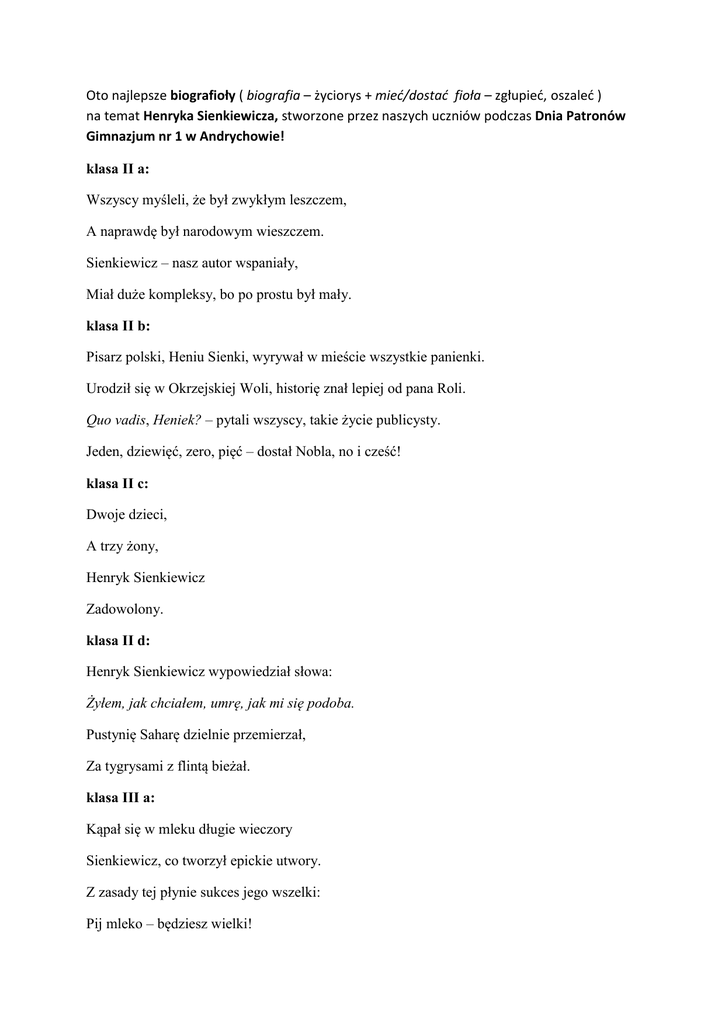 Oto najlepsze biografioły ( biografia – życiorys + mieć/dostać fioła – zgłupieć, oszaleć ) na temat Henryka Sienkiewicza, stworzone przez naszych uczniów podczas Dnia Patronów Gimnazjum nr 1 w Andrychowie! klasa II a: Wszyscy myśleli, że był zwykłym leszczem, A naprawdę był narodowym wieszczem. Sienkiewicz – nasz autor wspaniały, Miał duże kompleksy, bo po prostu był mały. klasa II b: Pisarz polski, Heniu Sienki, wyrywał w mieście wszystkie panienki. Urodził się w Okrzejskiej Woli, historię znał lepiej od pana Roli. Quo vadis, Heniek? – pytali wszyscy, takie życie publicysty. Jeden, dziewięć, zero, pięć – dostał Nobla, no i cześć! klasa II c: Dwoje dzieci, A trzy żony, Henryk Sienkiewicz Zadowolony. klasa II d: Henryk Sienkiewicz wypowiedział słowa: Żyłem, jak chciałem, umrę, jak mi się podoba. Pustynię Saharę dzielnie przemierzał, Za tygrysami z flintą bieżał. klasa III a: Kąpał się w mleku długie wieczory Sienkiewicz, co tworzył epickie utwory. Z zasady tej płynie sukces jego wszelki: Pij mleko – będziesz wielki! klasa III b: Krzyżaków wszyscy znają, A Quo vadis podziwiają. Umarł 170 lat temu, Wielki hołd oddajemy jemu. klasa III c: Ogniem i mieczem to powieść wam znana, Helena została w niej opisana. Potop nam zalał wszystkim serca, Ten Sienkiewicz to jakiś morderca! W Szwajcarii odszedł pisarz znany, Przez wszystkich Polaków kochany; Szczęśliwy patrzy na nas z góry, Widzi wszystko nawet przez chmury.