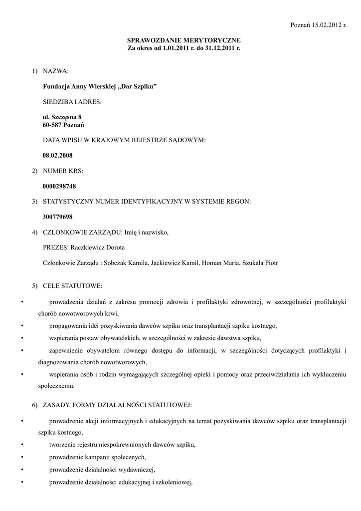 Poznań 15.02.2012 r. SPRAWOZDANIE MERYTORYCZNE Za okres od 1.01.2011 r. do 31.12.2011 r. 1) NAZWA: Fundacja Anny Wierskiej „Dar Szpiku” SIEDZIBA I ADRES: ul. Szczęsna 8 60-587 Poznań DATA WPISU W KRAJOWYM REJESTRZE SĄDOWYM: 08.02.2008 2) NUMER KRS: 0000298748 3) STATYSTYCZNY NUMER IDENTYFIKACYJNY W SYSTEMIE REGON: 300779698 4) CZŁONKOWIE ZARZĄDU: Imię i nazwisko, PREZES: Raczkiewicz Dorota Członkowie Zarządu : Sobczak Kamila, Jackiewicz Kamil, Homan Maria, Szukała Piotr 5) CELE STATUTOWE: prowadzenia działań z zakresu promocji zdrowia i profilaktyki zdrowotnej, w szczególności profilaktyki chorób nowotworowych krwi, propagowania idei pozyskiwania dawców szpiku oraz transplantacji szpiku kostnego, wspierania postaw obywatelskich, w szczególności w zakresie dawstwa szpiku, zapewnienie obywatelom równego dostępu do informacji, w szczególności dotyczących profilaktyki i diagnozowania chorób nowotworowych, wspierania osób i rodzin wymagających szczególnej opieki i pomocy oraz przeciwdziałania ich wykluczeniu społecznemu. 6) ZASADY, FORMY DZIAŁALNOŚCI STATUTOWEJ: prowadzenie akcji informacyjnych i edukacyjnych na temat pozyskiwania dawców szpiku oraz transplantacji szpiku kostnego, tworzenie rejestru niespokrewnionych dawców szpiku, prowadzenie kampanii społecznych, prowadzenie działalności wydawniczej, prowadzenie działalności edukacyjnej i szkoleniowej, prowadzenie punktów poradnictwa zdrowotnego, badań profilaktycznych oraz innych form poradnictwa i punktów informacyjnych, prowadzenie profilaktyki społecznej, terapii, socjoterapii i innych form pomocy, organizację imprez kulturalnych, sportowych, szkoleniowych i wypoczynkowych, organizację kampanii informacyjnych w zakresie promocji postaw społeczno-obywatelskich, współpracę z instytucjami samorządu lokalnego, współpracę międzynarodową z organizacjami zagranicznymi. 7) INFORMACJA O PROWADZONEJ DZIAŁALNOŚCI GOSPODARCZEJ WEDŁUG WPISU DO REJESTRU PRZEDSIĘBIORCÓW KRAJOWEGO REJESTRU SĄDOWEGO: Nie dotyczy. 8) UCHWAŁY: nie podjęto 9) INFORMACJA O WYSOKOŚCI UZYSKANYCH PRZYCHODÓW, Z WYODRĘBNIENIEM ICH ŹRÓDEŁ: SPADEK ZAPIS DAROWIZNA 1% DOTACJA SKŁADKI INNE ŚRODKI POCHODZĄCE ZE ŹRÓDEŁ PUBLICZNYCH: - BUDŻETU PAŃSTWA - BUDŻETU GMINY ODPŁATNE ŚWIADCZENIA REALIZOWANE W RAMACH CELÓW STATUTOWYCH Z UWZGLĘDNIENIEM KOSZTÓW TYCH ŚWIADCZEŃ WYNIK FINANSOWY DZIAŁALNOŚCI GOSPODARCZEJ ORAZ PROCENTOWY STOSUNEK PRZYCHODU OSIĄGNIĘTEGO Z TEJ DZIAŁALNOŚCI DO PRZYCHODU OSIĄGNIĘTEGO Z POZOSTAŁYCH ŹRÓDEŁ Nie dotyczy Nie dotyczy 31111,5 0,00 78985,78 Nie dotyczy 23315,15 78985,78 Nie dotyczy Nie dotyczy 10) INFORMACJA O PONIESIONYCH KOSZTACH NA: a) realizację celów statutowych b) administrację (czynsze, opłaty telefoniczne, pocztowe itp.) c) działalność gospodarczą d) pozostałe koszty 100531,24 PLN 58582,19 PLN Nie dotyczy 0,00. PLN 11) DANE O: a) Liczbie osób zatrudnionych w stowarzyszeniu z podziałem według zajmowanych stanowisk z wyodrębnieniem osób zatrudnionych wyłącznie w działalności gospodarczej: Nie dotyczy. b) Łącznej kwocie wynagrodzeń wypłaconych przez stowarzyszenie z podziałem na wynagrodzenia, nagrody, premie i inne świadczenia, z wyodrębnieniem całości tych wynagrodzeń osób zatrudnionych wyłącznie w działalności gospodarczej: Nie dotyczy. c) Wysokości rocznego przeciętnego miesięcznego wynagrodzenia wypłaconego łącznie członkom zarządu i innych organów stowarzyszenia oraz osobom kierującym wyłącznie działalnością gospodarczą z podziałem na wynagrodzenia, nagrody premie i inne świadczenia: Nie dotyczy. d) Wydatkach na wynagrodzenia z umów zlecenia i o dzieło 24940,00 zł e) Udzielonych przez stowarzyszenie pożyczkach pieniężnych, z podziałem według ich wysokości, ze wskazaniem pożyczkobiorców i warunków przyznania pożyczek oraz z podaniem podstawy statutowej udzielenia takich pożyczek: Nie dotyczy. f) Kwotach ulokowanych na rachunkach bankowych ze wskazaniem banku: 7478,59 PLN BRE BANK g) Wartości nabytych obligacji oraz wielkości objętych udziałów lub nabytych akcji w spółkach prawa handlowego ze wskazaniem tych spółek: Nie dotyczy. h) Nabytych nieruchomościach, ich przeznaczeniu oraz wysokości kwot wydatkowanych na to nabycie: Nie dotyczy. i) Nabytych pozostałych środkach trwałych: Nie dotyczy. j) Wartości aktywów i zobowiązań stowarzyszenia ujętych we właściwych sprawozdaniach finansowych sporządzonych dla celów statystycznych: Nie dotyczy. 12) DANE O DZIAŁALNOŚCI ZLECONEJ STOWARZYSZENIU PRZEZ PODMIOTY PAŃSTWOWE I SAMORZĄDOWE (usługi, państwowe zadania zlecone i zamówienia publiczne) ORAZ WYNIKU FINANSOWYM TEJ DZIAŁALNOŚCI: W dniu 14-03-2011 umową nr 72/PEU.PS/11 Gmina Śrem zleciła Fundacji realizację zadania z zakresu wykonania zadania publicznego „Dzień Szpiku” - otrzymano dofinansowanie w wysokości 16000,00 zł, poniesiono koszty realizacji zadania w wysokości 28256,41 zł W dniu 17-10-2011 umową nr ZSS.II/5250-5/11 Fn 5969/11 MIASTO POZNAŃ zleciło Fundacji realizację zadania z zakresu wykonania zadania publicznego „ZOSTAŃ DAWCĄ SZPIKU” - otrzymano dofinansowanie w wysokości 10000,00 zł, poniesiono koszty realizacji zadania w wysokości 11077,10 zł W dniu 08-07-2011 umową nr 13/DZ.II/2011 WOJEWÓDZTWO WIELKOPOLSKIE zleciło Fundacji realizację zadania z zakresu wykonania zadania publicznego „MOŻESZ URATOWAĆ CZYJEŚ ŻYCIE” - otrzymano dofinansowanie w wysokości 23000,00 zł, poniesiono koszty realizacji zadania w wysokości 27228,32 zł W dniu 14-09-2011 umową nr 2SS.U/5250-1/11 Fn 4573/11 MIASTO POZNAŃ zleciło Fundacji realizację zadania z zakresu wykonania zadania publicznego „POMAGAJ BIEGAJĄC” - otrzymano dofinansowanie w wysokości 10000,00 zł, poniesiono koszty realizacji zadania w wysokości 12618,82 zł W dniu 25-05-2011 umową nr PS.I-7.946-2-2/11 WOJEWODA WIELKOPOLSKI zlecił Fundacji realizację zadania z zakr