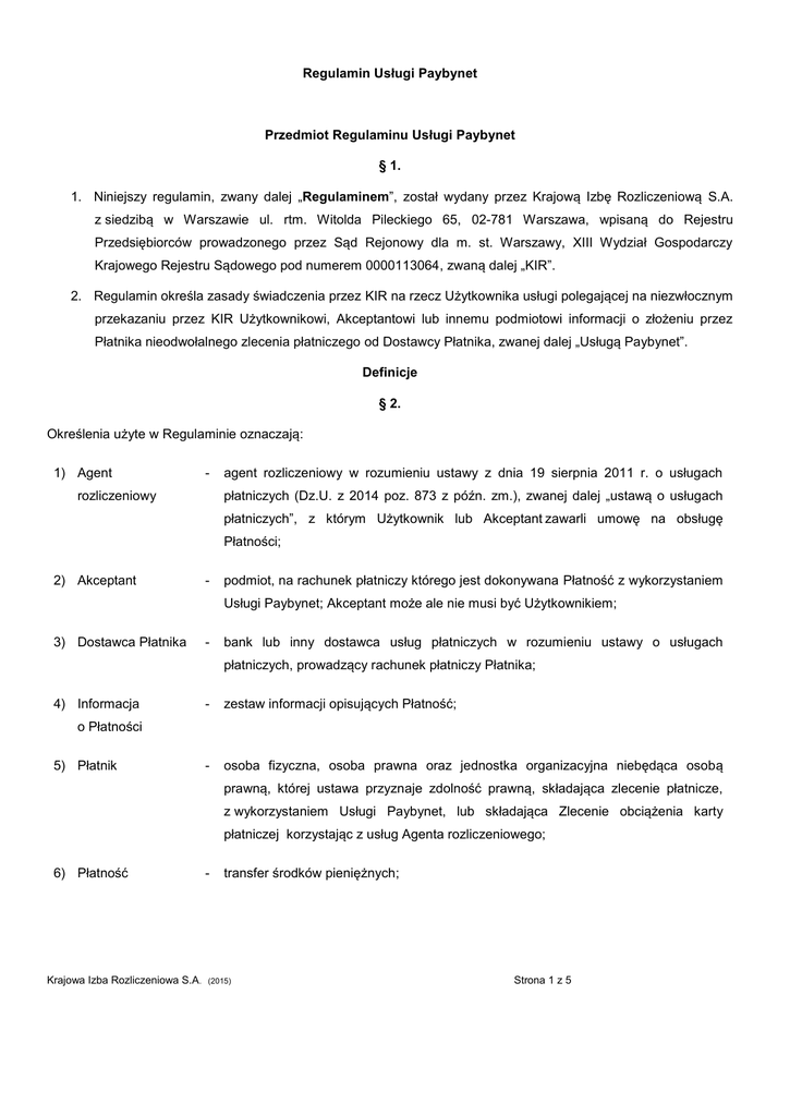 Regulamin Usługi Paybynet Przedmiot Regulaminu Usługi Paybynet § 1. 1. Niniejszy regulamin, zwany dalej „Regulaminem”, został wydany przez Krajową Izbę Rozliczeniową S.A. z siedzibą w Warszawie ul. rtm. Witolda Pileckiego 65, 02-781 Warszawa, wpisaną do Rejestru Przedsiębiorców prowadzonego przez Sąd Rejonowy dla m. st. Warszawy, XIII Wydział Gospodarczy Krajowego Rejestru Sądowego pod numerem 0000113064, zwaną dalej „KIR”. 2. Regulamin określa zasady świadczenia przez KIR na rzecz Użytkownika usługi polegającej na niezwłocznym przekazaniu przez KIR Użytkownikowi, Akceptantowi lub innemu podmiotowi informacji o złożeniu przez Płatnika nieodwołalnego zlecenia płatniczego od Dostawcy Płatnika, zwanej dalej „Usługą Paybynet”. Definicje § 2. Określenia użyte w Regulaminie oznaczają: 1) Agent - agent rozliczeniowy w rozumieniu ustawy z dnia 19 sierpnia 2011 r. o usługach płatniczych (Dz.U. z 2014 poz. 873 z późn. zm.), zwanej dalej „ustawą o usługach rozliczeniowy płatniczych”, z którym Użytkownik lub Akceptant zawarli umowę na obsługę Płatności; 2) Akceptant - podmiot, na rachunek płatniczy którego jest dokonywana Płatność z wykorzystaniem Usługi Paybynet; Akceptant może ale nie musi być Użytkownikiem; 3) Dostawca Płatnika - bank lub inny dostawca usług płatniczych w rozumieniu ustawy o usługach płatniczych, prowadzący rachunek płatniczy Płatnika; 4) Informacja - zestaw informacji opisujących Płatność; - osoba fizyczna, osoba prawna oraz jednostka organizacyjna niebędąca osobą o Płatności 5) Płatnik prawną, której ustawa przyznaje zdolność prawną, składająca zlecenie płatnicze, z wykorzystaniem Usługi Paybynet, lub składająca Zlecenie obciążenia karty płatniczej korzystając z usług Agenta rozliczeniowego; 6) Płatność Krajowa Izba Rozliczeniowa S.A. - transfer środków pieniężnych; (2015) Strona 1 z 5 - rachunek płatniczy w rozumieniu ustawy o usługach płatniczych; 8) System Paybynet - system teleinformatyczny KIR obsługujący Usługę Paybynet; 9) System - system teleinformatyczny Agenta rozliczeniowego służący do obsługi, w tym 7) Rachunek płatniczy autoryzacji, Płatności przy użyciu karty płatniczej; teleinformatyczny Agenta rozliczeniowego 10) System - system bankowości elektronicznej lub inny system teleinformatyczny służący do teleinformatyczny obsługi Płatnika przez Dostawcę Płatnika, w szczególności w celu prezentowania Dostawcy Płatnika i autoryzacji treści Zlecania płatniczego; 11) Użytkownik - osoba fizyczna, osoba prawna, jednostka organizacyjna niebędąca osoba prawną, której ustawa przyznaje zdolność prawną, która zawarła z KIR umowę o korzystanie z Usługi Paybynet; 12) Transakcja - transakcja płatnicza w rozumieniu ustawy o usługach płatniczych; - oświadczenie Płatnika lub innego pomiotu zawierające polecenie wykonania płatnicza 13) Zlecenie obciążenia karty Transakcji płatniczej przy użyciu karty płatniczej; płatniczej 14) Zlecenie płatnicze - oświadczenie Płatnika skierowane do Dostawcy Płatnika zawierające polecenie wykonania Transakcji płatniczej. Ogólne zasady świadczenia Usługi Paybynet § 3. 1. Usługa Paybynet jest świadczona przez KIR na rzecz Użytkownika na podstawie umowy o korzystanie z Usługi Paybynet, zwanej dalej „Umową”. 2. Usługa Paybynet obejmuje w szczególności: 1) przekazanie do Dostawcy Płatnika Informacji o Płatności w celu zaprezentowania Płatnikowi danych Zlecenia płatniczego w ramach systemu teleinformatycznego Dostawcy Płatnika; 2) przekazanie do Agenta rozliczeniowego Informacji o Płatności w celu zaprezentowania Płatnikowi danych zlecenia obciążenia karty płatniczej w ramach systemu teleinformatycznego Agenta rozliczeniowego; Krajowa Izba Rozliczeniowa S.A. Strona 2 z 5 3) przekazanie Użytkownikowi, Akceptantowi lub innemu podmiotowi wskazanemu zgodnie z Umową informacji o złożeniu przez Płatnika nieodwołalnego Zlecenia płatniczego; 4) przekazanie Użytkownikowi, Akceptantowi lub innemu podmiotowi wskazanemu zgodnie z Umową informacji o złożeniu Zlecenia obciążenia karty płatniczej. 3. Środki pieniężne każdej Płatności wykonanej przez Płatnika za pośrednictwem Dostawcy Płatnika przekazywane są bezpośrednio z Rachunku płatniczego Płatnika na Rachunek płatniczy Użytkownika lub Akceptanta zgodnie z dyspozycją Użytkownika lub w inny uzgodniony z Dostawcą Płatnika i Użytkownikiem sposób, z tym że na żadnym etapie KIR nie wchodzi w ich posiadanie. 4. Środki pieniężne każdej Płatności wykonanej przez Płatnika za pośrednictwem Agenta rozliczeniowego są przekazywane zgodnie z zasadami obowiązującymi u Agenta rozliczeniowego. KIR nie świadczy w tym zakresie żadnych usług na rzecz Płatnika. 5. Usługa Paybynet jest usługą świadczoną drogą elektroniczną w rozumieniu ustawy z dnia 18 lipca 2002 r. o świadczeniu usług drogą elektroniczną (Dz.U. 2013 r. poz. 1422). 6. Usługa Paybynet nie jest usługą płatniczą w rozumieniu ustawy o usługach płatniczych. Zasady funkcjonowania Systemu Paybynet § 4. 1. System Paybynet jest dostępny w trybie 24/7/365 z tym, że KIR zastrzega sobie prawo do jego niedostępności w przypadkach awarii lub przerw technicznych. KIR dołoży wszelkich starań, aby przerwy techniczne występowały wyłącznie w soboty i niedziele lub w późnych godzinach nocnych w dni robocze. 2. Dostępność Usługi Paybynet nie jest równoznaczna: 1) z dostępnością systemu teleinformatycznego Dostawcy Płatnika ani możliwością autoryzacji Zlecenia płatniczego; 2) z dostępnością systemu teleinformatycznego Agenta rozliczeniowego ani możliwością autoryzacji Zlecenia obciążenia karty płatniczej. 3. Zasady autoryzacji Zleceń płatniczych są określane przez Dostawców Płatnika. 4. Zasady autoryzacji Zleceń obciążenia karty płatniczej są określane przez Agenta rozliczeniowego 