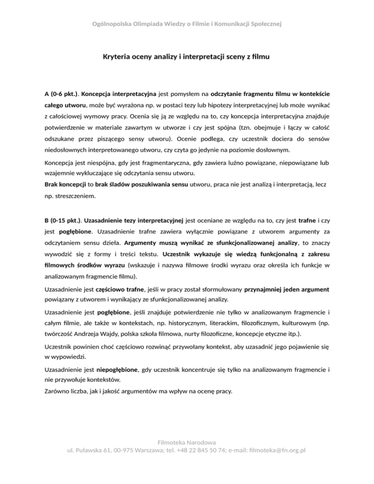 Ogólnopolska Olimpiada Wiedzy o Filmie i Komunikacji Społecznej Kryteria oceny analizy i interpretacji sceny z filmu A (0-6 pkt.). Koncepcja interpretacyjna jest pomysłem na odczytanie fragmentu filmu w kontekście całego utworu, może być wyrażona np. w postaci tezy lub hipotezy interpretacyjnej lub może wynikać z całościowej wymowy pracy. Ocenia się ją ze względu na to, czy koncepcja interpretacyjna znajduje potwierdzenie w materiale zawartym w utworze i czy jest spójna (tzn. obejmuje i łączy w całość odszukane przez piszącego sensy utworu). Ocenie podlega, czy uczestnik dociera do sensów niedosłownych interpretowanego utworu, czy czyta go jedynie na poziomie dosłownym. Koncepcja jest niespójna, gdy jest fragmentaryczna, gdy zawiera luźno powiązane, niepowiązane lub wzajemnie wykluczające się odczytania sensu utworu. Brak koncepcji to brak śladów poszukiwania sensu utworu, praca nie jest analizą i interpretacją, lecz np. streszczeniem. B (0-15 pkt.). Uzasadnienie tezy interpretacyjnej jest oceniane ze względu na to, czy jest trafne i czy jest pogłębione. Uzasadnienie trafne zawiera wyłącznie powiązane z utworem argumenty za odczytaniem sensu dzieła. Argumenty muszą wynikać ze sfunkcjonalizowanej analizy, to znaczy wywodzić się z formy i treści tekstu. Uczestnik wykazuje się wiedzą funkcjonalną z zakresu filmowych środków wyrazu (wskazuje i nazywa filmowe środki wyrazu oraz określa ich funkcje w analizowanym fragmencie filmu). Uzasadnienie jest częściowo trafne, jeśli w pracy został sformułowany przynajmniej jeden argument powiązany z utworem i wynikający ze sfunkcjonalizowanej analizy. Uzasadnienie jest pogłębione, jeśli znajduje potwierdzenie nie tylko w analizowanym fragmencie i całym filmie, ale także w kontekstach, np. historycznym, literackim, filozoficznym, kulturowym (np. twórczość Andrzeja Wajdy, polska szkoła filmowa, nurty filozoficzne, koncepcje etyczne itp.). Uczestnik powinien choć częściowo rozwinąć przywołany kontekst, aby uzasadnić jego pojawienie się w wypowiedzi. Uzasadnienie jest niepogłębione, gdy uczestnik koncentruje się tylko na analizowanym fragmencie i nie przywołuje kontekstów. Zarówno liczba, jak i jakość argumentów ma wpływ na ocenę pracy. Filmoteka Narodowa ul. Puławska 61, 00-975 Warszawa; tel. +48 22 845 50 74; e-mail: [email protected] Ogólnopolska Olimpiada Wiedzy o Filmie i Komunikacji Społecznej C (0-4 pkt.). Poprawność rzeczową ocenia się na podstawie liczby błędów rzeczowych. Pomyłki (np. w nazwach własnych lub datach) niewpływające na koncepcję interpretacyjną uważa się za usterki, a nie błędy rzeczowe. Usterki mają również wpływ na ocenę zadania. D (0-3 pkt.) Kompozycja jest oceniana ze względu na funkcjonalność segmentacji i uporządkowanie wywodu. Istotne jest, czy tekst ma przemyślaną strukturę. Należy też wziąć pod uwagę, czy w tekście zostały wyodrębnione – językowo i graficznie – części pracy oraz akapity niezbędne dla jasnego przedstawienia koncepcji interpretacyjnej i uzasadniających ją argumentów, a także czy wyodrębnione części i akapity są logicznie oraz konsekwentnie uporządkowane. E (0-3 pkt.) Styl tekstu ocenia się ze względu na stosowność. Styl uznaje się za stosowny jeśli dobór środków językowych jest celowy i adekwatny do sytuacji komunikacyjnej i koncepcji interpretacyjnej. F. (0-4 pkt.) Poprawność językowa i zapisu. Poprawność językowa oceniana jest ze względu na liczbę i wagę błędów językowych (bez podziału na kategorie). Poprawność zapisu ocenia się ze względu na liczbę błędów ortograficznych i interpunkcyjnych. W przypadku rażącej liczby błędów ortograficznych i interpunkcyjnych praca może zostać zdyskwalifikowana. Jeśli praca jest krótsza niż zakładana liczba słów (200), punkty przyznawane będą tylko w kryteriach A, B, C. Filmoteka Narodowa ul. Puławska 61, 00-975 Warszawa; tel. +48 22 845 50 74; e-mail: [email protected]