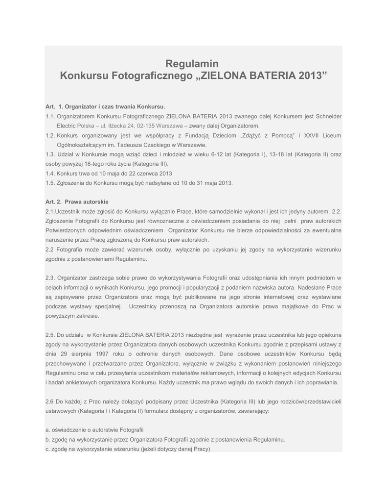 Regulamin Konkursu Fotograficznego „ZIELONA BATERIA 2013” Art. 1. Organizator i czas trwania Konkursu. 1.1. Organizatorem Konkursu Fotograficznego ZIELONA BATERIA 2013 zwanego dalej Konkursem jest Schneider Electric Polska – ul. Iłżecka 24, 02-135 Warszawa – zwany dalej Organizatorem. 1.2. Konkurs organizowany jest we współpracy z Fundacją Dzieciom „Zdążyć z Pomocą” i XXVII Liceum Ogólnokształcącym im. Tadeusza Czackiego w Warszawie. 1.3. Udział w Konkursie mogą wziąć dzieci i młodzież w wieku 6-12 lat (Kategoria I), 13-18 lat (Kategoria II) oraz osoby powyżej 18-tego roku życia (Kategoria III). 1.4. Konkurs trwa od 10 maja do 22 czerwca 2013 1.5. Zgłoszenia do Konkursu mogą być nadsyłane od 10 do 31 maja 2013. Art. 2. Prawa autorskie 2.1.Uczestnik może zgłosić do Konkursu wyłącznie Prace, które samodzielnie wykonał i jest ich jedyny autorem. 2.2. Zgłoszenie Fotografii do Konkursu jest równoznaczne z oświadczeniem posiadania do niej pełni praw autorskich Potwierdzonych odpowiednim oświadczeniem Organizator Konkursu nie bierze odpowiedzialności za ewentualne naruszenie przez Pracę zgłoszoną do Konkursu praw autorskich. 2.2 Fotografia może zawierać wizerunek osoby, wyłącznie po uzyskaniu jej zgody na wykorzystanie wizerunku zgodnie z postanowieniami Regulaminu. 2.3. Organizator zastrzega sobie prawo do wykorzystywania Fotografii oraz udostępniania ich innym podmiotom w celach informacji o wynikach Konkursu, jego promocji i popularyzacji z podaniem nazwiska autora. Nadesłane Prace są zapisywane przez Organizatora oraz mogą być publikowane na jego stronie internetowej oraz wystawiane podczas wystawy specjalnej. Uczestnicy przenoszą na Organizatora autorskie prawa majątkowe do Prac w powyższym zakresie. 2.5. Do udziału w Konkursie ZIELONA BATERIA 2013 niezbędne jest wyrażenie przez uczestnika lub jego opiekuna zgody na wykorzystanie przez Organizatora danych osobowych uczestnika Konkursu zgodnie z przepisami ustawy z dnia 29 sierpnia 1997 roku o ochronie danych osobowych. Dane osobowe uczestników Konkursu będą przechowywane i przetwarzane przez Organizatora, wyłącznie w związku z wykonaniem postanowień niniejszego Regulaminu oraz w celu przesyłania uczestnikom materiałów reklamowych, informacji o kolejnych edycjach Konkursu i badań ankietowych organizatora Konkursu. Każdy uczestnik ma prawo wglądu do swoich danych i ich poprawiania. 2.6 Do każdej z Prac należy dołączyć podpisany przez Uczestnika (Kategoria III) lub jego rodziców/przedstawicieli ustawowych (Kategoria I i Kategoria II) formularz dostępny u organizatorów, zawierający: a. oświadczenie o autorstwie Fotografii b. zgodę na wykorzystanie przez Organizatora Fotografii zgodnie z postanowienia Regulaminu. c. zgodę na wykorzystanie wizerunku (jeżeli dotyczy danej Pracy) d. zgodę na przetwarzanie danych osobowych. e. akceptację postanowień Regulaminu. Art. 3. Temat Konkursu 3.1. Przedmiotem Konkursu są prace fotograficzne, zwane Pracami lub Fotografiami, wykonane dowolną techniką na temat: - ZIELONA BATERIA – zdjęcia wykonane dowolnym urządzeniem (aparat fotograficzny, telefon komórkowy, tablet oraz inne tu niewymienione a umożliwiające wykonywanie zdjęć) przedstawiające krajobraz, panoramę, scenę z życia miejskiego, portret i nawiązujące tematyką do haseł: planeta Ziemia, energia, ekologia, zielona energia, energooszczędność, pozytywne emocje, natura, życie ; odpowiadające na pytanie „Co ładuje Twoje baterie? Pokaż nam miejsce, które wywołuje w Tobie pozytywne emocje!” Art. 4. Zgłaszanie Prac . 4.1. Fotografie na Konkurs zgłaszane są drogą elektroniczną poprzez wysłanie maila w terminie od dnia 10 maja 2013 roku do dnia 31 maja 2013 roku włącznie. Zgłoszenia prac dokonuje się drogą mailową na adres [email protected]. W wiadomości poza zgłaszaną pracą należy podać swoje dane osobowe (imię, nazwisko, adres korespondencyjny? Mailowy?, numer telefonu) oraz opcjonalnie tytuł i opis zdjęcia oraz załączyć podpisany formularz, o którym mowa w pkt. 2.6 Regulaminu.. Prace nie nadesłane w wyznaczonym terminie lub nie zawierające wymaganych danych lub oświadczeń nie wezmą udziału w Konkursie,. 4.2. Wymogi techniczne dotyczące wszystkich zgłoszonych Prac są następujące: - rozdzielczość: Fotografie wykonane w rozdzielczości min. 4 mega piksele ( dotyczy Prac wykonanych aparatami fotograficznymi, prace z innych urządzeń elektronicznych mogą być mniejszej rozdzielczości), - RGB lub grayscale, - dopuszczalne formaty Fotografii: JPG z maksymalną jakością (bez kompresji), - dopuszczalna rozdzielczość fotografii to min. 4 MP. 4.3. Praca zgłoszona w Konkursie nie może nosić znamion poważnych edycji wykonanych komputerowo. 4.4. Każdy uczestnik ma prawo zgłosić maksymalnie 3 Prace. 4.5. Organizator zastrzega sobie prawo wykluczenia Fotografii z Konkursu, jeśli: a) Praca będzie zawierała treści niezgodne z prawem lub dobrymi obyczajami w szczególności nawiązywała do faszyzmu, rasizmu czy też będzie naruszały dobra i godność osób trzecich, b) zajdzie uzasadnione podejrzenie co do autorstwa Pracy czy też naruszenia przez danego uczestnika Regulaminu, lub niespełnienia przez niego warunków uczestnictwa w Konkursie. Art. 5. Jury i wyłanianie zwycięskich Fotografii 5.1. Wyboru zwycięskich Prac dokonuje Jury przyznając I, II i III miejsce w każdej Kategorii 5.2. Jury złożone z przynajmniej pięciu członków tworzą osoby wybrane przez Organizatora. W skład wchodzą przedstawiciele Organizatora, w/w Fundacji oraz Liceum im. Tadeusza Czackiego. 5.3. Podczas obrad etapu centralnego Jury dokonuje oceny zdjęć, które zostały nadesłane. Decyzja o I, II i III miejscu w ramach każdej Kategorii wiekowej zapada w czasie obrad. Jury może podjąć decyzję o nieprzyznaniu miejsca w ramach danej Kategorii. 5.4. Ogłoszenie wyników nastąpi 22 czerwca podczas Koncert