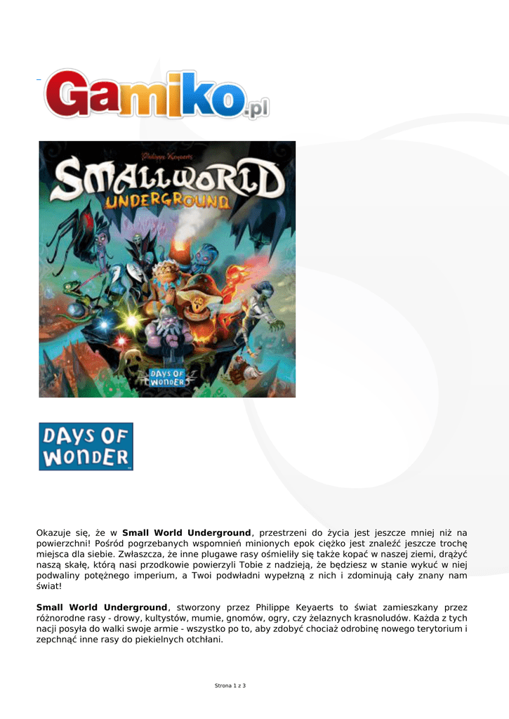 Okazuje się, że w Small World Underground, przestrzeni do życia jest jeszcze mniej niż na powierzchni! Pośród pogrzebanych wspomnień minionych epok ciężko jest znaleźć jeszcze trochę miejsca dla siebie. Zwłaszcza, że inne plugawe rasy ośmieliły się także kopać w naszej ziemi, drążyć naszą skałę, którą nasi przodkowie powierzyli Tobie z nadzieją, że będziesz w stanie wykuć w niej podwaliny potężnego imperium, a Twoi podwładni wypełzną z nich i zdominują cały znany nam świat! Small World Underground, stworzony przez Philippe Keyaerts to świat zamieszkany przez różnorodne rasy - drowy, kultystów, mumie, gnomów, ogry, czy żelaznych krasnoludów. Każda z tych nacji posyła do walki swoje armie - wszystko po to, aby zdobyć chociaż odrobinę nowego terytorium i zepchnąć inne rasy do piekielnych otchłani. Strona 1 z 3 Niestety, cywilizacje w miarę wzrostu zatracają swoją dynamikę i możliwości rozwoju, dopada je stagnacja a w końcu upadek. Kluczem do zwycięstwa w Small World Underground jest nie tylko wybór spośród 15 ras i 21 specjalnych mocy; najważniejsze to przewidzieć upadek i w odpowiednim momencie wycofać się ze wsparcia dla danej cywilizacji, udzielając swojego poparcia nowej sile, która rozwinie się na gruzach tych, którzy przeminęli. Co znajdziesz w Small World: przepiękne ilustracje utrzymane w bajecznym klimacie fantasy najwyższą jakość wydania, będącą wizytówką Days of Wonder czytelne, przystępnie wyjaśnione i zilustrowane zasady gry warianty rozgrywki dopasowane do 2, 3, 4 lub 5 graczy (zmienna wielkość planszy) 21 specjalnych mocy, co w kombinacji z 15 rasami daje 315 możliwości tworzenia własnej cywilizacji dynamiczną, płynną rozgrywkę bez przestojów i długiego oczekiwania na swoją kolejkę losowy dobór nowych cywilizacji, które spowoduje, że każda partia będzie inna od poprzedniej Cywilizacje pojawiające się w grze składają się zawsze z dwóch elementów - rasy (np. Drowy) i zdolności specjalnej (np. Mistyczne). Zarówno zdolności jak i rasy są bardzo zróżnicowane, a w grze możesz pokierować m.in. tak egzotycznymi cywilizacjami jak Kamienne Mumie, Wampiryczne Gnomy, Nieśmiertelne Licze czy Znikające Ogniki! Zawartość pudełka: 4 mapy zawarte na dwóch obustronnych planszach 5 kart pomocy, po jednej na każdego gracza i jedna karta z podsumowaniem tury 15 kafelków ras z specjalnymi mocami 179 żetonów ras 25 żetonów gór czarnych, popularnych miejsc, relikwi oraz wulkanu 24 żetony specjalne (w tym wielki przedwieczny, duch Tomb Raidera, Balrog itp. 21 żetonów specjalnych mocy 106 żetonów punktów zwycięstwa kostka posiłków znacznik rundy zasady gry W grze występują elementy w języku angielskim, ale nie są one istotne dla gry (są to np. nazwy kart czy obszarów na planszy) - wszystkich niezbędnych do gry informacji dostarcza polska instrukcja. Wiek 8+ Liczba graczy Strona 2 z 3 2-5 graczy Czas gry ok. 60 minut Instrukcja polska Wydanie angielskie Wydawca Days of Wonder Projektant Philippe Keyaerts Strona 3 z 3