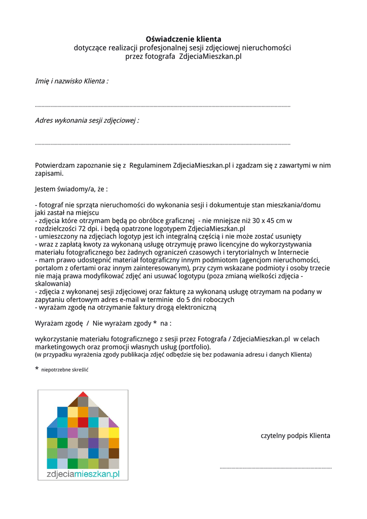Oświadczenie klienta dotyczące realizacji profesjonalnej sesji zdjęciowej nieruchomości przez fotografa ZdjeciaMieszkan.pl Imię i nazwisko Klienta : ….........…................................................................................................................................................................................... Adres wykonania sesji zdjęciowej : ….........…................................................................................................................................................................................... Potwierdzam zapoznanie się z Regulaminem ZdjeciaMieszkan.pl i zgadzam się z zawartymi w nim zapisami. Jestem świadomy/a, że : - fotograf nie sprząta nieruchomości do wykonania sesji i dokumentuje stan mieszkania/domu jaki zastał na miejscu - zdjęcia które otrzymam będą po obróbce graficznej - nie mniejsze niż 30 x 45 cm w rozdzielczości 72 dpi. i będą opatrzone logotypem ZdjeciaMieszkan.pl - umieszczony na zdjęciach logotyp jest ich integralną częścią i nie może zostać usunięty - wraz z zapłatą kwoty za wykonaną usługę otrzymuję prawo licencyjne do wykorzystywania materiału fotograficznego bez żadnych ograniczeń czasowych i terytorialnych w Internecie - mam prawo udostępnić materiał fotograficzny innym podmiotom (agencjom nieruchomości, portalom z ofertami oraz innym zainteresowanym), przy czym wskazane podmioty i osoby trzecie nie mają prawa modyfikować zdjęć ani usuwać logotypu (poza zmianą wielkości zdjęcia skalowania) - zdjęcia z wykonanej sesji zdjęciowej oraz fakturę za wykonaną usługę otrzymam na podany w zapytaniu ofertowym adres e-mail w terminie do 5 dni roboczych - wyrażam zgodę na otrzymanie faktury drogą elektroniczną Wyrażam zgodę / Nie wyrażam zgody * na : wykorzystanie materiału fotograficznego z sesji przez Fotografa / ZdjeciaMieszkan.pl w celach marketingowych oraz promocji własnych usług (portfolio). (w przypadku wyrażenia zgody publikacja zdjęć odbędzie się bez podawania adresu i danych Klienta) * niepotrzebne skreślić czytelny podpis Klienta …..................................................................................