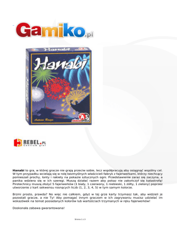 Hanabi to gra, w której gracze nie grają przeciw sobie, lecz współpracują aby osiągnąć wspólny cel. W tym przypadku wcielają się w rolę bezmyślnych właścicieli fabryk z fajerwerkami, którzy niechcący pomieszali prochy, lonty i rakiety na pokazie sztucznych ogni. Przedstawienie zaraz się zaczyna, a panika wdziera się w ich szeregi. Muszą działać razem aby pokaz nie zakończył się katastrofą! Pirotechnicy muszą złożyć 5 fajerwerków (1 biały, 1 czerwony, 1 niebieski, 1 żółty, 1 zielony) poprzez utworzenie z kart sekwensu rosnących liczb (1, 2, 3, 4, 5) w tym samym kolorze. Brzmi prosto, prawda? No więc nie całkiem, gdyż w tej grze karty trzymasz tak, aby widzieli je pozostali gracze, a nie Ty! Aby pomagać innym graczom w ich zagrywaniu musisz udzielać im wskazówek na temat posiadanych kolorów lub wartościach trzymanych w ręku fajerwerków! Doskonała zabawa gwarantowana! Strona 1 z 3 Hanabi zdobyło prestiżową nagrodę Spiel des Jahres 2013. Wydanie zagraniczne z polską instrukcją ZAWARTOŚĆ OPAKOWANIA: 55 kart Hanabi (fajerwerków) 5 kart zasad 8 niebieskich znaczników 3 czerwone znaczniki Wiek 8+ Liczba graczy 2-5 graczy Czas gry ok. 25 minut Instrukcja polska Projektant Antoine Bauza Wydanie zagraniczne Strona 2 z 3 Strona 3 z 3