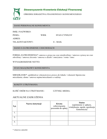 Stowarzyszenie Krzewienia Edukacji Finansowej OŚRODEK DORADZTWA FINANSOWEGO I KONSUMENCKIEGO DANE PERSONALNE KONSUMENTA IMIĘ i NAZWISKO: PESEL: WIEK STAN CYWILNY ADRES: TEL.KONTAKTOWY: E - MAIL DANE O ZATRUDNIENIU I DOCHODACH FORMA ZATRUDNIENIA*: umowa o pracę na czas nieokreślony / umowa o pracę na czas określony / umowa zlecenia / umowa o dzieło / emerytura / renta / inne: WYNAGRODZENIE NETTO: STAN MAJĄTKOWY KONSUMENTA MIESZKANIE*: spółdzielcze własnościowe prawo do lokalu / własność hipoteczna mieszkania, domu / umowa najmu/mieszkanie u rodziny. KOSZTY UTRZYMANIA ILOŚĆ OSÓB NA UTRZYMANIU: CZYNSZ, MEDIA: AKTUALNE ZADŁUŻENIA Nazwa instytucji Lp. 1. 2. 3. * właściwe zakreślić Status Kwota (opóźnienie w spłacie, zobowiązania windykacja, ugoda, egzekucja pozostała do spłaty komornicza) 4. 5. 6. 7. 8. 9. 10. Z jakiego źródła konsument dowiedział się o działalności ODFiK: Oświadczam, że wszystkie przedstawione powyżej informacje i dane są zgodne z stanem faktycznym i w pełni oddają stan mojego zadłużenia. „Wyrażam zgodę na przetwarzanie moich danych osobowych dla celów korespondencyjnych z Ośrodkiem Doradztwa Finansowego i Konsumenckiego, oraz wewnętrznej sprawozdawczości, zgodnie z Ustawą z dn. 29.08.1997 o ochronie danych osobowych (tekst jednolity na podstawie Dz.U. z 2015 r. poz.2135, 2281, z 2016 r. poz.195, 677). ………………………………………. / miejscowość i data / * właściwe zakreślić ……………………………………….. / czytelny podpis składającego formularz /