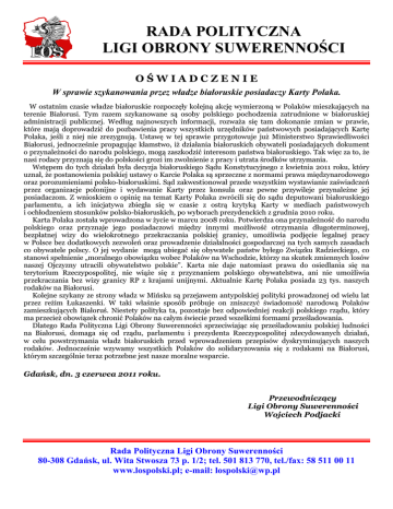 RADA POLITYCZNA LIGI OBRONY SUWERENNOŚCI OŚWIADCZENIE W sprawie szykanowania przez władze białoruskie posiadaczy Karty Polaka. W ostatnim czasie władze białoruskie rozpoczęły kolejną akcję wymierzoną w Polaków mieszkających na terenie Białorusi. Tym razem szykanowane są osoby polskiego pochodzenia zatrudnione w białoruskiej administracji publicznej. Według najnowszych informacji, rozważa się tam dokonanie zmian w prawie, które mają doprowadzić do pozbawienia pracy wszystkich urzędników państwowych posiadających Kartę Polaka, jeśli z niej nie zrezygnują. Ustawę w tej sprawie przygotowuje już Ministerstwo Sprawiedliwości Białorusi, jednocześnie propagując kłamstwo, iż działania białoruskich obywateli posiadających dokument o przynależności do narodu polskiego, mogą zaszkodzić interesom państwa białoruskiego. Tak więc za to, że nasi rodacy przyznają się do polskości grozi im zwolnienie z pracy i utrata środków utrzymania. Wstępem do tych działań była decyzja białoruskiego Sądu Konstytucyjnego z kwietnia 2011 roku, który uznał, że postanowienia polskiej ustawy o Karcie Polaka są sprzeczne z normami prawa międzynarodowego oraz porozumieniami polsko-białoruskimi. Sąd zakwestionował przede wszystkim wystawianie zaświadczeń przez organizacje polonijne i wydawanie Karty przez konsula oraz pewne przywileje przynależne jej posiadaczom. Z wnioskiem o opinię na temat Karty Polaka zwrócili się do sądu deputowani białoruskiego parlamentu, a ich inicjatywa zbiegła się w czasie z ostrą krytyką Karty w mediach państwowych i ochłodzeniem stosunków polsko-białoruskich, po wyborach prezydenckich z grudnia 2010 roku. Karta Polaka została wprowadzona w życie w marcu 2008 roku. Potwierdza ona przynależność do narodu polskiego oraz przyznaje jego posiadaczowi między innymi możliwość otrzymania długoterminowej, bezpłatnej wizy do wielokrotnego przekraczania polskiej granicy, umożliwia podjęcie legalnej pracy w Polsce bez dodatkowych zezwoleń oraz prowadzenie działalności gospodarczej na tych samych zasadach co obywatele polscy. O jej wydanie mogą ubiegać się obywatele państw byłego Związku Radzieckiego, co stanowi spełnienie „moralnego obowiązku wobec Polaków na Wschodzie, którzy na skutek zmiennych losów naszej Ojczyzny utracili obywatelstwo polskie”. Karta nie daje natomiast prawa do osiedlania się na terytorium Rzeczypospolitej, nie wiąże się z przyznaniem polskiego obywatelstwa, ani nie umożliwia przekraczania bez wizy granicy RP z krajami unijnymi. Aktualnie Kartę Polaka posiada 23 tys. naszych rodaków na Białorusi. Kolejne szykany ze strony władz w Mińsku są przejawem antypolskiej polityki prowadzonej od wielu lat przez reżim Łukaszenki. W taki właśnie sposób próbuje on zniszczyć świadomość narodową Polaków zamieszkujących Białoruś. Niestety polityka ta, pozostaje bez odpowiedniej reakcji polskiego rządu, który ma przecież obowiązek chronić Polaków na całym świecie przed wszelkimi formami prześladowania. Dlatego Rada Polityczna Ligi Obrony Suwerenności sprzeciwiając się prześladowaniu polskiej ludności na Białorusi, domaga się od rządu, parlamentu i prezydenta Rzeczypospolitej zdecydowanych działań, w celu powstrzymania władz białoruskich przed wprowadzeniem przepisów dyskryminujących naszych rodaków. Jednocześnie wzywamy wszystkich Polaków do solidaryzowania się z rodakami na Białorusi, którym szczególnie teraz potrzebne jest nasze moralne wsparcie. Gdańsk, dn. 3 czerwca 2011 roku. Przewodniczący Ligi Obrony Suwerenności Wojciech Podjacki Rada Polityczna Ligi Obrony Suwerenności 80-308 Gdańsk, ul. Wita Stwosza 73 p. 1/2; tel. 501 813 770, tel./fax: 58 511 00 11 www.lospolski.pl; e-mail: [email protected]