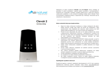 Dziękujemy za zakup nawilżacza Clevair2 marki Air Naturel. Mamy nadzieję, że przyniesie Ci pełną satysfakcję i poprawi jakość powietrza w pomieszczeniach. Podobnie jak w przypadku wszystkich urządzeń elektrycznych, ważne jest właściwe użytkowanie urządzenia, w celu uniknięcia wszelkiego rodzaju szkód i obrażeń. Przed uruchomieniem urządzenia prosimy o zapoznanie się z instrukcją i stosowanie się do wskazówek w niej zawartych. Ważne wskazówki dotyczące bezpieczeństwa Nigdy nie należy umieszczać nawilżacza w miejscu dostępnym dla dzieci. Należy zwracać uwagę, żeby dzieci nie bawiły się urządzeniem i jego opakowaniem. Gdy urządzenie jest włączone, dzieci powinny być pod opieką rodziców/opiekunów i nie wolno im bawić się urządzeniem. Produkt nie jest odpowiedni dla osób (w tym dzieci poniżej 8 roku życia) o ograniczonych zdolnościach fizycznych, upośledzonych umysłowo lub fizycznie oraz osób, które nie posiadają wiedzy na temat produktu, chyba że są pod nadzorem lub otrzymały wcześniej instrukcje od osób odpowiedzialny za ich bezpieczeństwo. Urządzenie to działa pod napięciem100-240 W. Należy sprawdzić, czy jest to odpowiednie dla instalacji elektrycznej, do której będzie podłączone. Urządzenie powinno być umieszczone na suchej i płaskiej powierzchni. Należy unikać powierzchni łatwopalnych oraz wykonanych na bazie nylonu. Należy unikać umieszczania urządzenia w pobliżu kaloryfera lub innego źródła ciepła. Zawsze należy odłączać urządzenie od zasilania podczas czyszczenia i czynności konserwacyjnych. Aby uniknąć porażenia prądem elektrycznym urządzenia nie należy narażać urządzenia na kontakt z wodą lub wilgotną powierzchnią. W razie uszkodzenia z urządzenia nie należy korzystać. Do urządzenia nie należy wkładać przedmiotów metalowych. Nie należy urządzenia moczyć. Czyścić je należy wilgotną ściereczką, a następnie wysuszyć je dokładnie przed ponownym podłączeniem. Zapobieganie wypadkom domowym Produkt jest zgodny z normami i przepisami obowiązującymi w UE. W celu uzyskania dodatkowych informacji prosimy odwiedzić naszą stronę: www.airnaturel.com Dział obsługi klienta jest dostępny pod adresem e-mail: [email protected] Saho Clevair2 pomaga chronić przed objawami związanymi z nadmiernie wysuszonym powietrzem, dzięki funkcji delikatnej mgiełki. Chroni przed krwawieniem z nosa, przesuszeniem śluzówki, piekącymi oczami, suchą skórą, suchym kaszlem, pragnieniem nocnym. Dla zdrowia i komfortu Air Naturel zaleca relatywny poziom wilgotności między 40% a 60%. Clevair 2 1. 2. 3. 4. 5. 6. 7. 8. 9. 10. 11. 12. 13. 14. Ujście mgiełki Pokrywa górna Uchwyt Zbiornik na wodę Wlot wody Filtr Pokrywa zbiornika Ujście powietrza Cyfrowy panel Igła magnetyczna Kabel z wtyczką Membrana ultradźwiękowa Płyta grzewcza PTC Zbiornik na olejki eteryczne START UWAGA: Przed włączeniem urządzenia do gniazdka z prądem sprawdź, czy Humini jest wyłączony i czy przednie pokrętło jest ustawione na „OFF”. Ustaw nawilżacz na płaskiej powierzchni, co najmniej 60 cm nad podłogą i 10 cm od ściany. Napełnij zbiornik wodą (patrz instrukcje poniżej). Włóż wtyczkę do gniazdka elektrycznego. Włącz urządzenie za pomocą pokrętła z przodu i wybierz pożądany poziom mocy. Clevair2 wyłączy się automatycznie, gdy zbiornik będzie pusty. ZBIORNIK NA WODĘ SPECYFIKACJE Zasilanie 100 – 240 V ~ 50/60 Hz Nawilżanie 330 ml/h (+/_ 30) Waga 2,39 kg Wymiary 353 x 184 x 230 mm (wys. x dł. x gł.) Pojemność zbiornika 5L Pomieszczenie 40 m2 Poziom hałasu 35 db Pobór mocy 110 W Nawilżacz hybrydowy: zimna i ciepła mgiełka (35 / 40C) Elektroniczna kontrola poziomu wilgotności powietrza dzięki cyfrowemu higrostatowi Wbudowana funkcja HygroSmart® i jonizator. Wyjmij zbiornik na wodę (tylna część urządzenia). Obróć zbiornik, odkręć pokrywę (zgodnie ze strzałką „Water” (woda)) i napełnij zbiornik zimną wodą. Nigdy nie używaj gorącej wody, bo możesz spowodować przeciek. Przykręć pokrywę zgodnie ze wskazówkami zegara. Włóż zbiornik z powrotem do urządzenia. KONTROLKI urządzenia i/lub umieść nawilżacz w pobliżu źródła ciepła, na wysokości ponad jednego metra (np. na szafce). Ciepła mgiełka Funkcje Higrometr Zazwyczaj wyświetlacz cyfrowy pokazuje obecny poziom wilgotności powietrza w pomieszczeniu. Pożądany poziom nawilżenia można wskazać za pomocą przycisku na panelu kontrolnym lub na pilocie. Każde naciśnięcie tego przycisku zwiększa natężenie mgiełki o 5%. Jeśli pożądany poziom sięga 75%, kolejne naciśnięcie przycisku spowoduje stałe nawilżanie. (W Clevair2 wilgotność reguluje się na poziomie pomiędzy 30 a 75%.) HygroSmart® To wyjątkowa technologia opatentowana przez Air Naturel. Funckja włącza się, gdy poziom wilgotności spada poniżej 48%, a wyłącza się, gdy znajdzie się na poziomie 53%. Funkcja HygroSmart® pozwala na automatyczną regulacje wilgotności. Siła nawilżania Clevair2 ma trzy poziomy natężenia mgiełki (Low (niski), Medium (średni), High (wysoki)). Pop naciśnięciu przycisku Mgiełka ilość mgiełki się zwiększa. UWAGA: jeśli urządzenie pracuje na poziomie maksymalnym może się zdarzyć, że para wodna skondensuje się wokół urządzenia, tworząc mokrą warstwę, co może zostać błędnie uznane za przeciek. Aby uniknąć tego zjawiska zredukuj poziom mocy Funkcja ta nagrzewa wodę do 40/45C, a następnie schładza ją tak, by uniknąć ryzyka poparzenia. W ten sposób mgiełka jest lepiej rozprowadzana po pomieszczeniu i jest delikatniejsza. Jeśli funkcja ta jest wyłączona, zamiast ciepłej mgiełki jest zimna. UWAGA: nie korzystaj z funkcji ciepłej mgiełki dłużej niż przez 6 godzin, bo możesz uszkodzić urządzenie. Jonizator Jony mają inne własności, w zależności od tego, czy są dodatnie, czy ujemne. Współcześnie wiemy doskonale, 